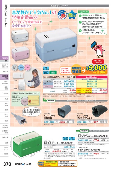 ¥14,000税抜価格税込価格期間限定特価¥9,090¥9,999税抜価格税込価格¥18,000税抜価格¥19,800税込価格通常価格¥18,080¥19,888●寸法/260幅)×146(奥)×172(高)mm●質量/約1.9kg●集じん容量/200g●消費電力/100V-約310W●コード長/2m●付属品/外袋、スポンジフィルター●包装数:1/8取り替え用黒板ふきクリーナーKC-100用取り替え品※布製外袋、スポンジフィルターの水洗い後は完全に乾かしてからご使用ください。[ウチダ]KC-100用布製外袋お申込番号8-631-2230M価税抜¥700税抜価格¥595税込価格¥654単位1個[ウチダ]KC-100用スポンジフィルターお申込番号8-631-2231M価税抜¥750税抜価格¥637税込価格¥700単位1個●包装数:1/100●包装数:1/100取り替え用MC-330EP用取り替え品[パナソニック]スポンジフィルターMC-330EP用お申込番号8-631-2549M価税抜¥800税抜価格¥784税込価格¥862単位1個商品種別型式/AMC06K-Y40●包装数:1※旧タイプのMC-300、MC-330Eでも使用できます。[パナソニック]布製外袋MC-330EP用お申込番号8-631-2548M価税抜¥700税抜価格¥684税込価格¥752単位1個商品種別型式/AMC99K-550●包装数:1※旧タイプのMC-300、MC-330Eでも使用できます。集じん容量約200g質量約2.1kg[パナソニック]黒板ふきクリーナーMC-330EP商品種別型式/MC-330EPお申込番号8-631-0149M価税抜¥15,000税抜価格¥13,070税込価格¥14,377単位1台●寸法/約265(幅)×155(奥)×175(高)mm●質量/約2.1kg●集じん容量/約200g(布袋式)●消費電力/約320W●コード長/2m●付属品/スポンジフィルター、外袋●包装数:1通常価格の期間2026年7月17日午後5時〜2027年2月26日午後5時期間限定特価の期間2026年7月17日午後5時[ウチダ]黒板ふきクリーナーKC-100商品種別ペールグレーブルーピンク型式/KC-100型式/KC-100B型式/KC-100PM価税抜1台8-631-40728-631-40738-631-4074通常価格まとめ買いパックまめパッ1組(2台入)※1組単位申込。8-631-41398-631-41408-631-4141Point123静音設計により、耳障りな機械音を極力抑え込みました。吸い込み口にチョークの粉が詰まらない特殊な構造で、抜群の吸引力を維持します。上部に溝がなく、メンテナンスが、しやすい。KC-100Bブルー1組(2台入)1台あたり¥9,000税抜9,900税込¥黒板ふきクリーナー音が静かで人気No.1の学校定番品!!トラッキング対策仕様で安全性を向上!mm0622026年7月17日午後5時質量約1.9kg集じん容量200gmm146KC-100Pピンクペールグレーブルーピンク172mmKC-100ペールグレーTopSide学級名などが書けるシールが付いています!油性ペンで学級名などを書いてご利用いただけます。耐トラッキング性能に優れた樹脂を使用したプラグ。Vol.20mm562約約155mm約175mm道徳道徳カードカゲーム図書室図書室黒板ふきクリーナー学習支援用品理科発表ボード・発表ボード・ホワイトボードタイマータイマー黒板関連用品SDGs・SDG総合的な学習国語・国語書写書写外国語外国語社会社会算数・算数数学数学音楽音楽図工・図工美術美術技術技術家庭科・家庭科・学校給食学校給食保健体育・球技球技特別支援特別支