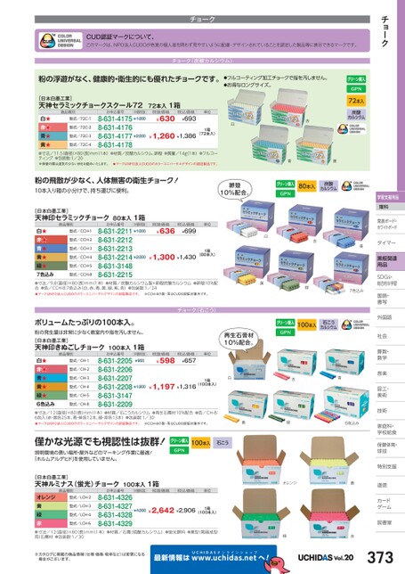 チョーク学習支援用品理科発表ボード・発表ボード・ホワイトボードトタイマータイマー黒板関連用品SDGs・DGs・総合的な学習習国語・語・書写写外国語国社会社会算数・数・数学学音楽楽図工・工・美術術技術術家庭科・家庭科・学校給食校食保健体育・体球技技特別支援別道徳徳カードゲームム図書室書僅かな光源でも視認性は抜群!照明環境の悪い場所・屋外などのマーキング作業に最適!「ホルムアルデヒド」を使用していません。100本入石こう[日本白墨工業]天神ルミナス(蛍光)チョーク100本入1箱商品種別お申込番号M価税抜税抜価格税込価格単位型式/LCH-3型式/LCH-2オレンジ黄緑赤●寸法/12(直径)×80(長)mm(1本)●材質/石膏(硫酸カルシウム)●蛍光顔料●廃型(陶器成型用)石膏材●包装数:1/308-631-43268-631-43278-631-43288-631-4329¥4,000¥2,642¥2,906型式/LCH-4型式/LCH-6(100本入)1箱※カタログに掲載の商品情報(仕様・価格・税率など)は変更になる場合がございます。最新情報はUCHIDASww.uchidas.netwオレンジ緑へ!黄赤Vol.20373チョークCUD認証マークについて。このマークは、NPO法人CUDOが色覚の個人差を問わず見やすいように配慮・デザインされていることを認定した製品等に表示できるマークです。チョーク(炭酸カルシウム)粉の浮遊がなく、健康的・衛生的にも優れたチョークです。●フルコーティング加工チョークで指を汚しません。●お得なロングサイズ。白赤72本入炭酸カルシウム[日本白墨工業]天神セラミックチョークスクール7272本入1箱商品種別お申込番号M価税抜税抜価格¥630型式/72C-2型式/72C-1白★赤★青★黄★●寸法/11.5(直径)×80(長)mm(1本)●材質/炭酸カルシウム、卵殻●質量/14g1本)●フルコーティング●包装数:1/20※保管の際は湿気の少ない所をお勧めいたします。★マークはNPO法人CUDOのカラーユニバーサルデザインの認証製品です。8-631-4175¥1,0008-631-41768-631-41778-631-4178¥1,260¥1,386型式/72C-3型式/72C-4(72本入)¥2,0001箱税込価格¥693単位粉の飛散が少なく、人体無害の衛生チョーク!10本入り箱の小分けで、持ち運びに便利。卵殻10%配合。[日本白墨工業]天神印セラミックチョーク80本入1箱税込価格¥699単位商品種別お申込番号M価税抜税抜価格¥636型式/CCH-3型式/CCH-2型式/CCH-1白★赤★青★黄★緑★7色込み●寸法/9.8(直径)×80(長)mm(1本)●材質/炭酸カルシウム製+卵殻炭酸カルシウム●卵殻10%配合●色/CCH-8:7色込み(白、赤、青、黄、緑、紫、茶)●包装数:1/24★マークはNPO法人CUDOのカラーユニバーサルデザインの認証製品です。※CCH-8の紫・茶はCUDO認証対象外です。8-631-2211¥1,0008-631-22128-631-22138-631-22148-631-31488-631-2215¥1,300¥1,430型式/CCH-4型式/CCH-5型式/CCH-8(80本入)¥2,0001箱チョーク(石こう)再生石膏材10%配合。ボリュームたっぷりの100本入。粉の発生量は非常に少なく教室内や指を汚しません。[日本白墨工業]天神印きぬごしチョーク100本入1箱M価税抜¥950税込価格¥657単位商品種別お申込番号税抜価格¥598型式/CH-3型式/CH-2型式/CH-1白★赤★青★黄★緑★6色込み●寸法/12(直径)×80(長)mm(1本)●材質/石こうカルシウム●再生石膏材10%配合●色/CH-8:6色入(赤・黄各25本、青・紫各12本、緑・茶各13本)●包装数:1/30★マークはNPO法人CUDOのカラーユニバーサルデザインの認証製品です。※CCH-8の紫・茶はCUDO認証対象外です。8-631-22058-631-22068-631-22078-631-22088-631-31478-631-2209¥1,197¥1,316(100本入)型式/CH-8型式/CH-4型式/CH-5¥1,9001箱青黄80本入炭酸カルシウム白黄赤青緑7色込み100本入石こうカルシウム白赤青黄緑6色込み