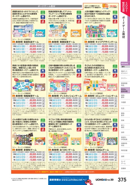 SDGs・総合的な学習ボードゲーム教材学習支援用品理科発表ボード・発表ボード・ホワイトボードトタイマータイマー黒板関連黒板関連用品用品SDGs・総合的な学習国語・語・書写写外国語国社会社会算数・数・数学学音楽楽図工・工・美術術技術術家庭科・家庭科・学校給食校食保健体育・体球技技特別支援別道徳徳カードゲームム図書室書ボードゲーム教材このページに掲載されている商品は全てメーカー直送品です。沖縄・離島はサービス対象外資産形成のきっかけづくりとして、投資を学ぶことができる教育用ボードゲーム教材です。6種類の金融商品の中で、今後利益が出ると予想する先を選んで投資することで、資産の増減を体験できます。100分4人15歳以上飲食店経営を通してアントレプレナーシップを育む教育用ボードゲーム教材です。和食・洋食・中華・ファストフード・スイーツの5つのジャンルを選んで、本来の起業と同じく事業計画からスタート。60分×23〜5人12歳以上人気の職業15種をピックアップ!自分が目指すべき具体的な進路がわかります。「いつまでに何をすべきか」「今、何をすべきか」を逆算思考で体験できる教育用ボードゲーム教材です。60分×24〜5人12歳以上[イー・ラーニング研究所]教育用!資産形成ゲーム税込価格単位商品種別お申込番号M価税抜税抜価格10箱8-613-1200オープン¥90,000¥99,0008-613-1201オープン¥55,000¥60,5005箱8-613-1202オープン¥15,000¥16,5001箱●寸法(パッケージ)270(幅)×195(奥行)×28(高さ)mm〈セット内容〉ボードゲーム一式(投資ボード2枚、カード175枚、シート17枚、サイコロ1個)、説明書(指導者用・プレイヤー用)、資料集、授業進行用スライド・授業スケジュール案・先生用イベント解説資料(データ提供・CD別添)●包装数:11セット(10箱入)1セット(5箱入)1セット(1箱入)[イー・ラーニング研究所]教育用!事業投資ゲーム税込価格単位商品種別お申込番号M価税抜税抜価格10箱8-613-1203オープン¥90,000¥99,0008-613-1204オープン¥55,000¥60,5005箱8-613-1205オープン¥15,000¥16,5001箱●寸法(パッケージ):270幅)×195奥行)×28(高さ)mm〈セット内容〉ボードゲーム一式(事業投資ボード5枚、カード190枚、シート17枚、サイコロ1個)、説明書(指導者用・プレイヤー用)、授業進行用スライド・授業スケジュール案1セット(10箱入)1セット(5箱入)1セット(1箱入)(データ提供・CD別添)●包装数:1[イー・ラーニング研究所]教育用!キャリアデザインゲーム税込価格単位商品種別お申込番号M価税抜税抜価格10箱8-613-1206オープン¥90,000¥99,0008-613-1207オープン¥55,000¥60,5005箱8-613-1208オープン¥15,000¥16,5001箱●寸法(パッケージ):270(幅)×195(奥行)×28(高さ)mm〈セット内容〉ボードゲーム一式(キャリアデザインボード2枚、カード213枚、シート2枚、コイン50枚、コマ5個、サイコロ1個)、説明書(指導者用・プレイヤー用)、授業進行用スライド・授業スケジュール案(データ提供・CD別添)●包装数:11セット(10箱入)1セット(5箱入)1セット(1箱入)探偵になり証言者の発言の真偽を判断し、情報の正しい扱い方を学ぶ教育用ボードゲーム教材です。情報の信ぴょう性や関連性を探りながら、得られた多くの情報を多角的・論理的に検証していく思考を育みます。60分×24〜5人6歳以上立場や価値観の異なる仲間と話し合いながら効率的なディスカッションを学ぶ教育用ボードゲーム教材です。設定されたキャラクターごとに自分の意見を発表し、一人ひとりの意見をグループで統合していく過程を体験できます。60分×24〜5人9歳以上子どもたちの対話能力と自己表現力を高められる教育用ボードゲーム教材です。日常で発生しそうな「場面シート」に対し、自ら取るべき行動を考え、グループ内に自分の意見を説明します。60分×34〜5人9歳以上[イー・ラーニング研究所]教育用!情報推理ゲーム税込価格単位商品種別お申込番号M価税抜税抜価格10箱8-613-1209オープン¥90,000¥99,0008-613-1210オープン¥55,000¥60,5005箱8-613-1211オープン¥15,000¥16,5001箱●寸法(パッケージ)270(幅)×195(奥行)×28(高さ)mm〈セット内容〉ボードゲーム一式(情報推理ボード1枚、カード162枚、シート2枚)、説明書(指導者用・プレイヤー用)、授業進行用スライド・授業スケジュール案(データ提供・CD別添)●包装数:11セット(10箱入)1セット(5箱入)1セット(1箱入)[イー・ラーニング研究所]教育用!ディスカッションゲーム税込価格単位商品種別お申込番号M価税抜税抜価格10箱8-613-1212オープン¥90,000¥99,0008-613-1213オープン¥55,000¥60,5005箱8-613-1214オープン¥15,000¥16,5001箱●寸法(パッケージ):270幅)×195奥行)×28(高さ)mm〈セット内容〉ボードゲーム一式(ディスカッションボード1枚、カード161枚、シート2枚)、説明書(指導者用・プレイヤー用)、授業進行用スライド・授業スケジュール案(データ提供・CD別添)●包装数:11セット(10箱入)1セット(5箱入)1セット(1箱入)[イー・ラーニング研究所]教育用!コミュニケーションゲーム税込価格単位商品種別お申込番号M価税抜税抜価格10箱8-613-1215オープン¥90,000¥99,0008-613-1216オープン¥55,000¥60,5005箱8-613-1217オ