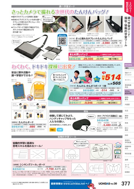 SDGs・総合的な学習調べ学習ボード・福祉・協働的学習ツール学習支援用品理科発表ボード・発表ボード・ホワイトボードトタイマータイマー黒板関連黒板関連用品用品SDGs・総合的な学習国語・語・書写写外国語国社会社会算数・数・数学学音楽楽図工・工・美術術技術術家庭科・家庭科・学校給食校食保健体育・体球技技特別支援別道徳徳カードゲームム図書室書さっとカメラで撮れる次世代のたんけんバッグ!調べ学習ボードタブレットケースを持ち上げるだけでそのまま撮影可能!●屋外でのタブレット活用時に最適!●身体から下げてタブレットを持ち運べ、タブレットを取り出さずにスムーズにカメラ撮影ができる!●クリップボードで屋外で筆記ができ、ポケット付きで筆記具などを持ち運べる!※Chromebook11.6インチのコンバーチブルタイプ(回転式)アウトカメラ付き用折りたたむとコンパクトに!Movie344mm245mm使用例たんけんボードとしても使用できます。大容量のポケット付き。A4サイズも入ります。内側にネームカードが付いています。[コクヨ]さっと撮れるタブレットたんけんバッグ商品種別型式/AGB-TBC116D-1お申込番号8-616-4164M価税抜¥3,000税抜価格¥2,980税込価格¥3,278単位1個●外形寸法/344(幅)×245(奥)×20(高)mm●最大収容タブレットサイズ/304幅)×23(厚)×213(高)mm●質量/0.4kg●Chromebook11.6インチのコンバーチブルタイプ(回転式)アウトカメラ付き用●包装数:1/10※縫製商品のため、寸法・重量には個体差がございます。まとめ買いパック8-616-4165お申込番号税抜価格¥29,500※1組単位申込。税込価格¥32,450単位1組(10個入)わくわく、ドキドキ探検に出発!環境にやさしいオレフィン系樹脂の「新素材」を採用しています。のりや接着剤などが付きにくく、汚れにくい素材です。安全に野外活動や調べ学習ができる!!強力バネクリップ外から見えない名前欄。見つけたことや気づいたことを書いておこう。裏止めゴム表ペン入れ付き〈たてにつかうとき〉〈よこにつかうとき〉〈てにもつとき〉〈かたにかけるとき〉〈リュックとしてつかうとき〉[東栄社]たんけんボードお申込番号M価税抜8-616-4145オープン税抜価格¥880体験して感じてみよう。ハンディキャップをもった人たちの想い。盲目体験用具として使用します。税込価格¥968単位1枚●寸法/350(縦)×250(横)mm、肩掛けひも:1250mm●材質/ターポリンビニール●包装数:16個入抗菌協働的学習ツール1枚税抜¥514税込¥565[ウチダ]たんけん・かんさつボード1枚商品種別型式/MOお申込番号8-616-0001M価税抜¥680税抜価格¥514税込価格¥565単位1枚●寸法/330(縦)×235横)×2.5厚)mm●本体材質/オレフィン系樹脂●えんぴつホルダー、ひも、なまえシール付●挟み込み可能寸法/A4以内●包装数:1まとめ買いパック8-616-4117お申込番号税抜価格¥9,946※1組単位申込。税込価格¥10,940単位1組(20枚入)福祉抗菌加工。[貝印]アイマスク(抗菌加工)6個入お申込番号8-616-4106税抜価格税込価格¥5,480¥6,028M価税抜オープン(6個入)●寸法/110×160×10mm●材質/綿(抗菌加工)●携帯ビニールケース付●包装数:1/20単位1組ゴム製。協働的学習に最適な思考スキルを高めるツール!考えていることを図形にして見える化することができます!くま手チャートXチャートYチャートクラゲチャート使用例(ベン図)[全教図]シンキングツール®・ボードお申込番号8-616-6114M価税抜¥7,700税抜価格税込価格¥7,700¥8,470単位1セット(8枚入)●寸法/515(幅)×364奥)×0.3(厚)mm(シート1枚)●質量/560g●材質/紙製、両面ポリプロピレンラミネート加工●8枚組(表裏に各8ツール)●ホワイトボード用マーカー対応●教師用解説書付●包装数:1/5〈監修:関西大学総合情報学部教授黒上晴夫〉ピラミッドチャートフィッシュボーンバタフライチャート※カタログに掲載の商品情報(仕様・価格・税率など)は変更になる場合がございます。最新情報はUCHIDASww.uchidas.netwへ!Vol.20377