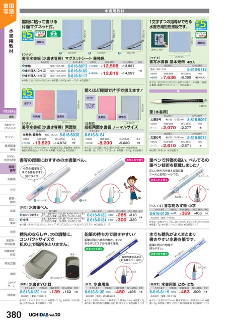 墨発色290mm1文字ずつの指導ができる水書き用短冊黒板です。水書用教材880mm880mm880mm黒板に貼って書ける片面マグネット式。墨発色[ウチダ]書写水書板基本短冊4枚入290mm商品種別型式/SM-111Bお申込番号8-616-6118M価税抜¥9,500税抜価格¥7,636税込価格¥8,399単位1組(4枚入)●寸法/約290×290mm(透明ミミ除く)●材質/表面:水書紙、裏面:マグネットシート●包装数:1[ウチダ]書写水書板(水書き専用)マグネットシート墨発色●580mm●580mm●580mm透明ミミ付きM価税抜¥14,900¥15,200税抜価格¥12,598¥12,816税込価格¥13,857¥14,097単位1枚お申込番号8-616-60738-616-61098-616-6117商品種別型式/SM-23B型式/SM-232B型式/SM-234B無地ます目入(2マス)ます目入(4マス)●●●●外形寸法/880×580mm●質量/840g●ケース付●包装数:1驚くほど軽量で片手で扱えます!筆筆(水書用)商品種別太筆5号軸寸法/15(径)mm太筆6号お申込番号8-616-6097M価税抜オープン税抜価格¥2,070税込価格¥2,277単位1本太筆6号商品種別軸寸法/18(径)mmお申込番号8-616-6074税抜価格M価税抜オープン●材質/羊毛、木●包装数:1¥2,610税込価格¥2,871単位1本605mm吊下げマグネットテープ900mm吊下げ朱発色墨発色朱発色墨発色[ウチダ]書写水書板(水書き専用)両面型600mm商品種別朱発色・墨発色型式/UD-2Cお申込番号8-616-6038[全教図]超軽両面水書板ノーマルサイズ430mmお申込番号8-616-6124M価税抜¥15,700税抜価格¥13,520税込価格¥14,872単位1枚M価税抜¥8,200税抜価格¥8,200税込価格¥9,020単位1枚●外形寸法/900×600mm●赤面ます目、黒面無地●発泡樹脂に特殊紙貼り、アルミ枠●質量/約800g●包装数:1●寸法/430(幅)×605(奥)×9(厚)mm●両面無地●材質/紙、アルミ、スチロール●質量/370g●包装数:1水を入れて使う筆ペンで評価の高い、ぺんてるの筆ペン技術を搭載しました!正しい持ち方を覚える指位置シールと名前シールつき。水を入れて使う約150mm名前シール約13mm指位置シール[ぺんてる]書写用みず筆中字お申込番号8-616-6139M価税抜¥400税抜価格¥369税込価格¥405単位1本商品種別型式/FRG-M●寸法/全長:キャップなし約175mm、キャップあり約190mm●質量/7g●材質/ナイロン繊維●包装数:1/5水でも穂先がよくまとまり書きやすい水書き筆です。鉛筆と同じ六角軸で持ちやすい。水をつけて使うmm155約約17mm[墨運堂]水書用筆とめ・はねお申込番号8-616-6115M価税抜¥500税抜価格¥463税込価格¥509単位1本[呉竹]水書筆ぺん商品種別お申込番号mini中字)中字●●●材質/本体:ポリエチレン、キャップ:ポリプロピレン、ぺん先:ポリエステル●包装数:1/10寸法/全長:キャップなし約140mm、キャップあり約150mm、質量/6g、型式/KG205-140S寸法/全長:キャップなし約170mm、キャップあり約180mm、質量/7g、型式/KG205-110S8-616-61338-616-6134M価税抜¥380¥400税抜価格¥285¥300税込価格単位¥313¥3301本穂先のならしや、水の調整に。コンパクトサイズで机の上で場所をとりません。m75m裏面鉛筆の持ち方で書きやすい!鉛筆と同じ六角形の軸と、コシのあるポリエステル毛材を採用。水をつけて使うmm162約名前が書き込めるお名前スペース付。約14mm滑り止め付きmm43[開明]水書きYO!器お申込番号8-616-6132M価税抜¥150税抜価格¥139税込価格¥152単位1個[呉竹]水書用筆お申込番号8-616-6138M価税抜¥500税抜価格¥450税込価格¥495単位1本書写の授業におすすめの水書筆ぺん。小学生低学年の子でも持ちやすい短寸タイプ。mm511約mm541約約12mm約12mm●mini(中字)●中字商品種別型式/FU2014商品種別型式/JA340-201S商品種別型式/01-1184●寸法/43×13×75mm●質量/10g●材質/ABS樹脂、天然ゴム系●包装数:1/10●寸法/全長約176mm、軸径9mm、穂径6.6mm●質量/7g●材質/軸:ABS軸(抗菌軸)、毛材:ポリエステル●包装数:1/10●寸法/全長:約172mm、軸径:約8mm、穂径:約6mm●質量/6g●材質/穂:ナイロン、軸:ABS樹脂●包装数:1/10国語・書写水書用教材学習支援用品理科発表ボード・発表ボード・ホワイトボードタイマータイマー黒板関連黒板関連用品用品SDGs・SDG総合的な学習国語・書写外国語外国語社会社会算数・算数数学数学音楽音楽図工・図工美術美術技術技術家庭科・家庭科・学校給食学校給食保健体育・球技球技特別支援特別支道徳道徳カードカゲーム図書室図書室380Vol.20