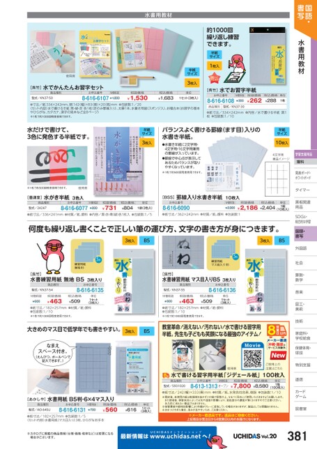 国語・書写水書用教材学習支援用品理科発表ボード・発表ボード・ホワイトボードトタイマータイマー黒板関連黒板関連用品用品SDGs・DGs・総合的な学習習国語・書写外国語国社会社会算数・数・数学学音楽楽図工・工・美術術技術術家庭科・家庭科・学校給食校食保健体育・体球技技特別支援別道徳徳カードゲームム図書室書水書用教材半紙サイズ3枚入税抜価格¥1,530税込価格¥1,683単位1セット(3枚入)使用例[呉竹]水でかんたんお習字セット商品種別型式/KN37-50お申込番号M価税抜8-616-6107¥1,800●寸法/紙:334×242mm、硯:142(幅)×83(奥)×20(高)mm●包装数:1/20〈セット内容〉水で書ける半紙黒・緑・赤各1枚(赤のみ罫線入り)、太筆1本、水書き用硯(スポンジ入)、お稽古本(お習字の基本やひらがな、カタカナ、漢字の見本など全8ページ)※1枚で約1000回程度使用できます。約1000回繰り返し練習できます。半紙サイズ1枚入[呉竹]水でお習字半紙お申込番号8-616-6108M価税抜¥300税抜価格¥262税込価格¥288単位1枚商品種別型式/KN37-30●紙寸法/334×242mm●内容/水で書ける半紙黒1枚●包装数:1/10水だけで書けて、3色に発色する半紙です。半紙サイズ3枚入バランスよく書ける罫線(ます目)入りの水書き半紙。●水書き半紙に2文字用・4文字用・16文字用兼用の罫線が入っています。●罫線で中心点が表示してあるためバランスが取りやすくなっています。※1枚で約500回程度使用できます。半紙サイズ10枚入4文字用商品イメージ※1枚で約500回程度使用できます。使用例[墨運堂]水がき半紙3色入[BSS]罫線入り水書き半紙10枚入商品種別型式/24247お申込番号8-616-6077M価税抜¥800税抜価格¥731税込価格¥804単位1袋(3色入)お申込番号8-616-6090M価税抜¥2,300税抜価格¥2,186税込価格¥2,404単位1組(10枚入)25mm●紙寸法/336×241mm●材質/紙、顔料●内容/黒・赤・青(緑)各1枚入●包装数:1/5●紙寸法/362×242mm●材質/紙、顔料●包装数:1何度も繰り返し書くことで正しい筆の運び方、文字の書き方が身につきます。3枚入B53枚入B5[呉竹]水書練習用紙無地B53枚入り商品種別型式/KN37-54お申込番号8-616-6135[呉竹]水書練習用紙マス目入りB53枚入り商品種別型式/KN37-55お申込番号8-616-6136M価税抜¥600税抜価格¥463税込価格¥509単位1セット(3枚入)M価税抜¥600税抜価格¥463税込価格¥509単位1セット(3枚入)●紙寸法/182×257mm●材質/紙・顔料●包装数:1/10※1枚で約1000回程度使用できます。●紙寸法/182×257mm●材質/紙・顔料●包装数:1/10※1枚で約1000回程度使用できます。大きめのマス目で低学年でも書きやすい。3枚入B5教室革命!消えない!汚れない!水で書ける習字用半紙。先生も子どもも笑顔になる最強のアイテム!Movie沖縄・離島はサービス対象外35mmなまえスペース付き。(えんぴつ、ボールペンで記入できます。)[あかしや]商品種別型式/AO-64SU水書用紙B5判・6×4マス入りお申込番号8-616-6131M価税抜¥700税抜価格¥560税込価格¥616単位1セット(3枚入)●紙寸法/182×257mm●包装数:1/5〈セット内容〉水書用紙(マス目入り)3枚、ひらがなお手本※カタログに掲載の商品情報(仕様・価格・税率など)は変更になる場合がございます。最新情報は使用例ご使用上の注意はこちら水で書ける習字用半紙「ジデェール紙」100枚入商品種別型式/5931020お申込番号M価税抜8-613-1313オープン税抜価格¥7,800税込価格¥8,580単位1箱(100枚入)●紙寸法/242幅)×333奥)mm●材質/紙、水発色性色素、樹脂●包装数:1/10※開封後、未使用の紙は乾燥剤を抜かずこの袋で保管の上、なるべく早めにご使用いただきますようお願いします。また使用後、保管状況によっては光や湿度の影響により、発色部分の濃度が薄くなりますのでご注意ください。永久的に消えない製品ではありません。※保管環境や経時的影響により外観がグレーに変色している場合がありますが、製品としては問題ありません。※水をつけすぎた場合、滲みが出やすいため、ご注意ください。※メーカー直送品です。返品はご容赦ください。上記商品は受注日から8営業日以内のお届けになります。UCHIDASww.uchidas.netwへ!Vol.20381