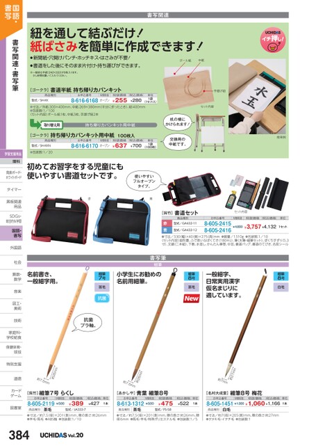 [ゴークラ]持ち帰りカバンキット用中紙100枚入お申込番号8-616-6170M価税抜オープン税抜価格¥637税込価格¥700単位1袋(100枚)交換用の中紙です。使用例商品種別型式/SH-KKN●包装数:1/20[呉竹]書道セットセット内容商品種別お申込番号M価税抜税抜価格税込価格単位型式/GA432-12型式/GA432-11赤青●寸法/330(幅)×40(奥)×275(高)mm●質量/1310g●包装数:1/10〈セット内容〉固形墨、ふで思いなぼくてき(180mL)、筆(太筆・細筆セット)、ぼくちすずり(5.38-605-24158-605-2416¥3,757¥4,132寸)、文鎮(二本組)、下敷、水差し、かんたん筆巻、中皿、書道バッグ、書道のてびき、名前シール¥4,8001セット書写筆細筆小学生にお勧めの名前用細筆。細筆8号茶毛一般細字、日常実用漢字仮名まじりに適しています。細筆8号白毛名前書き、一般細字用。細筆7号茶毛抗菌抗菌プラ軸。約27mm約7mm約26mm約7.5mm約26mm約7.5mm初めてお習字をする児童にも使いやすい書道セットです。赤使いやすいフルオープンタイプ。青書写関連紐を通して結ぶだけ!紙ばさみを簡単に作成できます!●新聞紙・穴開けパンチ・ホッチキス・はさみが不要!●書道をした後にそのまま片付け・持ち運びができます。ボール紙中紙※一般的な半紙(242×333)が6枚入ります。少し時間を置いて入れてください。[ゴークラ]書道半紙持ち帰りカバンキット商品種別型式/SH-KKお申込番号8-616-6168M価税抜オープン税抜価格¥255税込価格¥280単位1袋(1セット入)●寸法/外紙:300×400mm、中紙:269×380mm(半分に折ったとき)、紐:400mm●包装数:1/100〈セット内容〉ボール紙1枚、中紙3枚、手提げ紐2本取り替え用持ち帰りカバンキット用中紙机の横にかけられます!手提げ紐セット内容[呉竹]細筆7号らくしお申込番号8-605-2119M価税抜¥500税抜価格¥389税込価格¥427単位1本[あかしや]青葉細筆8号お申込番号8-613-1312M価税抜¥500税抜価格¥475[名村大成堂]細筆8号梅花税込価格¥522単位1本お申込番号M価税抜税抜価格税込価格8-605-1451¥1,300¥1,060¥1,166単位1本商品種別茶毛型式/JA333-7商品種別型式/PS-58商品種別茶毛白毛●寸法/約7.5(径)×201(長)mm、穂の長さ:約26mm●羊毛・馬毛●ABS軸●包装数:1/10●寸法/約7.5(径)×201(長)mm、穂の長さ:約26mm、穂径:6mm●馬毛・羊毛・特殊ポリエステル毛●包装数:1/5●寸法/約7径)×205長)mm、穂の長さ:約27mm●タヌキ毛・イタチ毛●包装数:1Vol.20国語・書写書写関連・書写筆学習支援用品理科発表ボード・発表ボード・ホワイトボードタイマータイマー黒板関連黒板関連用品用品SDGs・SDG総合的な学習国語・書写外国語外国語社会社会算数・算数数学数学音楽音楽図工・図工美術美術技術技術家庭科・家庭科・学校給食学校給食保健体育・球技球技特別支援特別支道徳道徳カードカゲーム図書室図書室