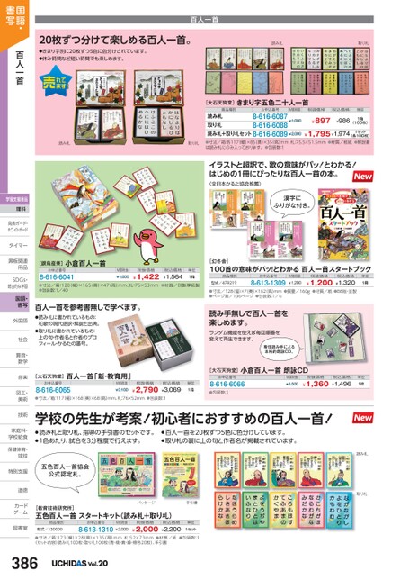 百人一首20枚ずつ分けて楽しめる百人一首。●きまり字別に20枚ずつ5色に色分けされています。●休み時間など短い時間でも楽しめます。読み札取り札読み札取り札小倉百人一首[銀鳥産業]お申込番号8-616-6041M価税抜¥1,800税抜価格¥1,422税込価格¥1,564単位1箱●寸法/箱:120(幅)×165(奥)×47(高)mm、札:75×53mm●材質/別製厚紙製●包装数:1/40百人一首を参考書無しで学べます。●読み札に書かれているもの:和歌の現代語訳・解説と出典。●取り札に書かれているもの:上の句・作者名と作者のプロフィール・かるたの番号。[大石天狗堂]きまり字五色二十人一首商品種別お申込番号M価税抜税抜価格税込価格単位読み札取り札読み札+取り札セット8-616-6089¥2,0008-616-60878-616-6088¥1,000(各100枚)●寸法/箱:各117(幅)×85奧)×35(高)mm、札:75.5×51.5mm●材質/板紙●解説書は読み札にのみ入っております。●包装数:1¥1,795¥1,9741セット¥897¥9861箱(100枚)イラストと超訳で、歌の意味がパッ!とわかる!はじめの1冊にぴったりな百人一首の本。〈全日本かるた協会推薦〉漢字にふりがな付き。[幻冬舎]100首の意味がパッ!とわかる百人一首スタートブック商品種別型式/479219お申込番号8-613-1309M価税抜¥1,200税抜価格¥1,200税込価格¥1,320単位1冊●寸法/128(幅)×7(奥)×182(高)mm●質量/160g●材質/紙●B6版・並製●ページ数/136ページ●包装数:1/6読み手無しで百人一首を楽しめます。ランダム機能を使えば毎回順番を変えて再生できます。専任読み手による本格的朗詠CD。[大石天狗堂]百人一首「新・教育用」お申込番号8-616-6065M価税抜¥3,100税抜価格¥2,790税込価格¥3,069単位1箱●寸法/箱:117幅)×168奥)×68高)mm、札:76×52mm●包装数:1[大石天狗堂]小倉百人一首朗詠CDお申込番号8-616-6066●包装数:1M価税抜¥1,500税抜価格¥1,360税込価格¥1,496単位1枚学校の先生が考案!初心者におすすめの百人一首!●読み札と取り札、指導の手引書のセットです。●1色あたり、試合を3分程度で行えます。●百人一首を20枚ずつ5色に色分けしています。●取り札の裏に上の句と作者名が掲載されています。五色百人一首協会公式認定札。読み札取り札[教育技術研究所]五色百人一首スタートキット(読み札+取り札)商品種別型式/130000お申込番号8-613-1310M価税抜¥2,000税抜価格¥2,000税込価格¥2,200パッケージ手引書単位1セット国語・書写百人一首学習支援用品理科発表ボード・発表ボード・ホワイトボードタイマータイマー黒板関連黒板関連用品用品SDGs・SDG総合的な学習国語・書写外国語外国語社会社会算数・算数数学数学音楽音楽図工・図工美術美術技術技術家庭科・家庭科・学校給食学校給食保健体育・球技球技特別支援特別支道徳道徳カードカゲーム図書室図書室●寸法/箱:173(幅)×28(奥)×135(高)mm、札:52×73mm●材質/紙●包装数:1〈セット内容〉読み札100枚・取り札100枚(青・桃・黄・緑・橙各20枚)、手引書386Vol.20