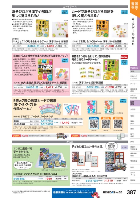 国語・書写カードゲーム・かるた学習支援用品理科発表ボード・発表ボード・ホワイトボードトタイマータイマー黒板関連黒板関連用品用品SDGs・DGs・総合的な学習習国語・書写外国語国社会社会算数・数・数学学音楽楽図工・工・美術術技術術家庭科・家庭科・学校給食校食保健体育・体球技技特別支援別道徳徳カードゲームム図書室書あそびながら漢字や部首が楽しく覚えられる!●部首のカードを組み合わせて漢字をつくるゲームです。●小学校で習う漢字を中心に常用漢字・人名用漢字合わせて176字をつくることができます。○●●●●○●●●●カードゲーム対象年齢6歳以上使用例カードであそびながら熟語を楽しく覚えられる!●小学校1〜3年生で習う漢字から、100字を選定してカードにしました。●あそびながら自然と語彙力を養うことができ、知らない熟語を覚えるきっかけになります。[幻冬舎]「へん」と「つくり」を合わせるゲーム漢字はかせ新装版商品種別型式/479076お申込番号M価税抜8-616-6151¥1,500税抜価格¥1,350税込価格¥1,485単位1箱[幻冬舎]「言葉」をつくるゲーム漢字はかせ熟語編商品種別型式/479194お申込番号M価税抜8-613-1302¥1,500税抜価格¥1,350税込価格¥1,485対象年齢6歳以上使用例単位1箱●寸法/箱:112幅)×32奥)×152高)mm●材質/紙●包装数:1/24〈セット内容〉カード100枚(へんカード、つくりカード各50枚)、説明書●寸法/箱:112(幅)×30奥)×156(高)mm●質量/188g●材質/紙●包装数:1/24〈セット内容〉漢字カード100枚、あそびかたガイド京大のパズル博士が考案!遊びながら漢字力アップ!熟語を2つ組み合わせて、四字熟語を対象年齢6歳以上完成させるカードゲーム!楽しく語彙力・表現力が身につきます。●場にある漢字カードと「部首」「読み」を合わせるか、「熟語」を作って手札を出していき、先に手札がなくなった人が勝ちというルールです。●小学1〜4年生までに習う漢字の中から124字を選定。漢字力、思考力を養います。対象年齢低学年以上税抜価格¥1,620税込価格¥1,782単位1箱[幻冬舎]京大・東田式頭がよくなる漢字ゲーム新装版商品種別型式/499226お申込番号M価税抜8-616-6128¥1,500税抜価格¥1,417税込価格¥1,558単位1箱使用例[幻冬舎]漢字はかせ四字熟語編商品種別型式/479223お申込番号8-613-1308M価税抜¥1,800●寸法/箱:115(幅)×28(奥)×160(高)mm、カード:88×63mm●包装数:1/24〈セット内容〉カード112枚(漢字カード80枚、ダブル漢字カード22枚、部首がえカード10枚)、遊び方ガイド●寸法/112(幅)×33(奥)×155(高)mm●質量/185g●材質/紙●包装数:1/24〈セット内容〉緑の熟語カード(全学年向け)80枚、オレンジの熟語カード(低学年向け)40枚、あそびかたガイド5音と7音の言葉カードで短歌(5・7・5・7・7)を作るゲーム!使用例対象年齢8歳以上[幻冬舎]57577ゴーシチゴーシチシチ商品種別お申込番号M価税抜税抜価格税込価格型式/479040通常版きらきら青春編●寸法/パッケージ:102幅)×28奥)×150高)mm、カード:90×45mm●質量/185g●材質/紙●プレイ人数/3〜8人●プレイ時間/15分〜●包装数:1/24〈セット内容〉5音カード54枚、7音カード54枚、説明書8-612-77358-617-5758¥1,440型式/479130¥1,600¥1,584通常版きらきら青春編Movie遊び方遊び方単位1セット(通常版)(通常版)(きらきら青春編)P.709低年齢向けかるたを掲載しております。P.305無地かるたを掲載しております。1つで二度遊べる、学べるかるた。かるた90枚分の大きな日本地図パズルです。かるた子どもに伝えたい45のお話。45話の物語収録CD付き。CD付表はことわざ、裏は大きな日本地図パズルです。※実際の地図パズルには北海道、沖縄も含まれています。[大石天狗堂]ことわざかるた+日本列島パズルお申込番号8-616-6067M価税抜¥1,200税抜価格¥950税込価格¥1,045単位1箱●寸法/箱:135(幅)×185(奥)×30(高)mm、札:85×58mm●包装数:1〈セット内容〉絵札・読み札各45枚※カタログに掲載の商品情報(仕様・価格・税率など)は変更になる場合がございます。最新情報は絵札の裏にはひらがなの書き順、読み札の裏にはカタカナとローマ字が入っています。[大石天狗堂]日本むかしばなしかるたCD2枚付商品種別型式/80047お申込番号M価税抜8-612-7303¥1,900税抜価格¥1,710税込価格¥1,881単位1セット●寸法/箱:148(幅)×200奥)×40(高)mm、札:85×58mm●材質/紙●包装数:1〈セット内容〉絵札・読み札各45枚UCHIDASww.uchidas.netwへ!Vol.20387