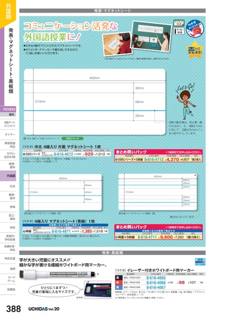 発表・マグネットシートコミュニケーション活発な外国語授業に!●大きな4線がプリントされたマグネットシートです。●ホワイトボードマーカーで書き消しできるので、くり返しお使いいただけます。※折り曲げたり、丸めたりしないでください。亀裂や破損が発生し、使用できなくなります。450mm32mm56mm32mm210mm●中太4線入り片面マグネットシート595シリーズ[ウチダ]中太4線入り片面マグネットシート1枚商品種別お申込番号型式/595シリーズUHSEW-5958-616-4672●●寸法/210縦)×450横)×1厚)mm●線幅/32:56:32mm●名前シール2枚付●包装数:1/5M価税抜¥1,000税抜価格税込価格¥920¥1,012単位1枚3線の基本線は、色は青、線の太さは1、2、4線は1mmに対して、3線は3mmとくっきり見やすくしています。※1組単位申込。まとめ買いパック商品種別●595シリーズ×5枚組お申込番号税抜価格税込価格8-616-4712¥4,370¥4,807単位1組(5枚入)450mm450mm210mm40mm40mm40mm210mm●4線入りマグネットシート(青線)(表)●4線入りマグネットシート(青線)(裏)[ウチダ]4線入りマグネットシート(青線)1枚在庫無次第終了商品お申込番号商品種別型式/UHSEWW-4521B両面●●寸法/210(縦)×450横)×2(厚)mm●線幅(等間隔)/表:40mm、裏:20mm●名前シール2枚付●包装数:1/58-616-4671¥1,380¥1,5181枚税抜価格税込価格単位M価税抜¥1,474まとめ買いパック商品種別両面×5枚組●在庫無次第終了商品お申込番号税抜価格税込価格8-616-4711¥6,600¥7,26020mm20mm20mm20mm20mm20mm角は丸くなっています。※1組単位申込。単位1組(5枚入)線幅0.7〜1.0mm発表・黒板類字が大きい児童にオススメ!!細かな字が書ける極細ホワイトボード用マーカー。黒ひとりに1本ずつ!児童の筆箱に入るサイズです。使用例[コクヨ]イレーザー付きホワイトボード用マーカー商品種別お申込番号M価税抜税抜価格税込価格単位型式/PM-B100R型式/PM-B100D黒赤青●線幅/0.7〜1.0mm●寸法/16径)×125長)mm●質量/8g●付属品/マグネット、イレーザー●包装数:1/10※ご使用後は、キャップをしっかりしめて横置きに保管してください。8-616-46658-616-46668-616-4667型式/PM-B100B¥98¥107¥1201本外国語発表・マグネットシート・黒板類学習支援用品理科発表ボード・発表ボード・ホワイトボードタイマータイマー黒板関連黒板関連用品用品SDGs・SDG総合的な学習国語・国語書写書写外国語社会社会算数・算数数学数学音楽音楽図工・図工美術美術技術技術家庭科・家庭科・学校給食学校給食保健体育・球技球技特別支援特別支道徳道徳カードカゲーム図書室図書室388Vol.20
