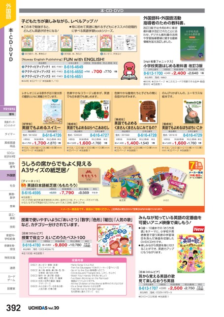 外国語科・外国語活動指導者のための教科書。改訂3版では令和6年に検定教科書が改訂されたことに合わせ、デジタル教科書の活用や学習指導要領に関する最新情報を加え改訂しました。[mpi松香フォニックス]小学校英語はじめる教科書改訂3版お申込番号8-613-1700M価税抜税抜価格¥2,400¥2,400税込価格¥2,640単位1冊商品種別型式/6863●B5判●204ページ●二次元コードで視聴できる音声・動画教材付●包装数:1本・CD・DVD子どもたちが楽しみながら、レベルアップ!!●この本で勉強すると、●特に初めて英語に触れる子どもにオススメの段階的どんどん英語が好きになる!に学べる英語学習bookシリーズ。●自己紹介、色、果物など●反対語、体、形など●あいさつ、天気など[NuwayEnglishPublishing]FUNwithENGLISH!M価税抜税抜価格税込価格単位¥750¥700¥7701冊お申込番号8-616-46498-616-46508-616-4651商品種別型式/FWE1型式/FWE2型式/FWE3アクティビティブック1アクティビティブック2アクティビティブック3●●●●A4判●32ページ●包装数:1/10レオ・レオニによる原作が谷川俊太郎の翻訳とともに掲載されています。色鮮やかなコラージュ絵本が、英語でも日本語でも楽しめます。色鮮やかな動物たちと子どもの間に会話がはずみます。のんびりかばくんの、ユーモラスな絵本です。[好学社]英語でもよめるスイミー[偕成社]英語でもよめるはらぺこあおむし商品種別型式/KK1650お申込番号8-616-4726商品種別型式/328320お申込番号8-616-4727商品種別型式/201560お申込番号8-616-4728[偕成社]英語でもよめるくまさんくまさんなにみてるの?[偕成社]英語でもよめるぼちぼちいこか商品種別型式/201610お申込番号8-616-4729M価税抜税抜価格¥1,700¥1,700¥1,870税込価格単位1冊M価税抜税抜価格税込価格¥1,600¥1,600¥1,760単位1冊M価税抜税抜価格税込価格¥1,400¥1,400¥1,540単位1冊M価税抜税抜価格税込価格¥1,600¥1,600¥1,760単位1冊●寸法/280(縦)×226横)×8厚)mm●32ページ●包装数:1●寸法/220(縦)×300(横)×10厚)mm●25ページ●包装数:1●寸法/280(縦)×220(横)×10(厚)mm●25ページ●包装数:1●寸法/260(縦)×210(横)×10(厚)mm●32ページ●包装数:1うしろの席からでもよく見えるA3サイズの紙芝居![ディーネット]英語日本語紙芝居(ももたろう)お申込番号8-616-4595M価税抜¥8,200税抜価格¥7,790税込価格¥8,569単位1セット沖縄・離島はサービス対象外●包装数:1〈セット内容〉紙芝居:紙芝居8枚(A3判)、音声CD1枚、ティーチャーズガイド1冊、かるた:なぞなぞ英語かるた「WhoamI」札128枚、音声CD1枚紙芝居かるた※メーカー直送品です。返品はご容赦ください。上記商品は受注日から7営業日以内のお届けになります。授業で使いやすいように「あいさつ」数字」「色形」曜日」人気の歌」など、カテゴリー分けされています。[日本コロムビア]授業で役立つえいごのうたベスト100お申込番号8-616-4780M価税抜¥9,800税抜価格税込価格¥9,800¥10,780単位1セット(5枚組)商品種別型式/COCE-40266/70●全100曲●包装数:1収録内容みんなが知っている英語の定番曲を可愛いアニメ映像で楽しもう!●0歳〜10歳までの「おうち英語」をテーマに、小学校や英語教室で習う英語の学習項目を含んだ楽曲を収録したDVD(CD付)です。●楽しみながら英語を身に付けることができ、英語力アップにもつながります。DISC1:あいさつ・家族・友達・アルファベット・数DISC2:食べ物・動物・乗り物・色・形・文房具・身の回りの物DISC3:動作・体・遊び歌・楽器・時間・曜日・天気・月・職業DISC4:日本と世界の童話・童謡・DISC5:みんな知っている有名な歌・マザーグース人気の歌・行事の歌toin'FatSausages/10本のソーセージ【チャンツ】theZoo/動物園へ行こう・HelloSong/こんにちは・Ten・Go・Circle,Square,Triangle/まる、しかく、さんかく・WashYourHands/手を洗いましょうon・I'veBeenWorking線路はつづくよどこまでもtheRailroad/theWorld/世界中の子どもたちがoftheChildrenaSmallWorld/小さな世界・AllIt's・・TaleMeOut私を野球に連れて行ってなどtheBallGame/to[日本コロムビア]耳から覚える英語の歌見て楽しむおうち英語お申込番号8-613-1707M価税抜¥2,500税抜価格税込価格¥2,500¥2,750単位1セット(2枚組)商品種別型式/COZX-1972〜3●DVD+CD2枚組●包装数:1外国語本・CD・DVD学習支援用品理科発表ボード・発表ボード・ホワイトボードタイマータイマー黒板関連黒板関連用品用品SDGs・SDG総合的な学習国語・国語書写書写外国語社会社会算数・算数数学数学音楽音楽図工・図工美術美術技術技術家庭科・家庭科・学校給食学校給食保健体育・球技球技特別支援特別支道徳道徳カードカゲーム図書室図書室392Vol.20