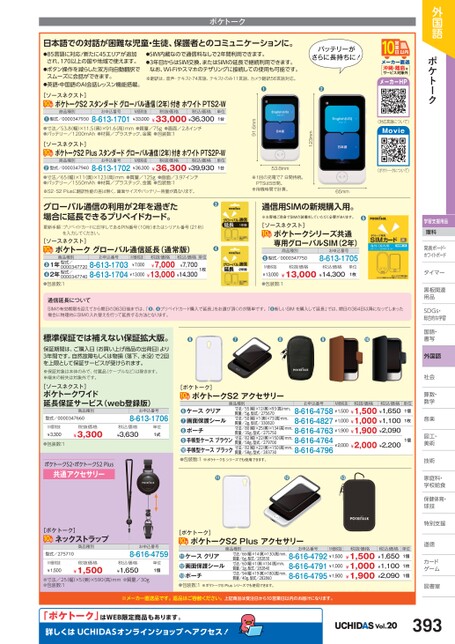 外国語ポケトーク学習支援用品理科発表ボード・発表ボード・ホワイトボードトタイマータイマー黒板関連黒板関連用品用品SDGs・DGs・総合的な学習習国語・語・書写写外国語社会社会算数・数・数学学音楽楽図工・工・美術術技術術家庭科・家庭科・学校給食校食保健体育・体球技技特別支援別道徳徳カードゲームム図書室書●包装数:1●包装数:1通信延長についてSIMの有効期限を迎えてから期日の363日後までは、「●、●プリペイドカード購入で延長」をお選び頂くのが簡単です。「●新しいSIMを購入して延長」では、期日の364日以降になってしまった場合に物理的にSIMの入れ替えを行って延長する方法となります。標準保証では補えない保証拡大版。保証期間は、ご購入日(お買い上げ商品の出荷日)より3年間です。自然故障もしくは物損(落下、水没)で2回を上限として保証サービスが受けられます。※保証対象は本体のみで、付属品(ケーブルなど)は除きます。※端末の紛失は対象外です。●●●●●単位1個1枚1個単位1個1枚1個お申込番号M価税抜税抜価格税込価格8-616-4758¥1,500¥1,500¥1,6508-616-4827¥1,000¥1,000¥1,1008-616-4763¥1,900¥1,900¥2,0908-616-4764¥2,000¥2,000¥2,2008-616-4796ポケトークS2アクセサリー商品種別寸法/55幅)×12奥)×93(高)mm、質量/5g、型式/275670寸法/50幅)×1奥)×73(高)mm、質量/2g、型式/330820寸法/80幅)×25奥)×134(高)mm、質量/35g、型式/275750ケースクリア画面保護シールポーチ手帳型ケースブラウン寸法/82幅)×22奥)×150(高)mm、手帳型ケースブラック寸法/82幅)×22奥)×150(高)mm、質量/58g、型式/279700質量/58g、型式/283730●●●●●[ポケトーク]●包装数:1※ポケトークSシリーズでも使用できます。●●●商品種別お申込番号M価税抜税抜価格税込価格寸法/66(幅)×14奥)×130高)mm、質量/6g、型式/282830寸法/60(幅)×1奥)×104(高)mm、質量/2g、型式/282840寸法/94(幅)×19奥)×180高)mm、質量/40g、型式/2828608-616-4792¥1,5008-616-4791¥1,0008-616-4795¥1,900¥1,500¥1,650¥1,000¥1,100¥1,900¥2,090ケースクリア画面保護シールポーチ●●●[ポケトーク]ポケトークS2Plusアクセサリー●包装数:1※ポケトークSPlusシリーズでも使用できます。[ソースネクスト]ポケトークワイド延長保証サービス(web登録版)商品種別型式/0000347660お申込番号8-613-1706M価税抜¥3,300●包装数:1税抜価格¥3,300税込価格¥3,630単位1式ポケトークS2・ポケトークS2Plus共通アクセサリー[ポケトーク]ネックストラップ商品種別型式/275710お申込番号8-616-4759M価税抜¥1,500税抜価格¥1,500税込価格¥1,650単位1個●寸法/25(幅)×5(奥)×590(高)mm●質量/30g●包装数:1※メーカー直送品です。返品はご容赦ください。上記商品は受注日から10営業日以内のお届けになります。「ポケトーク」はWEB限定商品もあります。詳しくはUCHIDASオンラインショップへアクセス!Vol.20393沖縄・離島はサービス対象外メーカーHP(対応言語について)Movie●●123mm91.6mm53.8mm(ポケトークについて)※1回の充電で7日間持続。PTSは5日間。※待機時間で計算。65mm通信用SIMの新規購入用。※お客様ご自身でSIMの装着をしていただく必要があります。●[ソースネクスト]ポケトークシリーズ共通専用グローバルSIM(2年)商品種別型式/0000347750お申込番号8-613-1705税抜価格税込価格¥13,000¥14,300単位1枚●M価税抜¥13,000[ソースネクスト]ポケトークS2スタンダードグローバル通信(2年)付きホワイトPTS2-W商品種別お申込番号M価税抜税抜価格税込価格8-613-1701¥33,000¥33,000¥36,300●型式/0000347930●寸法/53.8(幅)×11.5(奥)×91.6(高)mm●質量/75g●画面/2.8インチ●バッテリー/1200mAh●材質/プラスチック、金属●包装数:1[ソースネクスト]ポケトークS2Plusスタンダードグローバル通信(2年)付きホワイトPTS2P-W単位1台商品種別お申込番号M価税抜税抜価格税込価格8-613-1702¥36,300¥36,300¥39,930●型式/0000347940●寸法/65(幅)×11(奥)×123(高)mm●質量/125g●画面/3.97インチ●バッテリー/1550mAh●材質/プラスチック、金属●包装数:1※S2・S2Plusに翻訳性能の差は無く、画面サイズやバッテリー容量が異なります。単位1台●●グローバル通信の利用が2年を過ぎた場合に延長できるプリペイドカード。更新手順:プリペイドカードに印字してあるPIN番号(10桁)またはシリアル番号(21桁)を入力してください。ポケトークグローバル通信延長(通常版)税抜価格税込価格単位¥7,000¥7,700¥13,000¥14,3001枚M価税抜¥7,0001年型式/2年型式/00003477208-613-170300003477408-613-1704¥13,000●●商品種別お申込番号[ソースネクスト]日本語での対話が困難な児童・生徒、保護者とのコミュニケーションに。ポケトークバッテリーがさらに長持ちに!●85言語に対応!新たに45エリアが追加され、170以上の国や地域で使えます。●ボタン操作を減らした双方向自動翻訳でスムーズに会話ができます。●英語・中国語のAI会話レッスン機能搭載。●SIM内蔵なので通信料なしで2年間利用できます。●3年目からはSIM交換、またはSIMの延長で継続利用できます。なお、Wi-Fiやスマホのテザリングに接続しての使用も可能です。※翻訳は、音声・テキスト74言語、テキストのみ11言語、カメラ翻訳56言語対応