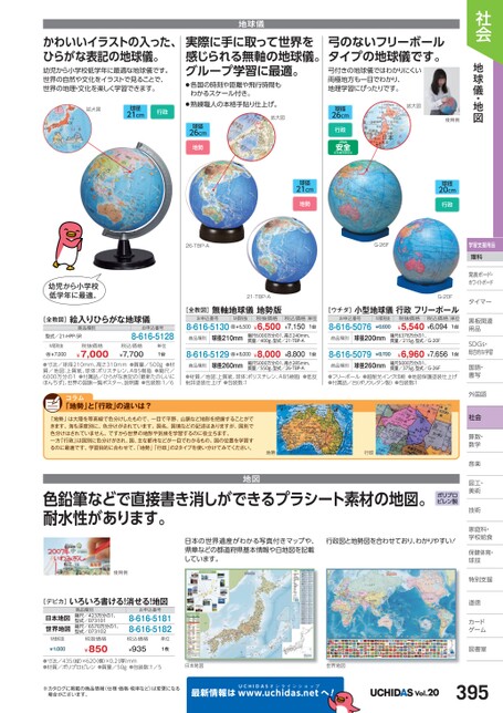 社会地球儀・地図学習支援用品理科発表ボード・発表ボード・ホワイトボードトタイマータイマー黒板関連黒板関連用品用品SDGs・DGs・総合的な学習習国語・語・書写写外国語国社会算数・数・数学学音楽楽図工・工・美術術技術術家庭科・家庭科・学校給食校食保健体育・体球技技特別支援別道徳徳カードゲームム図書室書地球儀かわいいイラストの入った、ひらがな表記の地球儀。幼児から小学校低学年に最適な地球儀です。世界の自然や文化をイラストで見ることで、世界の地理・文化を楽しく学習できます。実際に手に取って世界を感じられる無軸の地球儀。グループ学習に最適。●各国の時刻や距離や飛行時間もわかるスケール付き。拡大図球径21cm行政●熟練職人の本格手貼り仕上げ。拡大図球径26cm地勢弓のないフリーボールタイプの地球儀です。弓付きの地球儀ではわかりにくい両極地方も一目でわかり、地理学習にぴったりです。球径26cm行政拡大図使用例球径21cm地勢球径20cm行政26-TBP-AG-26F幼児から小学校低学年に最適。21-TBP-AG-20F[全教図]絵入りひらがな地球儀商品種別型式/21-HPP-SRお申込番号8-616-5128M価税抜¥7,000税抜価格¥7,000税込価格¥7,700単位1台●寸法/球径210mm、高さ310mm●質量/500g●材質/地図:上質紙、球体:ポリスチレン、ABS樹脂●縮尺/6000万分の1●付属品/ひらがな表記の「最新たのしいにほんちず」、世界の国旗一覧ポスター、説明書●包装数:1/6「地勢」と「行政」の違いは?[全教図]無軸地球儀地勢版お申込番号8-616-5130M価税抜¥6,500税抜価格¥6,500税込価格単位¥7,1501台商品種別球径210mm縮尺6000万分の1、高さ240mm、質量/400g、型式/21-TBP-A[ウチダ]小型地球儀行政フリーボールお申込番号8-616-5076M価税抜¥6,600税抜価格¥5,540¥6,094税込価格単位1台商品種別球径200mm縮尺6378万分の1、質量/215g、型式/G-20F8-616-5129¥8,000¥8,000¥8,8001台8-616-5079¥8,700¥6,960¥7,6561台商品種別球径260mm縮尺5000万分の1、高さ285mm、質量/550g、型式/26-TBP-A商品種別球径260mm縮尺5000万分の1、質量/375g、型式/G-26F●材質/地図:上質紙、球体:ポリスチレン、ABS樹脂●低反射非塗装仕上げ●包装数:1●フリーボール●超耐光インク印刷●地図保護塗装仕上げ●付属品/台(ポリウレタン製)●包装数:1「地勢」は大陸を等高線で色分けしたもので、一目で平野、山脈など地形を把握することができます。海も深度別に、色分けがされています。国名、国境などの記述はありますが、国別で色分けはされていません。ですから世界の地形や気候を学習するのに役立ちます。一方「行政」は国別に色分けがされ、国、主な都市などが一目でわかるもの。国の位置を学習するのに最適です。学習目的に合わせて、「地勢」「行政」の2タイプを使い分けてみてください。地勢行政色鉛筆などで直接書き消しができるプラシート素材の地図。耐水性があります。ポリプロピレン製地図日本の世界遺産がわかる写真付きマップや、県章などの都道府県基本情報や白地図を記載しています。行政図と地勢図を合わせており、わかりやすい!使用例[デビカ]いろいろ書ける!消せる!地図日本地図世界地図M価税抜¥1,000商品種別縮尺/423万分の1、型式/073101縮尺/6570万分の1、型式/073102税抜価格¥850お申込番号8-616-51818-616-5182税込価格¥935単位1枚●寸法/435(縦)×620(横)×0.2厚)mm●材質/ポリプロピレン●質量/50g●包装数:1/5日本地図※カタログに掲載の商品情報(仕様・価格・税率など)は変更になる場合がございます。最新情報はUCHIDASww.uchidas.netw世界地図へ!Vol.20395