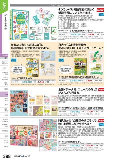 ゲーム・その他地儀4つのレベルで段階的に楽しく都道府県について学べます。対象年齢6歳以上3つのヒントを順に読み、正解の取り札を探してとろう!少ないヒントでとれるほど、ポイントが多くもらえます。4つのレベルで段階的に遊びながら都道府県について学ぶことができます。レベル1:かるた遊びレベル2:クイズ都道府県カードゲーム(簡単)レベル3:クイズ都道府県カードゲーム(難しい)レベル4:都道府県クイズマスター[学研ステイフル]クイズ都道府県カードゲーム商品種別型式/83068お申込番号8-613-2104M価税抜¥1,400税抜価格税込価格単位¥1,400¥1,5401セット●寸法/148(幅)×30(奥)×205(高)mm●質量/420g●材質/紙●包装数:1/3〈セット内容〉取り札:47枚、読み札:47枚、ポイントコイン:8シート(144枚)、日本地図ポスター(取扱説明書)京大・パズル博士考案の都道府県を楽しく覚えるカードゲーム!●漢字の書かれたカードを組み合わせて、都道府県名のセットを作るゲームです。●「隣接都道府県」や「地方」、各分野のトップ5」でセットができると得点アップ!かるたで楽しく遊びながら、都道府県の形や特徴を覚えよう!●各都道府県のピースは、山や河川などの地形をリアルに表現。●読み札の裏には、都道府県の産物など、その土地“らしさ”がぎゅっと凝縮されています。対象年齢6歳以上はじめての地理の学習にぴったりです。対象年齢6歳以上漢字の学習にも役立ちます。[幻冬舎]47都道府県かるた商品種別型式/479185お申込番号M価税抜8-613-2101¥1,600税抜価格¥1,440税込価格¥1,584単位1セット●寸法/131(幅)×30(奥)×196(高)mm●質量/370g●材質/紙●包装数:1/24[幻冬舎]京大・東田式頭がよくなる都道府県ゲーム商品種別型式/499227お申込番号M価税抜8-613-2100¥1,500税抜価格¥1,350税込価格¥1,485単位1セット●寸法/115(幅)×27(奥)×160(高)mm●質量/194g●材質/紙●対象人数/2〜6名●包装数:1/24地図×データで、ニュースのなぜ?がどんどん見える。「イスラエル×パレスチナの戦いはなぜ起きたの?」「世界で1番日本の会社があるのはどこ?」「ITに経済に農業……アメリカはなぜ強いの?」紹介する国と地域は80カ所以上!盛りだくさんの地図×データで世界の姿が見えてくる![幻冬舎]世界のしくみが楽しくわかる13歳からの世界地図商品種別型式/479206お申込番号8-613-2103M価税抜¥1,700税抜価格税込価格¥1,700¥1,870単位1冊●寸法/150(幅)×15(奥)×210(高)mm(A5サイズ)●質量/342g●材質/紙●244ページ/2色刷り●包装数:1/6時代を分けた2種類のすごろくで、流れを理解しながら学べる!「旧石器〜江戸時代」明治〜令和時代」に分けたすごろくで、対象年齢6歳以上子どもの頃から身に付けておきたい、歴史の流れや知識を、遊びながら学ぶことのできるすごろくボードゲームです。歴史を学ぶことで、常識や価値観は絶対のものではなく、人々は間違いながらも前に進んできたことがわかり、他人や自分にやさしくなることができます。思う存分遊びながら、歴史を学んでいきましょう![幻冬舎]日本の歴史すごろく商品種別型式/479216お申込番号8-613-2102M価税抜¥2,400税抜価格税込価格¥2,400¥2,640単位1セット●寸法/220(幅)×30(奥)×160(高)mm●質量/292g●材質/紙●包装数:1/24〈セット内容〉すごろくシート1枚(両面使用)、アイテムカード132枚、ポイントチップ80枚、順番札4枚、コマ4枚(組み立て式)、サイコロ1個(組み立て式)、ガイドブック(40ページ)社会ゲーム・その他学習支援用品理科発表ボード・発表ボード・ホワイトボードタイマータイマー黒板関連黒板関連用品用品SDGs・SDG総合的な学習国語・国語書写書写外国語外国語社会算数・算数数学数学音楽音楽図工・図工美術美術技術技術家庭科・家庭科・学校給食学校給食保健体育・球技球技特別支援特別支道徳道徳カードカゲーム図書室図書室Vol.20