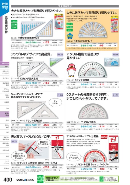 児童用実習材大きな数字とヤマ型目盛りで読みやすい。●数字が5cmごとに大きく読みやすい。●5mm単位のグリッドで平行線が引きやすい。120mm[コクヨ]三角定規〈まなびすと〉商品種別型式/GY-GBA210お申込番号8-616-7164M価税抜¥225税抜価格¥179税込価格¥196単位1セット●寸法/30°:120×70mm、45°85×85mm、厚さ:1mm●質量/10g●材質/再生PET樹脂●色/30°ブルー、45°:オレンジ●包装数:1/10〈セット内容〉30°、45°各1枚大きな数字とヤマ型目盛りで測りやすい。●30°ごとに数字を大きくし、読みやすくしました。●左右どちらからでも角度が測れるよう、両側に目盛りがついています。[コクヨ]分度器〈まなびすと〉商品種別型式/GY-GBA310お申込番号8-616-7165M価税抜¥125税抜価格¥99税込価格¥108単位1個●寸法/90横)×50(縦)×1(厚)mm●質量/5g●材質/再生PET樹脂●包装数:1/10シンプルなデザインで高品質。便利なゼロスタート目盛り。120mmケース付アクリル樹脂で目盛りが見やすい!ケース付[ソニック]12センチ三角定規商品種別型式/SN-377お申込番号8-616-7178M価税抜¥200税抜価格¥153税込価格¥168単位1セット●寸法/30°120×70mm、45°120(底辺)×60(高)mm、厚さ:1.5mm●質量/14g●材質/アクリル樹脂●ソフトケース入●包装数:1/20〈セット内容〉30°、45°各1枚5mmごとにドットが入っていて読み取りやすくなっています。150mmケース付少し大きめ。[共栄プラスチック]アクリル三角定規商品種別型式/V-520お申込番号8-616-7239M価税抜¥280税抜価格¥232税込価格¥255単位1セット●寸法/30°150×87mm、45°106×106mm、厚さ:1.5mm●質量/28g●材質/アクリル樹脂●クリアケース付●包装数:1〈セット内容〉30°、45°各1枚[ソニック]9センチ分度器商品種別型式/SN-388お申込番号8-616-7179M価税抜¥140税抜価格¥111税込価格¥122単位1個●寸法/90(横)×49縦)×1.5厚)mm●質量/6g●材質/アクリル樹脂●ソフトケース入●包装数:1/300スタートの分度器です(半円)。5°ごとにドットが入っています。ケース付[共栄プラスチック]アクリル分度器商品種別型式/V-320お申込番号8-616-7240M価税抜¥150税抜価格¥114税込価格¥125単位1個●寸法/90(横)×45(縦)×1.5厚)mm●質量/7g●材質/アクリル樹脂●クリアケース付●包装数:1表と裏で、すべりどめON/OFF。ケース付裏返せばスライド自在!すべらないリバーシブル分度器。表と裏で滑り止めのオン・オフが選べるので、固定する定規はピタッとズレず、裏返せばスライド自在になります。裏返しても数字が反転しないので、裏面でも測りやすい仕様になっています。固定する定規はピタっとズレない!使用例ピタッ!とすべらない。[ソニック]ナノピタ三角定規10cmリバーシブル商品種別型式/SK-7501お申込番号8-616-7224M価税抜¥270税抜価格¥232税込価格¥255単位1セット●寸法/30°120×69mm、45°120(底辺)×60(高)mm、厚さ:1.5mm●質量/14g●材質/アクリル樹脂●ソフトケース付●包装数:1/10〈セット内容〉30°、45°各1枚[ソニック]ナノピタ分度器9cmリバーシブル商品種別型式/SK-7502お申込番号8-613-2408M価税抜¥150税抜価格¥128税込価格¥140単位1個●寸法/90(横)×48(縦)×1.5厚)mm●質量/6g●材質/アクリル樹脂●包装数:1/10算数・数学児童用実習材学習支援用品理科発表ボード・発表ボード・ホワイトボードタイマータイマー黒板関連黒板関連用品用品SDGs・SDG総合的な学習国語・国語書写書写外国語外国語社会社会算数・数学音楽音楽図工・図工美術美術技術技術家庭科・家庭科・学校給食学校給食保健体育・球技球技特別支援特別支道徳道徳カードカゲーム図書室図書室400Vol.20地球にやさしくお買い物このマークのついた商品は地球環境保護に配慮された商品です。グリーンの文字で商品の判別をしやすくしました。どうぞご利用ください。エコマーク認定品グリーン購入法適合品GPNエコ商品ねっと掲載
