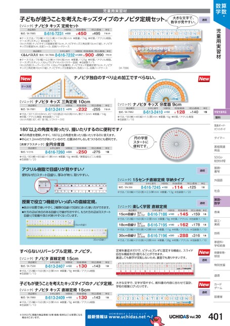 算数・数学児童用実習材学習支援用品理科発表ボード・発表ボード・ホワイトボードトタイマータイマー黒板関連黒板関連用品用品SDGs・DGs・総合的な学習習国語・語・書写写外国語国社会社会算数・数学音楽楽図工・工・美術術技術術家庭科・家庭科・学校給食校食保健体育・体球技技特別支援別道徳徳カードゲームム図書室書児童用実習材子どもが使うことを考えたキッズタイプのナノピタ定規セット。[ソニック]ナノピタキッズ定規セット商品種別型式/SK-7885お申込番号8-616-7231M価税抜¥600税抜価格¥450税込価格¥495単位1セット大きな文字で、数字が見やすい。透明●ケース寸法/70幅)×10.5(奥)×194(高)mm●質量/74g●材質/アクリル樹脂、ケース:ポリスチレン●包装数:1/5〈セット内容〉ナノピタキッズ直線定規15cm、ナノピタキッズ三角定規10cm(1組)、ナノピタキッズ分度器9cm、名前シール、収納ハードケース商品種別くるんパス入り型式/SK-78868-616-7232¥1,200¥900お申込番号M価税抜税抜価格税込価格¥990単位1セット●ケース寸法/78(幅)×22(奥)×194(高)mm●質量/125g●材質/アクリル樹脂、ケース:ポリスチレン、くるんパス:ダイキャスト(カラー塗装)●包装数:1/5〈セット内容〉スーパーコンパスくるんパス(鉛筆用)、ナノピタキッズ直線定規15cm、ナノピタキッズ三角定規10cm(1組)、ナノピタキッズ分度器9cm、名前シール、収納ハードケースSK-7886ナノピタ独自のすべり止め加工ですべらない。ケース付[ソニック]ナノピタキッズ三角定規10cm商品種別型式/SK-7881お申込番号8-613-2411M価税抜¥270税抜価格¥232税込価格¥255単位1セット●寸法/30°120×69mm、45°120(底辺)×60(高)mm、厚さ:1.5mm●質量/14g●材質/アクリル樹脂●包装数:1/10〈セット内容〉30°、45°各1枚、ソフトケース付[ソニック]ナノピタキッズ分度器9cm商品種別型式/SK-7882お申込番号8-613-2410M価税抜¥150税抜価格¥128税込価格¥140単位1個●寸法/90(横)×48(縦)×1.5厚)mm●質量/6g●材質/アクリル樹脂●包装数:1/10180°以上の角度を測ったり、描いたりするのに便利です!●円の角度を理解しやすく、180°以上の角度を測ったり描いたりするのに使えます。●中心に1.2mmの穴があいているので、位置決めやしるしをつけるのにも便利です。[共栄プラスチック]全円分度器8-616-7260税込価格¥275●寸法/80(横)×80(縦)×1(厚)mm●質量/6g●材質/硬質塩化ビニル樹脂●包装数:1/20¥250M価税抜¥320型式/V-316お申込番号税抜価格単位1個商品種別円の学習スタートに便利です。アクリル樹脂で目盛りが見やすい!便利なゼロスタート目盛り。厚みが有り、取りやすい。授業で役立つ機能がいっぱいの直線定規。●色分け効果で使いやすく、2種類の目盛りで目的に合った使い方ができます。●片方の辺は「余白のある目盛り」で線が引きやすく、もう片方の辺は「0スタート目盛り」で距離や深さが測りやすくなっています。18cm目盛り30cm目盛りすべらないリバーシブル定規、ナノピタ。[ソニック]ナノピタ直線定規15cm商品種別型式/SK-7500お申込番号8-613-2407M価税抜¥160税抜価格¥130税込価格¥143単位1本●寸法/25(幅)×160(長)×2(厚)mm●質量/9g●材質/アクリル樹脂●包装数:1/10子どもが使うことを考えたキッズタイプのナノピタ定規。[ソニック]ナノピタキッズ直線定規15cm商品種別型式/SK-7880お申込番号8-613-2409M価税抜¥160税抜価格¥130税込価格¥143単位1本[ソニック]15センチ直線定規学納タイプ商品種別型式/SN-366お申込番号8-616-7245M価税抜¥150税抜価格¥114透明税込価格¥125単位1本●寸法/30(幅)×150(長)×2.5(厚)mm●質量/13g●包装数:1/20透明[ソニック]楽しく学習直線定規M価税抜¥160税込価格¥159単位1本商品種別お申込番号税抜価格SN-797¥1458-616-718615cm目盛り型式/●寸法/25(幅)×160(長)×2(厚)mm●質量/9g●材質/アクリル●包装数:1/1018cm目盛り型式/●寸法/25(幅)×185(長)×2厚)mm●質量/11g●材質/アクリル●包装数:1/1030cm目盛り型式/●寸法/35(幅)×310(長)×2厚)mm●質量/28g●材質/アクリル●包装数:1/108-616-71958-616-7196¥288¥162¥316¥178SN-848SN-809¥180¥3201本1本定規を裏返すだけで、ピタッとズレずに固定する機能と、スライド自在な機能を切り替えることができます。裏返しても数字が反転しないため、裏面でも測りやすいです。大きな文字で、文字が見やすく、教科書の内容に合わせて設計、学校の授業にぴったりです。透明透明●寸法/25(幅)×160(長)×2(厚)mm●質量/9g●材質/アクリル樹脂●包装数:1/10※カタログに掲載の商品情報(仕様・価格・税率など)は変更になる場合がございます。最新情報はUCHIDASww.uchidas.netwへ!Vol.20401