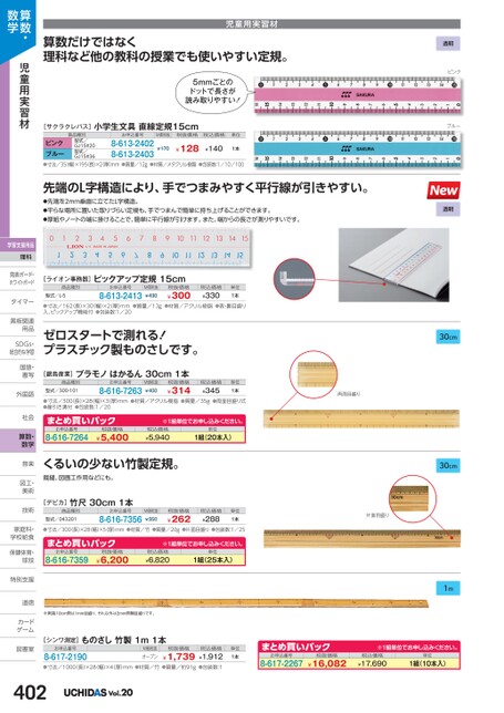 透明ピンクブルー透明30cm30cm1m算数だけではなく理科など他の教科の授業でも使いやすい定規。児童用実習材5mmごとのドットで長さが読み取りやすい![サクラクレパス]小学生文具直線定規15cm商品種別型式/GJ15#20型式/GJ15#36お申込番号M価税抜税抜価格税込価格単位ピンクブルー●寸法/35幅)×195(長)×2厚)mm●質量/12g●材質/メタクリル樹脂●包装数:1/10/1008-613-24028-613-2403¥128¥140¥1701本先端のL字構造により、手でつまみやすく平行線が引きやすい。●先端を2mm垂直に立てたL字構造。●平らな場所に置いた取りづらい定規も、手でつまんで簡単に持ち上げることができます。●厚紙やノートの端に掛けることで、簡単に平行線が引けます。また、端からの長さが測りやすいです。[ライオン事務器]ピックアップ定規15cm商品種別型式/L-5お申込番号8-613-2413M価税抜¥430税抜価格¥300税込価格¥330単位1本●寸法/162(長)×30幅)×2(厚)mm●質量/13g●材質/アクリル樹脂●表・裏目盛り入、ピックアップ機能付●包装数:1/20ゼロスタートで測れる!プラスチック製ものさしです。[銀鳥産業]プラモノはかるん30cm1本商品種別型式/300-101お申込番号8-616-7263M価税抜¥400税抜価格¥314税込価格¥345単位1本●寸法/300(長)×28幅)×3厚)mm●材質/アクリル樹脂●質量/35g●両面目盛り式●線引き溝付●包装数:1/20まとめ買いパック8-616-7264お申込番号¥5,400税抜価格※1組単位申込。税込価格¥5,940単位1組(20本入)くるいの少ない竹製定規。裁縫、図画工作用などにも。両面目盛り[デビカ]竹尺30cm1本商品種別型式/043201お申込番号8-616-7356M価税抜¥350税抜価格¥262税込価格¥288単位1本片面目盛り算数・数学児童用実習材学習支援用品理科発表ボード・発表ボード・ホワイトボードタイマータイマー黒板関連黒板関連用品用品SDGs・SDG総合的な学習国語・国語書写書写外国語外国語社会社会算数・数学音楽音楽図工・図工美術美術技術技術家庭科・家庭科・学校給食学校給食保健体育・球技球技特別支援特別支道徳道徳カードカゲーム図書室図書室●寸法/300長)×28(幅)×5(厚)mm●材質/竹●質量/20g●片面目盛り●包装数:1/25まとめ買いパック8-616-7359お申込番号¥6,200税抜価格※1組単位申込。税込価格¥6,820単位1組(25本入)※両端10cm間は1mm目盛り、それ以外は2mm間隔目盛りです。[シンワ測定]ものさし竹製1m1本お申込番号8-617-2190税込価格¥1,912●寸法/1000(長)×28(幅)×4(厚)mm●材質/竹●質量/約91g●包装数:1¥1,739M価税抜オープン税抜価格単位1本402Vol.20まとめ買いパック8-617-2267お申込番号¥16,082税抜価格※1組単位申込。税込価格¥17,690単位1組(10本入)