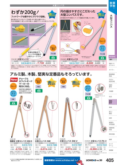 算数・数学大型コンパス学習支援用品理科発表ボード・発表ボード・ホワイトボードトタイマータイマー黒板関連黒板関連用品用品SDGs・DGs・総合的な学習習国語・語・書写写外国語国社会社会算数・数学音楽楽図工・工・美術術技術術家庭科・家庭科・学校給食校食保健体育・体球技技特別支援別道徳徳カードゲームム図書室書[ウチダ]国産材大型コンパスNW-K[ウチダ]大型コンパスNW商品種別型式/NW-Kお申込番号8-616-7372商品種別型式/NWお申込番号8-616-7086[ウチダ]大型コンパスSW-V[ウチダ]大型コンパスPK-V商品種別型式/SW-Vお申込番号8-616-7087商品種別型式/PK-Vお申込番号8-616-7043M価税抜¥7,080税抜価格税込価格¥6,726¥7,398単位1本M価税抜税抜価格税込価格オープン¥5,074¥5,581単位1本M価税抜税抜価格税込価格オープン¥5,074¥5,581単位1本M価税抜税抜価格税込価格オープン¥8,360¥9,196単位1本●腕部/木製(国産ひのき材)●針部/ゴム製(回転式)●600mm、5mm目盛り●チョーク、ホワイトボードマーカー用●包装数:1●腕部/木製●針部/ゴム製(回転式)●600mm、5mm目盛り●チョーク専用●包装数:1●腕部/木製●針部/ゴム製(回転式)●550mm、5mm目盛り●チョーク専用●包装数:1●軽合金アルミ製●針部/ゴム製●550mm、5mm目盛り●チョーク、ホワイトボードマーカー用●包装数:1※カタログに掲載の商品情報(仕様・価格・税率など)は変更になる場合がございます。最新情報はUCHIDASww.uchidas.netwへ!Vol.20大型コンパスわずか200g!フットワークも軽やかにラクラク回転。腕の部分はアルミ丸パイプを採用、持つ部分は握りやすい形状の樹脂製で、使う人の手に優しい、曲面デザインの大型コンパスです。円の描きやすさにこだわった大型コンパスです。針の部分のずれを防ぐ、ドーナツ型磁石が付属しています。チョーク・マーカー対応角度目盛り回転式針部ワンタッチチョークホルダー針部は回転式で、コンパスの回転が大変スムーズです。[ウチダ]大型コンパスドーナツ型磁石は本体に収納できます。裏面マグネット付き大型コンパスと大型ものさしシートを使ってコンパスの使い方を説明できます。チョーク専用アルミ製ドーナツ型磁石針のずれを防ぎます。円の中心を表すマークにも利用できます。[ウチダ]大型コンパス※軸の直径19mmまでのマーカーが使えます。チョークホワイトボードマーカーアルミ製商品種別型式/KA-55Rお申込番号M価税抜8-616-6013¥9,100税抜価格¥7,730税込価格¥8,503単位1本商品種別型式/S-1お申込番号M価税抜8-616-7237¥10,000税抜価格¥8,600税込価格¥9,460単位1本●腕部/アルミ製丸パイプ●550mm、10mm目盛りドット付●質量/約200g●頭部/樹脂製、0〜90°角度目盛り入●針部/回転式●ワンタッチチョークホルダー(チョーク専用)●包装数:1●腕部/アルミ製パイプ●頭部・ホルダー部/樹脂製●針部/回転式●550mm、10mm目盛りドット付●質量/約205g●チョーク、ホワイトボードマーカー用●裏面マグネット付●包装数:1アルミ製、木製、堅実な定番品もそろっています。チョークとホワイトボードマーカーの両方に対応。持続可能な循環型の木材生産を行っている国産ひのき材を使用。チョークホワイトボードマーカー木製チョーク専用木製チョーク専用木製チョークホワイトボードマーカーアルミ製※直径20mmまでのホワイトボードマーカーが使えます。