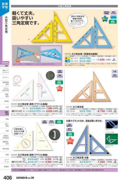 軽くて丈夫。扱いやすい三角定規です。黄折れにくく、割れにくいので曲面黒板にもフィットします。取っ手は折りたたみできます。PP-6Mマグネット付き大型三角定規素材に特殊発泡樹脂を使用。軽くて丈夫です。※重さは従来の木製に比べ、約2分の1(当社比)特殊発泡樹脂製裏面マグネット付約360g青[ウチダ]大三角定規(特殊発泡樹脂)商品種別お申込番号M価税抜税抜価格税込価格単位型式/NP-6Y黄青●寸法/共通辺600mm、厚さ6mm●質量/約360g●5mm目盛り入●材質/特殊発泡樹脂●裏面マグネット付●包装数:18-616-7085オープン8-616-7095¥7,225¥7,947型式/NP-6B(2種入)1組透明樹脂製裏面マグネット付(PP-6Mのみ)木製裏面マグネット付[ウチダ]大三角定規透明(アクリル樹脂)商品種別お申込番号M価税抜税抜価格税込価格型式/PP-68-616-6009¥9,300¥7,896¥8,685型式/PP-6M8-616-7270¥10,500¥9,008¥9,908裏面マグネット付き(2種入)●寸法/共通辺600mm、厚さ3mm●質量/675g●5mm目盛り入●面取り加工●取っ手付●ネオジウム磁石(直径5.3mm、3カ所)付(PP-6M)●包装数:1/10(2種入)1組単位1組[ウチダ]大三角定規商品種別型式/MW-6Mお申込番号M価税抜8-616-7229オープン税抜価格¥6,750税込価格¥7,425(2種入)●寸法/共通辺600mm、厚さ9mm●質量/780g●3辺に5mm目盛り入●材質/木(クリアラッカー仕上げ)●取っ手付●裏面マグネット付●包装数:1単位1組分度目盛り、50mm方眼目盛り入り。透明樹脂製裏面マグネット付(PP-60Mのみ)取っ手部片面マグネット付き。反転式取っ手付き。木製樹脂枠付裏面マグネット付反転式取っ手マグネットで固定平行線の作図に便利です。[ウチダ]大三角定規透明(アクリル樹脂)商品種別M価税抜お申込番号税込価格8-616-4027¥9,1308-616-7271¥11,000¥9,369¥10,305¥9,800¥8,300税抜価格単位1組1組(2種入)裏面マグネット付き(2種入)●寸法/共通辺600mm、厚さ3mm●質量/775g●10mm目盛り・分度目盛り・50mm方眼目盛り入●面取り加工●取っ手付●ネオジウム磁石付(PP-60M)●包装数:1/10型式/PP-60型式/PP-60M[ウチダ]大三角定規木製商品種別型式/SW-6CMお申込番号M価税抜8-616-6010オープン税抜価格¥7,220税込価格¥7,942(2種入)●寸法/共通辺600mm、厚さ7.5mm●質量/615g●両面型●材質/木(エコマーク素材NPウッド使用)、樹脂枠付●5mm目盛り入●反転式取っ手、裏面マグネット付●包装数:1単位1組算数・数学大型三角定規学習支援用品理科発表ボード・発表ボード・ホワイトボードタイマータイマー黒板関連黒板関連用品用品SDGs・SDG総合的な学習国語・国語書写書写外国語外国語社会社会算数・数学音楽音楽図工・図工美術美術技術技術家庭科・家庭科・学校給食学校給食保健体育・球技球技特別支援特別支道徳道徳カードカゲーム図書室図書室マグネット付き定規についてマグネットは黒板上で定規をスライドできるように、弱めの磁力にしてあります。黒板の種類によっては手を放すと落ちる場合があります。406Vol.20