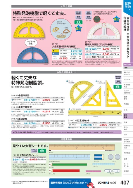 算数・数学大型分度器・中型作図用具セット・指導用教材学習支援用品理科発表ボード・発表ボード・ホワイトボードトタイマータイマー黒板関連黒板関連用品用品SDGs・DGs・総合的な学習習国語・語・書写写外国語国社会社会算数・数学音楽楽図工・工・美術術技術術家庭科・家庭科・学校給食校食保健体育・体球技技特別支援別道徳徳カードゲームム図書室書大型分度器特殊発泡樹脂で軽くて丈夫。●手にやさしく、曲面や黒板にもフィットします。●取っ手は使用時に簡単に組み立てられます。新素材で約250gの軽さ!従来品50等分目盛り入り、正三角形から正十二角形までの角度入り。特殊発泡樹脂製裏面マグネット付透明樹脂製裏面マグネット付(PP-6M)NP-6Yマグネット付き。NP-6B軽くて丈夫な特殊発泡樹脂製。取っ手は折りたたみ式です。[ウチダ]大分度器(特殊発泡樹脂)黄青商品種別型式/NP-6Y型式/NP-6Bお申込番号8-616-70848-616-7096税抜価格¥5,355M価税抜オープン●寸法/600(径)mm●厚さ/6mm●質量/約250g●5mm目盛り、分度目盛り、50等分目盛り入●材質/特殊発泡樹脂●裏面マグネット付●包装数:1税込価格¥5,890単位1個[ウチダ]透明大分度器(アクリル樹脂)お申込番号M価税抜税抜価格税込価格8-616-6005¥7,600¥6,390¥7,029商品種別型式/PP-68-616-7275¥8,700¥7,345¥8,079商品種別裏面マグネット付き型式/PP-6M単位1個1個●寸法/600径)mm●厚さ/3mm●質量/435g●10mm目盛り、分度目盛り、50等分目盛り、正三角形から正十二角形までの角度入●取っ手付●ネオジウム磁石(直径5.3mm、3カ所)付(PP-6M)●包装数:1/10中型作図用具セット●NP-45Y中型分度器●NP-45Y中型三角定規特殊発泡樹脂製裏面マグネット付[ウチダ]中型定規セット商品種別お申込番号M価税抜税抜価格税込価格型式/NP-3Y¥10,219●●分度器NP-45Y、●三角定規NP-45Y、●直線定規NP-60Yのセット●包装数:18-616-7247オープン¥9,290単位1セット450mm450mm450mm●NP-60Y直線定規605mm[ウチダ]中型分度器商品種別お申込番号M価税抜税抜価格型式/NP-45Y8-616-7250オープン●●寸法/450直径)×6(厚)mm●質量/約200g●材質/特殊発泡樹脂●5mm目盛り、分度目盛り入●裏面マグネット付●取っ手付●包装数:1¥2,805税込価格¥3,085単位1個[ウチダ]中型三角定規商品種別お申込番号M価税抜税抜価格型式/NP-45Y8-616-7249オープン●(2種入)●寸法/共通辺450mm、厚さ6mm●質量/約300g1組)●材質/特殊発泡樹脂●5mm目盛り入●裏面マグネット付●取っ手付●包装数:1[ウチダ]直線定規¥4,214税込価格¥4,635単位1組商品種別お申込番号M価税抜税抜価格型式/NP-60Y8-616-7248オープン●●寸法/幅50mm、長さ605mm、厚さ6mm●質量/約95g●材質/特殊発泡樹脂●裏面マグネット付●取っ手付●包装数:1¥2,550税込価格¥2,805単位1本マグネット付き定規・分度器についてマグネットは黒板上で定規をスライドできるように、弱めの磁力にしてあります。黒板の種類によっては手を放すと落ちる場合があります。見やすい大型シートです。指導用教材マグネットシート製[ウチダ]大型ものさしシートお申込番号M価税抜税抜価格税込価格単位8-616-7183¥9,500¥8,075¥8,8821セット商品種別SMW-24CM●寸法/ものさしシート:120縦)×1200横)mmPET樹脂フィルム、樹脂磁石●包装数:1〈セット内容〉9種11個組(ものさしシートで測定時の寸法):ものさし(24cm)、1cm目盛りものさし(15cm)、えんぴつ(14cm)、赤えんぴつ(11.2cm)、リボン①(8cm)、リボン②(5.6cm)、クリップ2個(各2.8cm)、けしごむ(3.5cm)、1円玉2個(各2cm)●材質/ものさし1cm目盛りものさしえんぴつ赤えんぴつけしごむリボン①1円玉リボン②クリップ※カタログに掲載の商品情報(仕様・価格・税率など)は変更になる場合がございます。最新情報はUCHIDASww.uchidas.netwへ!Vol.20407