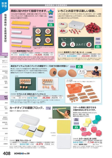 指導用教材・生徒用実習材黒板に貼り付けて指導できます。1から20までの数の導入、計算の導入で使うブロックです。ブロックの上にカバーを置けますので、カバーで隠す、まとめるなどの操作ができます。樹脂製いちごとお皿で学ぶ楽しい算数。いちごと皿にはすべてマグネットが付いていますので、スチール黒板に貼り付けて演示することができます。いちごは直接黒板にも、皿の上にも貼り付けることができます。マグネット付使用例※8-616-6003教授用「いちご・皿」セットと組み合わせて使用しています。[ウチダ]教授用算数ブロック商品種別型式/UN-20お申込番号M価税抜税抜価格8-616-7142オープン¥14,620¥16,082税込価格単位1セット●1単位寸法/40縦)×40横)×20高)mm●材質/樹脂●内容/1単位ブロック10個、5単位ブロック2個、5単位ブロックカバー(48(縦)×205横)×29(高)mm)2本、10単位ブロックカバー(48(縦)×405(横)×29高)mm)1本計15点●収納用布袋付●包装数:1樹脂製マグネット付使用例[ウチダ]教授用「いちご・皿」セット110点組商品種別型式/UN-100Nお申込番号M価税抜税抜価格8-616-6003オープン¥33,540¥36,894税込価格単位1セット●いちご:樹脂製(マグネット付)100個●皿:ポリプロピレン製、直径180mm、10枚、表面マグネット貼付用スチールシート付、裏面マグネット付●収納ケース付●包装数:1身近なアイテム「たまごパック」の模型で1〜10までの数の学習に!●たまご、たまごパックは磁石付きで、黒板に貼ることができます。●10パック(100個)のたまごで1〜100までの数の学習ができます。●黒板でもホワイトボードでも見やすい赤たまごの模型です。使用例マグネット付8-2=いくつ?[セット内容]たまご模型×100個、たまごパック模型×10個、収納かご×1黒板ホワイトボード[ウチダ]マグネット式算数たまごパックセットお申込番号M価税抜8-616-7339オープン税抜価格¥36,980税込価格¥40,678単位1セット商品種別111点組型式/UN-T100●寸法/たまご:最大約41直径)×最大約55高)mm、たまごパック:252(幅)×122(奥)×30(高)mm●材質/ポリプロピレン、フェライト磁石、スチールペーパー●包装数:1〈セット内容〉たまご模型×100個、たまごパック模型×10個、収納かご×1カードタイプの算数ブロック。両面タイプ、黒板などに貼れます。マグネットシート製使用例片面(黄色)片面(白)税抜価格¥6,375税込価格¥7,012単位1セット[ウチダ]算数ブロックカード商品種別型式/SM-30お申込番号8-616-7361M価税抜¥7,500スチール黒板に提示できる大型のおはじきセットです。具体的におはじきを対応させることにより、数の大小、順序、合成、分解、簡単な加法・減法ができます。発泡樹脂製マグネット付120mm[ウチダ]カラーおはじき(大判)お申込番号M価税抜税抜価格税込価格8-616-7092オープン¥7,740¥8,514単位1セット(40枚組)商品種別教師用(花形)型式/PP-40算数・数学指導用教材・生徒用実習材学習支援用品理科発表ボード・発表ボード・ホワイトボードタイマータイマー黒板関連黒板関連用品用品SDGs・SDG総合的な学習国語・国語書写書写外国語外国語社会社会算数・数学音楽音楽図工・図工美術美術技術技術家庭科・家庭科・学校給食学校給食保健体育・球技球技特別支援特別支道徳道徳カードカゲーム図書室図書室●寸法/50縦)×50横)×1(厚)mm●材質/PET樹脂フィルム、樹脂磁石●内容/ブロックカード(黄色と白色の両面仕様)30枚組、ケース付●包装数:1●直径120mm●材質/発泡樹脂●内容/赤20枚・黄10枚・緑10枚計40枚(磁石付)●ケース付●包装数:1408Vol.20