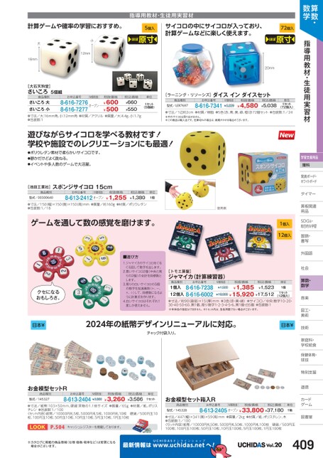 算数・数学指導用教材・生徒用実習材学習支援用品理科発表ボード・発表ボード・ホワイトボードトタイマータイマー黒板関連黒板関連用品用品SDGs・DGs・総合的な学習習国語・語・書写写外国語国社会社会算数・数学音楽楽図工・工・美術術技術術家庭科・家庭科・学校給食校食保健体育・体球技技特別支援別道徳徳カードゲームム図書室書1個入12個入単位1個1セット(12個入)計算ゲームや確率の学習におすすめ。大16mm小12mm指導用教材・生徒用実習材5個入ほぼ原寸サイコロの中にサイコロが入っており、計算ゲームなどに楽しく使えます。72個入ほぼ原寸20mm[大石天狗堂]さいころ5個組商品種別お申込番号M価税抜税抜価格さいころ大さいころ小●寸法/大:16mm角、小:12mm角●材質/アクリル●質量/大:4.4g、小:1.7g●包装数:18-616-7276オープン8-616-7277¥600¥500税込価格¥660¥550単位1セット(5個組)[ラーニング・リソーシズ]ダイスインダイスセット商品種別型式/LER7697お申込番号8-616-7341M価税抜¥5,229税抜価格¥4,580税込価格¥5,038単位1セット(72個入)●寸法/1辺約2cm●材質/樹脂●5色(赤、青、黄、緑、橙)計72個セット●包装数:1/24※中のサイコロは取り出せません。※この商品は輸入品です。在庫切れの場合は、納期がかかる場合がございます。遊びながらサイコロを学べる教材です!学校や施設でのレクリエーションにも最適!●ポリウレタン素材で柔らかいサイコロです。●静かだけどよく跳ねる。●イベントや多人数のゲームで大活躍。[池田工業社]商品種別型式/00300640スポンジサイコロ15cmお申込番号M価税抜税抜価格税込価格8-613-2412オープン¥1,255¥1,380単位1個●寸法/150(幅)×150(奥)×150(高)mm●質量/約160g●材質/ポリウレタン●包装数:1/18使用例ゲームを通して数の感覚を磨けます。■遊び方1.ジャマイカのサイコロをぐるぐる回して数字を出します。2.黒いサイコロ2個(中央と周りの2個)の合計を目標数とします。3.周りの白いサイコロの5個の数字を加減乗除(+、-、×、÷)して、目標数になるように計算式を作ります。4.白いサイコロはそれぞれ1度しか使えません。[トモエ算盤]ジャマイカ(計算練習器)商品種別お申込番号8-616-72381個入12個入8-616-6002税抜価格M価税抜¥1,500税込価格¥1,523¥18,000¥15,920¥17,512¥1,385●寸法/約90(直径)×15(厚)mm●3色(赤・黄・緑)●サイコロ/中央:数字10・20・30・40・50・60、黒1個、周り:数字1・2・3・4・5・6、黒1個・白5個●包装数:1※本体色の指定はできません。※1セット内は、各色同数でない場合がございます。2024年の紙幣デザインリニューアルに対応。チャック付袋入り。日本¥クセになるおもしろさ。日本¥お金模型セットR商品種別型式/145327お申込番号M価税抜8-613-2404¥3,300税抜価格¥3,260税込価格¥3,586単位1セット●寸法/紙幣:103×50mm、硬貨:実物の1.1倍サイズ●質量/65g●材質/紙、ポリスチレン●包装数:1/100〈セット内容〉紙幣/10000円札5枚、5000円札5枚、1000円札10枚硬貨/500円玉10枚、100円玉10枚、50円玉10枚、10円玉10枚、5円玉10枚、1円玉10枚P.504キャッシュレジスターを掲載しております。お金模型セット箱入R商品種別型式/145328お申込番号M価税抜税抜価格8-613-2405オープン¥33,800¥37,180税込価格単位1箱●寸法/447(幅)×341(奥)×59(高)mm●質量/2kg●材質/紙、ポリスチレン、木●包装数:1/100〈セット内容〉紙幣/10000円札50枚、5000円札50枚、1000円札100枚硬貨/500円玉100枚、100円玉100枚、50円玉10枚、10円玉100枚、5円玉100枚、1円玉100枚※カタログに掲載の商品情報(仕様・価格・税率など)は変更になる場合がございます。最新情報はUCHIDASww.uchidas.netwへ!Vol.20409