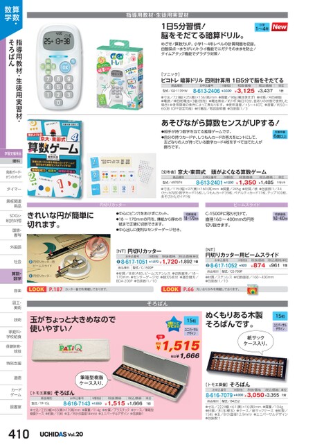 指導用教材・生徒用実習材1日5分習慣!脳をそだてる暗算ドリル。めざせ!算数力UP。小学1〜4年レベルの計算問題を収録。自動採点→まちがいリトライ機能でニガテそのままを防止!タイムアタック機能でダラダラ対策!小学1〜4年[ソニック]ピコトレ暗算ドリル四則計算用1日5分で脳をそだてる商品種別型式/GS-1139-Wお申込番号8-613-2406M価税抜¥3,500税抜価格税込価格¥3,125¥3,437単位1台●寸法/72(幅)×25(奥)×136(高)mm●質量/98g(電池含まず)●材質/ABS樹脂●電源/単四乾電池×3個(別売)●電池寿命/約1年(毎日10分、音ありの状態で使用した場合)※使用環境の条件によって異なります。●使用温度/+5〜+40℃●音量/約50〜60dB(OFF設定可能)●付属品/取扱説明書●包装数:1/3あそびながら算数センスがUPする!●相手が持つ数字を当てる推理ゲームです。●自分の持つカードや、しつもんカードの答えをヒントにして、左どなりの人が持っている数字カード4枚をすべて当てた人が勝ちです。対象年齢6歳以上単位1セット[幻冬舎]京大・東田式頭がよくなる算数ゲーム商品種別型式/497874お申込番号M価税抜8-613-2401¥1,500税抜価格¥1,350税込価格¥1,485きれいな円が簡単に切れます。●円切りカッター用ビームスライド●円切りカッター●寸法/115幅)×27奥)×160高)mm●質量/245g●材質/紙●包装数:1/24〈セット内容〉数字カード16枚、しつもんカード39枚、ペナルティカード11枚、チップ100枚、あそびかたガイド1枚円切りカッタービームスライド●中心にピン穴をあけずにカット。●18〜170mmの円を、薄紙から厚めの紙まで正確に切断できます。●中心出しに便利なセンターゲージ付き。切断直径18〜170mmC-1500Pに取り付けて、直径160〜400mmの円を切り抜きます。切断直径160〜400mm[NT]円切りカッターお申込番号M価税抜税抜価格税込価格単位8-617-1051¥1,870¥1,720¥1,8921個●商品種別型式/C-1500P●材質/本体:ABS、ビーム:ステンレス●切断直径/18〜170mm●センターゲージ付●替刃5枚付●適合替刃/BDA-200P●包装数:1/10[NT]円切りカッター用ビームスライドお申込番号8-617-1052M価税抜¥920税抜価格¥874税込価格単位¥9611個●商品種別型式/CE-700P●材質/ステンレス●切断直径/160〜400mm●包装数:1/10P.187カッター替刃を掲載しております。P.66丸いおりがみを掲載しております。そろばん玉がちょっと大きめなので使いやすい!筆箱型樹脂ケース入り。[トモエ算盤]そろばん商品種別型式/TP-15Lお申込番号8-616-7143M価税抜¥1,860税抜価格¥1,515税込価格¥1,666単位1台●寸法/235幅)×65(奥)×17(高)mm●質量/114g●材質/プラスチック●ケース/筆箱型樹脂ケース●桁数/15桁●玉/大8寸(直径14mm)●ユニバーサルデザイン●包装数:115桁ユニバーサルデザイン1台税抜¥1,515税込¥1,666ぬくもりある木製そろばんです。15桁ユニバーサルデザイン紙サックケース入り。[トモエ算盤]そろばんお申込番号M価税抜税抜価格税込価格8-616-7079¥4,000¥3,050¥3,355単位1台商品種別型式/84252●寸法/222幅)×61奥)×16高)mm●質量/104g●材質/木(玉:樺玉)●ケース/紙サックケース●桁数/15桁●玉/8寸(直径12.9mm)●ユニバーサルデザイン●包装数:1算数・数学指導用教材・生徒用実習材・そろばん学習支援用品理科発表ボード・発表ボード・ホワイトボードタイマータイマー黒板関連黒板関連用品用品SDGs・SDG総合的な学習国語・国語書写書写外国語外国語社会社会算数・数学音楽音楽図工・図工美術美術技術技術家庭科・家庭科・学校給食学校給食保健体育・球技球技特別支援特別支道徳道徳カードカゲーム図書室図書室Vol.20