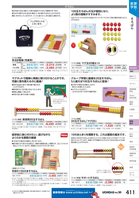 算数・数学そろばん学習支援用品理科発表ボード・発表ボード・ホワイトボードトタイマータイマー黒板関連黒板関連用品用品SDGs・DGs・総合的な学習習国語・語・書写写外国語国社会社会算数・数学音楽楽図工・工・美術術技術術家庭科・家庭科・学校給食校食保健体育・体球技技特別支援別道徳徳カードゲームム図書室書●玉を指で左右に動かして数の加減をそろばんの要領で学べます。●玉は木の鮮やかな2色(赤・黄色)で、色の数でも学ぶことができます。●取っ手が付いていますので、フックに掛けたり、持ち運びに便利です。バッグ付セットもございます。そろばん100玉そろばんの玉が個別になり、より数の理解がすすみます。玉はマグネット付きなので自由にホワイトボードに付けて数の概念を教えることができます。使用例マグネット付き[トモエ算盤]百玉計数器(児童用)商品種別お申込番号型式/TS-100N型式/AB100SB本体バッグ付●寸法/250(幅)×260(奥)×60(高)mm●材質/木●質量/本体:450g、バッグセット:650g●包装数:1/10¥2,315¥2,546¥2,485¥2,7338-616-70118-616-7321¥3,0001セットM価税抜¥2,800税抜価格税込価格単位1台[トモエ算盤]マグ玉20個セット商品種別お申込番号M価税抜8-616-7355¥3,600税抜価格¥3,060税込価格¥3,366単位1セット型式/MAGUSET(20個入)●寸法(1個)/30(縦)×40(横)×22(奥)mm●赤10個、黄10個●質量(1個)/5g●材質/白木・マグネット●包装数:1/10マグネットで簡単に黒板に取り付けることができ、児童に数を教えるのに最適!グループ学習に最適な20玉そろばん、5人揃えば100玉そろばんに変身!●両手を自由に使えて数を量で確かめることができます。●数を覚えたり玉の長さを比べたりします。●黒板と連動して使えます。●初歩の足し算・引き算にも最適。マグネット付なので、簡単に黒板に取り付けることができます。税抜価格¥8,420税込価格¥9,262単位1台[トモエ算盤]教授用20玉そろばん商品種別型式/MAGU980お申込番号8-616-7180M価税抜¥9,800●寸法/650(幅)×55(奥)×105(高)mm●質量/750g●材質/白木●マグネット付●包装数:1就学前に身に付けたい、遊びながらよくわかる算数の基礎●100までの数を玉を動かし見て学べます。●数の数え方や多少の比較など、算数の基礎を楽しく理解でき、玉とイラストの色もリンクしているので、視覚的にもわかりやすく学べます。[学研ステイフル]学研の100だまそろばん商品種別型式/83783お申込番号8-613-2414M価税抜¥4,700税抜価格税込価格¥4,465¥4,911単位1セット●寸法/260幅)×330(高)×50(奥)mm●質量/1.36kg●材質/本体:木(ブナ、シナベニヤ)、玉:ABS樹脂、バー:ステンレス、ガイドブック・おけいこシート・イラスト数字カード:紙(PPコート)●包装数:1/6〈セット内容〉本体、ガイドブック、おけいこシート2枚(両面印刷):足し算/引き算・1〜10/無地、カード32枚(両面印刷):数字/イラストカード・予備カード●20までの数を玉を動かしながら数えたり計算したりします。●マグネットで20ずつ、20・40・60・80・100まで連結可能!連結例[トモエ算盤]20玉そろばん「マグ20」商品種別型式/MAGU20税込価格¥1,672●寸法/255(幅)×45(奥)×40(高)mm●質量/120g●材質/白木●包装数:18-616-7150¥1,520M価税抜¥1,800お申込番号税抜価格単位1台10のまとまりを理解する。これは算数の基本です。従来の100玉そろばんより色のコントラストを強くすることで玉の1つ1つが見やすくなっています。指使いが不得意な子どもでも100玉と同じような感覚を養うことができます。玉の両サイドが黒いため、玉がハッキリ認識できます。[トモエ算盤]サポートそろばん商品種別型式/SUP10お申込番号8-616-7326M価税抜¥2,800税抜価格¥2,380税込価格¥2,618単位1台●寸法/340(幅)×70(奥)×70(高)mm●質量/190g●包装数:1/10※カタログに掲載の商品情報(仕様・価格・税率など)は変更になる場合がございます。最新情報はUCHIDASww.uchidas.netwへ!Vol.20