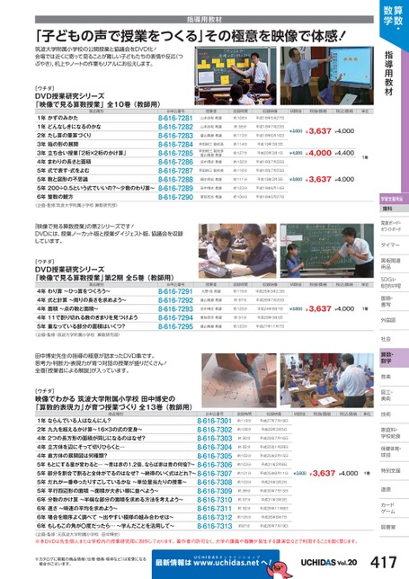 算数・数学指導用教材学習支援用品理科発表ボード・発表ボード・ホワイトボードトタイマータイマー黒板関連黒板関連用品用品SDGs・DGs・総合的な学習習国語・語・書写写外国語国社会社会算数・数学音楽楽図工・工・美術術技術術家庭科・家庭科・学校給食校食保健体育・体球技技特別支援別道徳徳カードゲームム図書室書指導用教材「子どもの声で授業をつくる」その極意を映像で体感!筑波大学附属小学校の公開授業と協議会をDVD化!会場では近くに寄って見ることが難しい子どもたちの表情や反応(つぶやき)、机上やノートの作業もリアルにお伝えします。[ウチダ]DVD授業研究シリーズ「映像で見る算数授業」全10巻(教師用)商品種別1年かずのみかた1年どんなしきになるのかな2年たし算の筆算づくり3年箱の形の展開3年立ち合い授業「2桁×2桁のかけ算」4年まわりの長さと面積5年式で表す・式をよむ5年数と図形の不思議5年200÷0.5という式でいいの?〜少数のわり算〜6年整数の観方お申込番号8-616-72818-616-72828-616-72838-616-72848-616-72858-616-72868-616-72878-616-72888-616-72898-616-7290〈企画・監修:筑波大学附属小学校算数研究部〉「映像で見る算数授業」の第2シリーズです!DVDには、授業ノーカット版と授業ダイジェスト版、協議会を収録しています。[ウチダ]DVD授業研究シリーズ「映像で見る算数授業」第2期全5巻(教師用)商品種別4年わり算〜ひっ算をつくろう〜4年式と計算〜周りの長さを求めよう〜4年面積〜点の数と面積〜4年11で割り切れる数のきまりを見つけよう5年重なっている部分の面積はいくつ?お申込番号8-616-72918-616-72928-616-72938-616-72948-616-7295授業者山本良和教諭収録時間約108分収録映像M価税抜税抜価格税込価格単位平成18年5月27日山本良和教諭約95分平成18年7月23日盛山隆雄教諭約113分平成18年6月16日¥3,800¥3,637¥4,000坪田耕三副校長坪田耕三副校長盛山隆雄教諭田中博史教諭約114分約127分平成19年3月3日平成20年3月1日¥4,200¥4,000¥4,400約132分平成18年7月22日1巻坪田耕三副校長約116分平成18年7月23日細水保宏教諭約111分平成19年3月3日田中博史教諭約123分平成19年6月14日夏坂哲志教諭約106分平成18年5月27日¥3,800¥3,637¥4,000授業者大野桂教諭収録時間約116分収録映像M価税抜税抜価格税込価格単位平成25年3月2,3日盛山隆雄教諭約87分平成26年7月20日田中博史教諭約125分平成24年8月7日夏坂哲志教諭約91分平成29年3月5日盛山隆雄教諭約123分平成27年11月7日¥3,800¥3,637¥4,0001巻〈企画・監修:筑波大学附属小学校算数研究部〉田中博史先生の指導の極意が詰まったDVD集です。思考力・判断力・表現力が育つ対話の授業が盛りだくさん!全巻「授業者による解説」が入っています。[ウチダ]映像でわかる筑波大学附属小学校田中博史の「算数的表現力」が育つ授業づくり全13巻(教師用)商品種別お申込番号8-616-73011年ならんでいる人はなんにん?8-616-73022年九九を超えるかけ算〜16×3の式の変身〜8-616-73034年2つの長方形の面積が同じになるのはなぜ?8-616-73044年立方体を辺にそって切りひらくと…8-616-73054年直方体の展開図は何種類?5年もとにする量が変わると…〜青は赤の1.2倍、ならば赤は青の何倍?〜8-616-73065年部分を割合で割ると全体がでるのはなぜ?〜納得のいく式はどれ?〜8-616-73078-616-73085年だれが一番ゆったりすごしているかな〜単位量当たりの授業〜8-616-73095年平行四辺形の面積〜面積が大きい順に並べよう〜8-616-73106年分数のかけ算〜半端な部分の面積を求める方法を考えよう〜8-616-73116年速さ〜時速の平均を求めよう〜8-616-73126年場合を順序よく調べて〜出やすい模様の組み合わせは〜8-616-73136年もしもこの角が〇度だったら…〜学んだことを活用して〜収録時間約119分収録映像M価税抜税抜価格税込価格単位平成27年7月18日約108分平成29年3月5日約90分約82分平成29年7月16日平成25年1月28日約102分平成25年2月15日約103分平成31年2月8日約101分平成25年8月11日¥3,800¥3,637¥4,0001巻約103分平成25年3月2日約99分約97分約92分平成30年7月15日平成31年3月3日平成26年11月8日約105分平成26年8月7日約97分平成26年7月19日〈企画・監修:元筑波大学附属小学校田中博史〉※本DVDは先生個人または学校内の授業研究用に制作しております。著作者の許可なく、大学の講義や報酬が発生する講演会などで利用することを固く禁じます。※カタログに掲載の商品情報(仕様・価格・税率など)は変更になる場合がございます。最新情報はUCHwIDASww.uchidas.netへ!Vol.20
