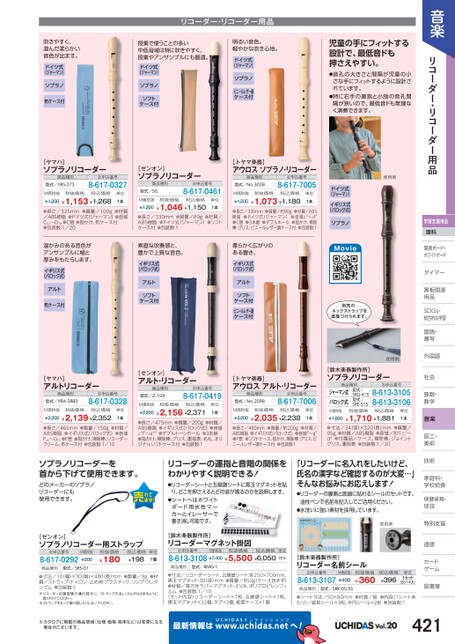 音楽リコーダー・リコーダー用品学習支援用品理科発表ボード・発表ボード・ホワイトボードトタイマータイマー黒板関連黒板関連用品用品SDGs・DGs・総合的な学習習国語・語・書写写外国語国社会社会算数・数・数学学音楽図工・工・美術術技術術家庭科・家庭科・学校給食校食保健体育・体球技技特別支援別道徳徳カードゲームム図書室書児童の手にフィットする設計で、最低音ドも押さえやすい。●音孔の大きさと間隔が児童の小さな手にフィットするように設計されています。●特に右手の薬指と小指の音孔間隔が狭いので、最低音ドも無理なく演奏できます。ドイツ式(ジャーマン)イギリス式(バロック式)ソプラノMovie別売のネックストラップを直接つけられます。使用例使用例[鈴木楽器製作所]ソプラノリコーダー商品種別ジャーマン式バロック式型式/SRG-415型式/SRE-515税抜価格お申込番号8-613-31058-613-3106吹きやすく、澄んだ柔らかい音色が出ます。ドイツ式(ジャーマン)ソプラノ布ケース付リコーダー・リコーダー用品授業で使うことの多い中低音域は特に吹きやすく、授業やアンサンブルにも最適。ドイツ式(ジャーマン)ソプラノソフトケース付明るい音色。軽やかな吹き心地。ドイツ式(ジャーマン)ソプラノビニールレザー調ケース付[ヤマハ]ソプラノリコーダー商品種別型式/YRS-273お申込番号8-617-0327M価税抜¥1,200税抜価格税込価格¥1,153¥1,268単位1本●長さ/325mm●質量/100g●材質/ABS樹脂●ドイツ式(ジャーマン)●音域C52〜D78●C管●指かけ、布ケース付●包装数:1/20[ゼンオン]ソプラノリコーダー商品種別型式/SGお申込番号8-617-0461M価税抜¥1,200税抜価格税込価格¥1,046¥1,150単位1本●長さ/330mm●質量/89g●材質/ABS樹脂●ドイツ式(ジャーマン)●ソフトケース付●包装数:1温かみのある音色がアンサンブルに幅と厚みをもたらします。イギリス式(バロック式)アルト布ケース付素直な吹奏感と、豊かで上質な音色。イギリス式(バロック式)アルトソフトケース付[ヤマハ]アルトリコーダー商品種別型式/YRA-28B3お申込番号8-617-0328M価税抜¥2,200税抜価格税込価格¥2,139¥2,352単位1本●長さ/465mm●質量/150g●材質/ABS樹脂●イギリス式(バロック式)●音域F45〜G71●F管●指かけ、掃除棒、リコーダークリーム、布ケース付●包装数:1/10[ゼンオン]アルト・リコーダー商品種別型式/Z-10Aお申込番号8-617-0419M価税抜¥2,200税抜価格税込価格¥2,156¥2,371単位1本●長さ/475mm●質量/200g●材質/ABS樹脂●イギリス式(バロック式)●音域/f1〜a♭3●ダブルトーンホール●3本継●指かけ、掃除棒、グリス、運指表、名札、オリジナルソフトケース付●包装数:1[トヤマ楽器]アウロスソプラノ・リコーダー商品種別型式/No.302Bお申込番号8-617-7005M価税抜¥1,200税抜価格税込価格¥1,073¥1,180単位1本●長さ/330mm●質量/約90g●材質/ABS樹脂●ドイツ式(ジャーマン)●音域c2〜d4●C管●3本継●ダブルホール●指かけ、掃除棒、グリス、ビニールレザー調ケース付●包装数:1柔らかく広がりのある響き。イギリス式(バロック式)アルトソフトケース付ビニールレザー調ケース付[トヤマ楽器]アウロスアルト・リコーダー商品種別型式/No.209Bお申込番号8-617-7006M価税抜¥2,200税抜価格税込価格¥2,035¥2,238単位1本M価税抜¥1,800税込価格¥1,710¥1,881単位1本●長さ/480mm●質量/約200g●材質/ABS樹脂●イギリス式(バロック式)●音域f1〜g3●F管●ソフトケース、指かけ、掃除棒、グリス、ビニールレザー調ケース付●包装数:1●寸法/34(径)×320(長)mm●質量/95g●材質/ABS樹脂●音域/8穴c2〜d4●付属品/ケース、掃除棒、ジョイントグリス、運指表●包装数:1/20ソプラノリコーダーを首から下げて使用できます。リコーダーの運指と音階の関係をわかりやすく説明できる!どのメーカーのソプラノリコーダーにも使用できます。●リコーダーシートと五線譜シートに黒玉マグネットを貼り、どこを押さえるとどの音が鳴るのかを説明します。●シートへはホワイトボード用水性マーカーとイレーサーで書き消し可能です。[ゼンオン]ソプラノリコーダー用ストラップお申込番号8-617-0292M価税抜¥200商品種別型式/SRS-01税抜価格¥180税込価格¥198単位1個●寸法/10幅)×30(奥)×480(長)mm●質量/9g●材質/ストラップ:ナイロン、止め具:プラスチック、リング:ウレタンゴム●包装数:1※リコーダーの頭部管の溝の部分に、ストラップの丸いゴムがはさまるように取り付けてください。※ストラップをもって振り回したりしないでください。[鈴木楽器製作所]リコーダーマグネット掛図お申込番号M価税抜税抜価格税込価格8-613-3108¥7,400¥5,500¥6,050単位1セット商品種別型式/RMG-1●寸法/リコーダーシート、五線譜シート:各250×700mm、黒玉マグネット:30(径)mm●質量/852g(ケース含まず)●材質/等方性ラバーマグネット、EVA、ポリプロピレンフィルム●包装数:1/10〈セット内容〉リコーダーシート×1枚、五線譜シート×1枚、黒玉マグネット×32個、タグ×2個、紙管ケース×1個※カタログに掲載の商品情報(仕様・価格・税率など)は変更になる場合がございます。最新情