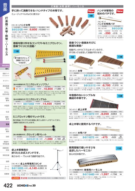 [ゼンオン]ハンド木琴用バチ商品種別型式/4671090お申込番号8-613-3130M価税抜¥300税抜価格¥290税込価格¥319単位1本●寸法/24(径)×210(長)mm●質量/5g●材質/玉:水木材、柄:木製●包装数:1音楽づくり・音楽あそびに最適な楽器!音盤がしっかりビスで止まっているので、手で持っても安定して音盤が叩けます。8鍵ZX8K13鍵ZX13K[ゼンオン]木琴商品種別型式/ZX8Kお申込番号8-613-3114M価税抜¥5,600税抜価格¥4,820税込価格¥5,302単位1台●寸法/270(幅)×190(奥)×30(高)mm●質量/450g●幹音/8音(C52〜C64)●材質/音盤:Bカリン、枠:木製●付属品/バチ2本付、はってはがせるどれみシール●包装数:1商品種別型式/ZX13Kお申込番号8-613-3115M価税抜¥7,800税抜価格¥6,700税込価格¥7,370単位1台●寸法/420(幅)×218(奥)×30(高)mm●質量/700g●幹音/13音(C47〜E68)●材質/音盤:Bカリン、枠:木製●付属品/バチ2本付、はってはがせるどれみシール●包装数:1半音部のないシンプルな構成の木琴です。18鍵[ゼンオン]卓上木琴商品種別型式/180WAお申込番号M価税抜8-617-0272¥8,500税抜価格¥8,059税込価格¥8,864単位1台●寸法/620(幅)×237(奥)×35(高)mm●質量/1kg●幹音/18音(G47〜C76)●材質/音板材:ホワイトアッシュ●付属品/バチ2本付(ZXB-01)●包装数:1卓上木琴に使用するバチです。280mm[ゼンオン]木琴バチ商品種別型式/ZXB-01お申込番号8-617-0275M価税抜¥500税抜価格¥475税込価格¥522単位1組(2本入)●寸法/280(長)mm、24(玉の直径)mm●質量/16g●材質/柄:ラミン材、玉:水木材●包装数:1教育現場で使いやすさを追求したハーモニカ!安心の日本製です。15音[トンボ楽器製作所]教育用ハーモニカ商品種別お申込番号型式/1215K税込価格¥1,756●寸法/150(幅)×34(奥)×22(高)mm●質量/74g●音域/シングル15音●材質/本体:ABS樹脂、カバー:ステンレス●包装数:18-617-0480¥1,600¥1,597税抜価格M価税抜単位1個[ゼンオン]ハンド木琴お申込番号8-613-3129M価税抜¥9,800税抜価格税込価格¥9,600¥10,5601セット単位商品種別型式/4671000●寸法/186〜130(長)×26(幅)×40(高)mm●質量/530g●材質/音板:Bカリン●幹音/8音(C52〜C64)●付属品/バチ1本付、どれみシール●日本製●包装数:1音板を取り外せるコンパクトなミニグロッケン。音楽づくりに大活躍!13鍵使う音だけにして、演奏することができます。ソプラノお申込番号8-617-0333M価税抜¥12,000税抜価格税込価格¥10,800¥11,880単位1台商品種別型式/MSG-13値下[鈴木楽器製作所]ミニグロッケンソプラノ●音域/幹音:13音c3〜a4(C64〜A85)、派生音:3音f#3・b♭3・f#4●寸法/340(幅)×110奥)×28高)mm●質量/615g●材質/音板:スチール(取り外し可能)、本体:MDF+プライウッド●専用マレット(SP-105W)2本付●包装数:1/20[鈴木楽器製作所]ミニグロッケンアルト商品種別型式/MAG-13お申込番号8-617-0402M価税抜¥16,000税抜価格¥14,400税込価格¥15,840単位1台●音域/幹音:13音c2〜a3(C52〜A73)、派生音:3音f#2・b♭2・f#3●寸法/340(幅)×155奥)×40高)mm●質量/830g●材質/音板:スチール(取り外し可能)、本体:MDF+プライウッド●専用マレット(SP-105W)2本付●包装数:1/10ミニグロッケン用のマレットです。柄の両端にそれぞれABS樹脂と黒ゴム球のヘッドがついており、2種類の音色をたのしめます。[鈴木楽器製作所]グロッケン用マレット商品種別型式/SP-105Wお申込番号M価税抜8-613-3113¥1,200税抜価格¥1,080税込価格¥1,188単位1組(2本入)●寸法/250(長)mm、ABS樹脂:18(径)mm、黒ゴム球90°20(径)mm●質量/40g2本)●材質/ヘッド:ABS樹脂・黒ゴム球90°、柄:樹脂●MSG-13・MAG-13に付属●包装数:1卓上木琴専用の折りたたみ式スタンドです。高さは45〜75cmまで調節可能です。[ゼンオン]卓上木琴専用スタンドお申込番号M価税抜税抜価格税込価格8-617-0225¥4,300¥4,149¥4,563単位1個商品種別型式/Z-718●寸法/450〜750(高)mm、木琴載せ台:310幅)mm●質量/920g●材質/スチール●包装数:1/20P.418卓上木琴に貼れる「はってはがせるどれみシール」を掲載しております。黒板関連黒板関連用品用品SDGs・SDG総合的な学習国語・国語書写書写外国語外国語社会社会算数・算数数学数学音楽図工・図工美術美術技術技術家庭科・家庭科・学校給食学校給食保健体育・球技球技特別支援特別支道徳道徳カードカゲーム図書室図書室タイマータイマー使用例アルト422Vol.20手に持って演奏できる!ハンドタイプの木琴です。ミュージックベルのように使える!打楽器(木琴・鉄琴)・ハーモニカハンド木琴用の短めのバチです。210mm8鍵音楽打楽器(木琴・鉄琴)・ハーモニカ学習支援用品理科発表ボード・発表ボード・ホワイトボード