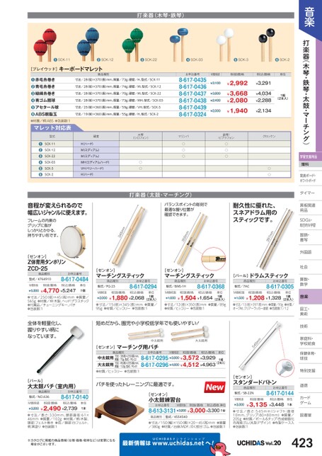 音楽打楽器(木琴・鉄琴・太鼓・マーチング)学習支援用品理科発表ボード・発表ボード・ホワイトボードトタイマータイマー黒板関連黒板関連用品用品SDGs・DGs・総合的な学習習国語・語・書写写外国語国社会社会算数・数・数学学音楽図工・工・美術術技術術家庭科・家庭科・学校給食校食保健体育・体球技技特別支援別道徳徳カードゲームム図書室書打楽器(木琴・鉄琴)●SCK-11●SCK-12●SCK-22●SCK-03●SCK-3●SCK-2寸法/28(径)×370長)mm、質量/73g、硬度/H、型式/SCK-11寸法/28(径)×370長)mm、質量/74g、硬度/M、型式/SCK-12寸法/28(径)×370長)mm、質量/70g、硬度/M、型式/SCK-22寸法/28(径)×370長)mm、質量/73g、硬度/MH、型式/SCK-03寸法/25(径)×360長)mm、質量/59g、硬度/VH、型式/SCK-3寸法/19(径)×360長)mm、質量/55g、硬度/H、型式/SCK-2お申込番号8-617-04358-617-04368-617-04378-617-04388-617-04398-617-0324M価税抜¥3,100¥3,800¥2,400¥2,000税抜価格税込価格単位¥2,992¥3,668¥2,080¥1,940¥3,291¥4,034¥2,288¥2,1341組(2本入)[プレイウッド]キーボードマレット商品種別材質/柄:ABS●包装数:1マレット対応表赤毛糸巻き青毛糸巻き緑綿糸巻き青ゴム扇球アセタール球ABS樹脂玉●●●●●●●グロッケン○○マリンバ○○○鉄琴/ビブラフォン○○○硬度H(ハード)M(ミディアム)M(ミディアム)MH(ミディアムハード)VH(ベリーハード)H(ハード)木琴(シロフォン)○○型式SCK-11SCK-12SCK-22SCK-03SCK-3SCK-2●●●●●●mm793耐久性に優れた、スネアドラム用のスティックです。打楽器(太鼓・マーチング)バランスポイントの彫刻で最適な握り位置が確認できます。mm053mm543音程が変えられるので幅広いジャンルに使えます。フレームの内側のグリップに指がしっかりとかかる、持ちやすい形です。[ゼンオン]Z体育用タンボリンZCD25商品種別型式/4764910お申込番号8-617-0484M価税抜¥5,300税抜価格税込価格¥4,770¥5,247単位1個●寸法/250(径)×45(高)mm●質量/565g●材質/枠:木製、ヘッド:プラスチック●付属品/チューニングキー、バチ●包装数:1全体を軽量化し、握りやすい柄になっています。[ゼンオン]マーチングスティック[ゼンオン]マーチングスティック[パール]ドラムスティック商品種別型式/PG-23お申込番号8-617-0294商品種別型式/BMS-1Hお申込番号8-617-0368商品種別型式/7ACお申込番号8-617-0305M価税抜¥2,000税抜価格税込価格¥1,880¥2,068(2本入)●寸法/15(径)×345(長)mm●質量/95g●材質/ヒッコリー●包装数:1単位1組M価税抜¥1,600税抜価格税込価格¥1,504¥1,654(2本入)●寸法/12(径)×350(長)mm●質量/89g●材質/ヒッコリー●包装数:1単位1組M価税抜¥1,500税抜価格税込価格¥1,208¥1,328(2本入)●寸法/13径)×397(長)mm●質量/93g●材質/オーク材、クリアーラッカー塗装●包装数:1/12単位1組短めだから、園児や小学校低学年でも使いやすい![ゼンオン]マーチング用バチ商品種別質量/75g、型式/PG-22中太鼓用寸法/28(径)250長)mm、大太鼓用寸法/45(径)255長)mm、●材質/ヒッコリー●包装数:1質量/123g、型式/PG-01中太鼓用大太鼓用お申込番号M価税抜税抜価格税込価格8-617-0295¥3,800¥3,572¥3,9298-617-0296¥4,800¥4,512¥4,9631組(2本入)545mm単位[パール]大太鼓バチ(室内用)商品種別型式/NO.636お申込番号8-617-0140M価税抜税抜価格税込価格¥3,200¥2,490¥2,739単位1本●寸法/長さ:330mm、頭部直径:61×46mm●質量/102g●材質/柄:木製、頭部:フェルト巻き●色/頭部:白フェルト、柄:黒塗り●包装数:1バチを使ったトレーニングに最適です。[ゼンオン]小太鼓練習台お申込番号M価税抜税抜価格税込価格単位8-613-3131¥3,200¥3,000¥3,3001台商品種別型式/4554540●寸法/150(幅)×150奥)×20〜45(高)mm/380g●質量●材質/台座:MDF、叩く部分:ゴム●包装数:1[ゼンオン]スタンダードバトン商品種別型式/SB-22Nお申込番号8-617-0144M価税抜¥3,300税抜価格税込価格¥3,135¥3,448単位1本●寸法/長さ:545mm(シャフト:直径10mm、グリップ:80×80mm)●質量/205g●材質/ボール&チップ:合成樹脂化合高級ゴム(丸型デザイン)●布製ケース入●包装数:1※カタログに掲載の商品情報(仕様・価格・税率など)は変更になる場合がございます。最新情報はUCHIDASww.uchidas.netwへ!Vol.20