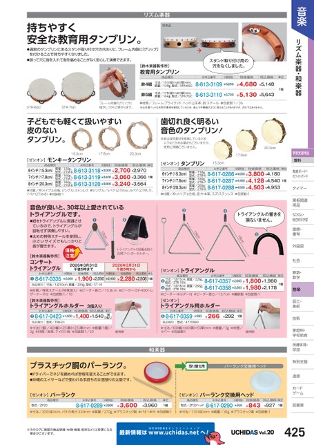 音楽リズム楽器・和楽器学習支援用品理科発表ボード・発表ボード・ホワイトボードトタイマータイマー黒板関連黒板関連用品用品SDGs・DGs・総合的な学習習国語・語・書写写外国語国社会社会算数・数・数学学音楽図工・工・美術術技術術家庭科・家庭科・学校給食校食保健体育・体球技技特別支援別道徳徳カードゲームム図書室書●寸法(1個)/40幅)×25(奥)×25厚)mm●質量(1個)/2g●材質/皮革、ナイロン紐●包装数:1/20使用例●寸法/60(幅)×60(奥)×5厚)mm●質量/3g●材質/ラバー●包装数:1使用例プラスチック胴のパーランク。●ドライバーでネジを締めれば音程を変えることができます。●沖縄のエイサーなどで使われる手持ちの片面張りの太鼓です。和楽器取り替え用パーランク交換用ヘッド[ゼンオン]パーランク商品種別型式/ZP20お申込番号M価税抜8-617-0289¥3,900税抜価格¥3,600税込価格¥3,960単位1組[ゼンオン]パーランク交換用ヘッド商品種別型式/ZP20ヘッドお申込番号8-617-0290M価税抜¥950税抜価格¥843税込価格単位¥9271個●寸法/200(径)mm、バチの長さ:330mm●質量/270g●プラスチック胴●バチ1本付●包装数:1●寸法/170(径)mm●質量/30g●プラスチック胴●包装数:1※カタログに掲載の商品情報(仕様・価格・税率など)は変更になる場合がございます。最新情報はUCHIDASww.uchidas.netwへ!Vol.20リズム楽器従来品持ちやすく安全な教育用タンブリン。●通常のタンブリンにあるスタンド取り付け穴の代わりに、フレーム内側に「グリップ」を付けることで持ちやすくなりました。●誤って穴に指を入れて指を痛めることがなく安心して演奏できます。スタンド取り付け用の穴をなくしました。[鈴木楽器製作所]教育用タンブリン商品種別鈴4組寸法/153(径)×40(厚)mm、質量/139g、型式/STR-6GC8-613-3109お申込番号M価税抜¥5,200税抜価格¥4,680税込価格¥5,148単位1個STR-6GCSTR-7GCフレーム内側のグリップに指がしっかりと掛かります。●材質/フレーム:プライウッド、ヘッド:山羊革、鈴:スチール●包装数:1/36※山羊革ヘッドは天然の素材を使用しているため、色ムラや模様のように見えることがありますが、汚れではありません。鈴5組寸法/178(径)×40(厚)mm、質量/164g、型式/STR-7GC8-613-3110¥5,700¥5,130¥5,643子どもでも軽くて扱いやすい皮のないタンブリン。歯切れ良く明るい音色のタンブリン!※皮は自然素材を使用しているためムラなどがある場合もございますが、使用上問題ございません。20.3cm17.8cm[ゼンオン]タンブリン商品種別15.3cmお申込番号M価税抜税抜価格税込価格型式/ZTB-66インチ(15.3cm)質量/130g、7インチ(17.8cm)質量/180g、8インチ(20.3cm)質量/200g、●材質/枠:メイプル合板、皮:牛本革、スズ:ステンレス●包装数:18-617-0286¥4,000¥3,800¥4,1808-617-0287¥4,400¥4,128¥4,5408-617-0288¥4,800¥4,503¥4,953型式/ZTB-7型式/ZTB-8単位1個●●トライアングルの響きを損ないません。15cm●18cmお申込番号M価税抜税抜価格税込価格8-617-0357¥2,000¥1,800¥1,9808-617-0358¥2,200¥1,980¥2,178単位1個寸法/1辺15cm、質量/228g、型式/ZTR-15N寸法/1辺18cm、質量/266g、型式/ZTR-18N●●商品種別[ゼンオン]トライアングル●ビーター・ホルダー付●ビーター長さ/13.7cm●鋼鉄製●包装数:1[ゼンオン]トライアングル用ホルダーお申込番号8-617-0359M価税抜¥280税抜価格¥266税込価格単位¥2921個●商品種別型式/477099015.3cm17.8cm20.3cm[ゼンオン]モンキータンブリン商品種別お申込番号M価税抜税抜価格税込価格単位型式/ZTM-68-613-3118¥3,000¥2,700¥2,970型式/ZTM-78-613-3119¥3,400¥3,060¥3,366型式/ZTM-88-613-3120¥3,800¥3,240¥3,5646インチ(15.3cm)質量/120g、7インチ(17.8cm)質量/160g、8インチ(20.3cm)質量/180g、●材質/枠:メイプル合板、ジングル:ステンレス●ジングル/5ペア(ZTM-6)、6ペア(ZTM-7)、7ペア(ZTM-8)●包装数:11個音色が良いと、30年以上愛されているトライアングルです。●●●紐をトライアングルに貫通させているので、トライアングルが回転せず演奏しやすい。●太めの特殊スチールを使用し、小さいサイズでもしっかりと音が響きます。[鈴木楽器製作所]コンサートトライアングル10cmトライアングルの回転を防ぐ汎用フィンガーホルダー。2026年3月31日午後5時まで2026年3月31日午後5時からお申込番号8-617-0335M価税抜税抜価格税込価格M価税抜税抜価格税込価格単位¥2,000¥1,900¥2,090¥2,400¥2,280¥2,5081個寸法/1辺10cm、質量/204g、型式/ST-10●商品種別●材質/特殊スチール(特殊焼入)●ビーター長さ/15.8cm●ビーター(SP-400)・レザーケース付●包装数:1/10[鈴木楽器製作所]トライアングルホルダー3個入りお申込番号M価税抜税抜価格税込価格8-617-0423¥1,500¥1,400¥1,540単位1組(3個入)●商品種別型式/TRH-01