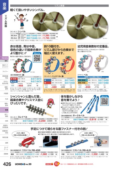 軽くて扱いやすいシンバル。リズム楽器[ゼンオン]シンバル商品種別お申込番号M価税抜税抜価格税込価格20.3cm25.4cm●寸法/1(高)mm●材質/真ちゅう●付属品/手革、フェルト・パッド●包装数:18-617-0445¥12,0008-617-0446¥14,000¥11,280¥12,408¥11,760¥12,936質量/570g2枚)、型式/CM-8質量/860g2枚)、型式/CM-1020.3cm単位1組25.4cm赤は高音、青は中音。音色の違いで器楽合奏がより豊かに!!Movie角のない設計で安心して使えます。赤(高音)鈴10個付き。リズム遊びから合奏まで幅広く使えます。幼児用音楽教材の定番品。切れのよいリズム、ソフトからシャープまでの美しい響きのベルです。[ゼンオン]スレイベル商品種別型式/125Sお申込番号M価税抜8-617-0442¥4,000税抜価格¥3,200税込価格¥3,520単位1個●寸法/80(幅)×80(奥)×360(高)mm●質量/350g●材質/鈴:スチール、柄:木●鈴25個●包装数:1小さい鈴のRB-4SBは高音!手足につけて鳴らせる面ファスナー付きの鈴!●他の楽器の演奏時にも簡単に鈴の音を加えられます。●手で握らないので、握力が弱くても鈴の演奏を楽しめます。大きい鈴のRB-4LBは中音!使用例使用例[鈴木楽器製作所]リストベルRB-4SB商品種別お申込番号税抜価格型式/RB-4SB高音●寸法/290(長)×30(高)mm●質量/60g●材質/ベルト:ナイロン(面ファスナー付)●ベル(小)4個●音域/高音●包装数:18-613-3111¥1,080税込価格¥1,188単位1個M価税抜¥1,200[鈴木楽器製作所]リストベルRB-4LB商品種別お申込番号税抜価格型式/RB-4LB中音●寸法/290(長)×30(高)mm●質量/110g●材質/ベルト:ナイロン(面ファスナー付)●ベル(大)4個●音域/中音●包装数:18-613-3112¥1,350税込価格¥1,485単位1個M価税抜¥1,500Vol.20はメーカーの価格改定により、販売価格が変更になります。[鈴木楽器製作所]商品種別鈴赤(高音)型式/SRB-30青(中音)型式/SRB-40青(中音)お申込番号8-617-04738-617-0474M価税抜¥520税抜価格¥468税込価格¥514単位1個●寸法/赤:110(幅)×90奥)×50(高)mm、青:110(幅)×90(奥)×55高)mm●質量/赤:53g、青:60g●材質/ABS、スチール●鈴10個●包装数:1/20シャンシャンと澄んだ音。器楽合奏やクリスマス会にぴったりです。青赤M価税抜¥500青赤[ゼンオン]ハンドベル鈴商品種別型式/ZHB-10SBLU型式/ZHB-10SREDお申込番号8-617-04218-617-0422青色黄色[ヤマハ]ベル在庫無次第終了商品商品種別青色(高音)黄色(中音)型式/YBR-318型式/YBR-32122お申込番号8-617-04598-617-0460税抜価格¥460税込価格¥506単位1個M価税抜¥670税抜価格¥650税込価格¥715単位1個●寸法/87(幅)×87(奥)×46(高)mm●質量/46g●材質/ポリプロピレン、ステンレス●鈴10個●包装数:1/20●寸法/100幅)×50奥)×85高)mm●質量/68g●材質/ポリプロピレン、ステンレス●鈴10個●包装数:1体を動かしながら音を奏でよう♪●全長190cmのベルトに、等間隔でベル(小)が11個付いています。●何人かでベルトを持って振って音を鳴らしたり、面ファスナーをつなげて大きな輪にしたりして楽しむことができます。[鈴木楽器製作所]サークルベル商品種別型式/RB-11SBお申込番号M価税抜8-617-0406¥3,000Movie税抜価格¥2,819税込価格¥3,100単位1個●寸法/1900(長)×30(高)mm●質量/190g●材質/ベル:スチール、ベルト:ナイロン●ベル(小)11個●面ファスナー付●包装数:1音楽リズム楽器学習支援用品理科発表ボード・発表ボード・ホワイトボードタイマータイマー黒板関連黒板関連用品用品SDGs・SDG総合的な学習国語・国語書写書写外国語外国語社会社会算数・算数数学数学音楽図工・図工美術美術技術技術家庭科・家庭科・学校給食学校給食保健体育・球技球技特別支援特別支道徳道徳カードカゲーム図書室図書室