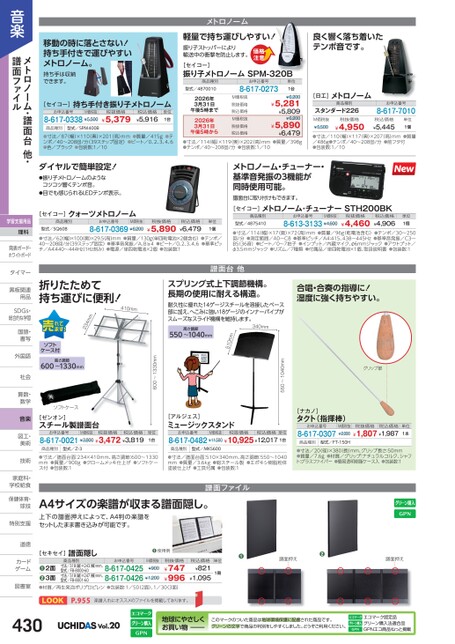 移動の時に落とさない!持ち手付きで運びやすいメトロノーム。持ち手は収納できます。[セイコー]お申込番号持ち手付き振り子メトロノーム8-617-0338¥5,500M価税抜税抜価格¥5,379税込価格¥5,916単位1台商品種別型式/SPM400B●寸法/87(幅)×110(奥)×201(高)mm●質量/415g●テンポ/40〜208回/分(39ステップ固定)●ビート/0、2、3、4、6●色/ブラック●包装数:1/10ダイヤルで簡単設定!●振り子メトロノームのようなコツコツ響くテンポ音。●目でも感じられるLEDテンポ表示。[セイコー]クォーツメトロノーム商品種別型式/SQ60Bお申込番号M価税抜8-617-0369¥6,200税抜価格¥5,890税込価格¥6,479単位1個●寸法/62幅)×100奥)×29.5高)mm●質量/130g単四乾電池×2個含む)●テンポ/40〜208回/分(39ステップ固定)●基準音発振/A、B♭4●ビート/0、2、3、4、6●基準ピッチ/A4:440〜444Hz(1Hz刻み)●電源/単四乾電池×2個●包装数:1メトロノーム軽量で持ち運びしやすい!振り子ストッパーにより輸送中の衝撃を防止します。良く響く落ち着いたテンポ音です。[セイコー]振り子メトロノームSPM-320B商品種別型式/4870010お申込番号8-617-02732026年3月31日午後5時までM価税抜税抜価格税込価格M価税抜税抜価格税込価格¥5,281¥5,809¥6,200¥5,890¥6,479●寸法/114(幅)×119(奥)×202(高)mm●質量/398g●テンポ/40〜208回/分●包装数:1/102026年3月31日午後5時から単位1台¥6,200[日工]メトロノーム商品種別スタンダード226M価税抜¥5,500税抜価格¥4,950お申込番号8-617-7010税込価格¥5,445単位1個●寸法/110幅)×117(奥)×207高)mm●質量/486g●テンポ/40〜208回/分●前フタ付●包装数:1/10メトロノーム・チューナー・基準音発振の3機能が同時使用可能。譜面台に取り付けもできます。[セイコー]メトロノーム・チューナーSTH200BK商品種別型式/4875410お申込番号M価税抜8-613-3133¥4,600税抜価格¥4,460税込価格¥4,906単位1個●寸法/114(幅)×17(奥)×72高)mm●質量/96g(乾電池含む)●テンポ/30〜250回/分●測定範囲/A0〜C8●基準ピッチ/A4:415、438〜445Hz●基準音発振/C3〜B5(36音)●ビート/0〜7拍子●インプット/内蔵マイク、φ6mmジャック●アウトプット/φ3.5mmジャック●リズム/7種類●付属品/単四乾電池×1個、取扱説明書●包装数:1グリップ部550〜1040mm合唱・合奏の指導に!湿度に強く持ちやすい。譜面台他スプリング式上下調節機構。長期の使用に耐える構造。耐久性に優れた14ゲージスチールを溶接したベース部に加え、へこみに強い18ゲージのインナーパイプがスムーズなスライド機構を維持します。340mm510mm高さ調節550〜1040mm[アルジェス]ミュージックスタンドお申込番号M価税抜税抜価格税込価格単位8-617-0482¥11,500¥10,925¥12,0171台[ナカノ]タクト(指揮棒)お申込番号8-617-0307M価税抜¥2,00税抜価格税込価格¥1,807¥1,987単位1本商品種別型式/FT-150H●寸法/20径)×380長)mm、グリップ長さ:50mm●質量/7.6g●材質/グリップ:ナチュラルコルク、シャフト:グラスファイバー●簡易透明樹脂ケース入●包装数:1600〜1330mm単位1台折りたためて持ち運びに便利!410mmmm432ソフトケース付高さ調節600〜1330mmソフトケース[ゼンオン]スチール製譜面台お申込番号M価税抜税抜価格税込価格8-617-0021¥3,800¥3,472¥3,819商品種別型式/Z-3商品種別型式/MKS600●寸法/譜面台面:234×410mm、高さ調節:600〜1330mm●質量/900g●クロームメッキ仕上げ●ソフトケース付●包装数:1●寸法/譜面台面:510×340mm、高さ調節:550〜1040mm●質量/3.6kg●総スチール製●エポキシ樹脂粉体塗装仕上げ●工具付属●包装数:1A4サイズの楽譜が収まる譜面隠し。上下の譜面押えによって、A4判の楽譜をセットしたまま書き込みが可能です。譜面ファイル●譜面押え●譜面押えM価税抜¥900税抜価格¥747¥996税込価格¥821¥1,095単位1冊商品種別お申込番号寸法/318(縦)×243横)mm、型式/FB-8000-60寸法/318(縦)×247横)mm、型式/FB-8001-608-617-04258-617-0426¥1,2002面3面●●[セキセイ]譜面隠し❶使用例●材質/再生発泡ポリプロピレン●包装数:1/502面)、1/30(3面)P.955楽譜入れにオススメのファイルを掲載しております。430Vol.20地球にやさしくお買い物このマークのついた商品は地球環境保護に配慮された商品です。グリーンの文字で商品の判別をしやすくしました。どうぞご利用ください。エコマーク認定品グリーン購入法適合品GPNエコ商品ねっと掲載音楽メトロノーム・譜面台他・譜面ファイル学習支援用品理科発表ボード・発表ボード・ホワイトボードタイマータイマー黒板関連黒板関連用品用品SDGs・SDG総合的な学習国語・国語書写書写外国語外国語社会社会算数・算数数学数学音楽図工・図工美術美術技術技術家庭科・家庭科・学校給食学校給食保健体育・球技球技特別支援特別支道徳道徳カードカゲーム図書室図書室