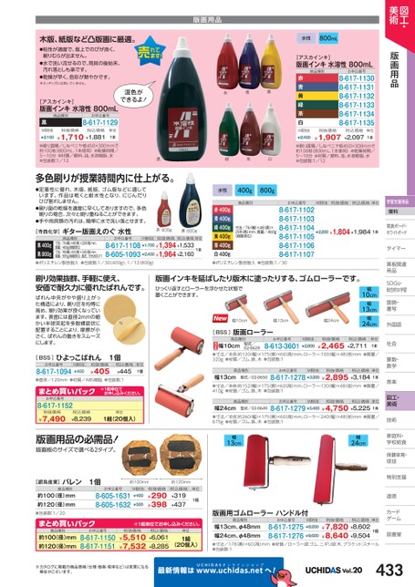 図工・美術版画用品学習支援用品理科発表ボード・発表ボード・ホワイトボードトタイマータイマー黒板関連黒板関連用品用品SDGs・DGs・総合的な学習習国語・語・書写写外国語国社会社会算数・数・数学学音楽楽図工・美術技術術家庭科・家庭科・学校給食校食保健体育・体球技技特別支援別道徳徳カードゲームム図書室書木版、紙版など凸版画に最適。水性800mL版画用品●粘性が適度で、版上でのびが良く、刷りむらが出ません。●水で洗い流せるので、用具の後始末、汚れ落としも楽です。●乾燥が早く、色彩が鮮やかです。※エッチングには向いていません。[アスカインキ]版画インキ水溶性800mL商品種別黒お申込番号8-617-1129混色ができるよ!赤青黄赤青黄緑茶白[アスカインキ]版画インキ水溶性800mL商品種別お申込番号8-617-11308-617-11318-617-11328-617-11338-617-11348-617-1135M価税抜¥2,150税抜価格税込価格¥1,710¥1,881単位1本●刷り面積/しなベニヤ板450×300mmで約100枚(800mL、1本使用)●乾燥時間/5〜10分●材質/顔料、油、水溶樹脂、水●包装数:1/12黒緑茶白M価税抜¥2,400税抜価格¥1,907税込価格¥2,097単位1本●刷り面積/しなベニヤ板450×300mmで約100枚(800mL、1本使用)●乾燥時間/5〜10分●材質/顔料、油、水溶樹脂、水●包装数:1/12多色刷りが授業時間内に仕上がる。●定着性に優れ、木版、紙版、ゴム版などに適しています。作品は乾くと耐水性となり、にじんだりひび割れしません。●刷り面の乾燥を適度に早くしてありますので、多色刷りの場合、次々と刷り重ねることができます。●手や用具類の汚れは、簡単に水で洗い落とせます。[寺西化学]ギター版画えのぐ水性茶400g黒800g商品種別お申込番号M価税抜税抜価格税込価格単位寸法/76幅)×48(奥)×208高)mm、質量/460g容器含む)寸法/98幅)×65(奥)×240高)mm、質量/895g容器含む)、型式/EHS800-T1黒400g黒800g●ポリエチレン製容器入●包装数:1/30400g)、1/12800g)8-617-1108¥1,700¥1,394¥1,5338-605-1093¥2,400¥1,964¥2,1601本水性400g800g商品種別お申込番号寸法/76(幅)×48(奥)×208(高)mm、質量/460g赤400g青400g緑400g黄400g茶400g白400g●ポリエチレン製容器入●包装数:1/308-617-11028-617-11038-617-11048-617-11058-617-11068-617-1107(容器含む)M価税抜税抜価格税込価格単位¥2,200¥1,804¥1,9841本刷り効果抜群、手軽に使え、安価で耐久力に優れたばれんです。ばれん中央がやや盛り上がった構造により、刷り圧を均等に高め、刷り効果が良くなっています。表面には直径2mmの細かい半球突起を多数螺旋状に配置することにより、摩擦が小さく、ばれんの動きをスムーズにします。[BSS]ひよっこばれん1個お申込番号8-617-1094M価税抜¥450税抜価格¥405税込価格¥445単位1個●直径/120mm●材質/ABS樹脂●包装数:1まとめ買いパック8-617-1152お申込番号税抜価格¥7,490税込価格¥8,239※1組単位申込。単位1組(20個入)版画インキを延ばしたり版木に塗ったりする、ゴムローラーです。ひっくり返すとローラーを浮かせた状態で置くことができます。幅10cm幅13cm幅24cm幅10cm幅13cm幅24cm[BSS]版画ローラー商品種別お申込番号幅10cm単位1本●寸法/本体:約120幅)×175(奥)×60高)mm、ローラー:100幅)×48(径)mm●質量/320g●材質/ゴム、鉄、木●包装数:18-613-3601税込価格¥2,711¥2,465M価税抜¥2,800型式/02-0629税抜価格商品種別お申込番号M価税抜税抜価格税込価格単位型式/02-0650幅13cm●寸法/本体:約152幅)×175(奥)×60高)mm、ローラー:130幅)×48(径)mm●質量/410g●材質/ゴム、鉄、木●包装数:18-617-1278¥3,300¥2,895¥3,1841本商品種別お申込番号M価税抜税抜価格税込価格単位型式/02-0649幅24cm●寸法/本体:約260幅)×175(奥)×60高)mm、ローラー:240幅)×48(径)mm●質量/675g●材質/ゴム、鉄、木●包装数:18-617-1279¥5,400¥4,750¥5,2251本版画用品の必需品!版画板のサイズで選べる2タイプ。幅13cm幅24cm[銀鳥産業]バレン1個約100mmお申込番号8-605-16318-605-1632M価税抜¥400¥500税抜価格¥290¥398約120mm税込価格¥319¥437単位1個商品種別約100(径)mm約120(径)mm●包装数:1/20商品種別まとめ買いパック約100(径)mm約120(径)mm8-617-11508-617-1151お申込番号※1組単位申込。税抜価格¥5,510¥7,532税込価格¥6,061¥8,285単位1組(20個入)版画用ゴムローラーハンドル付商品種別お申込番号M価税抜税抜価格税込価格単位幅13cm、φ48mm幅24cm、φ48mm●寸法/178(奥)×60(高)mm●材質/ローラー部:ゴム、ニギリ部:木、ブラケット:スチール●包装数:1¥8,200¥7,820¥8,602¥9,600¥8,640¥9,5048-617-12758-617-12761個※カタログに掲載の商品情報(仕様・価格・税率など)は変更になる場合がございます。最新情報はUCHIDASww.uchidas.netwへ!Vol.20433