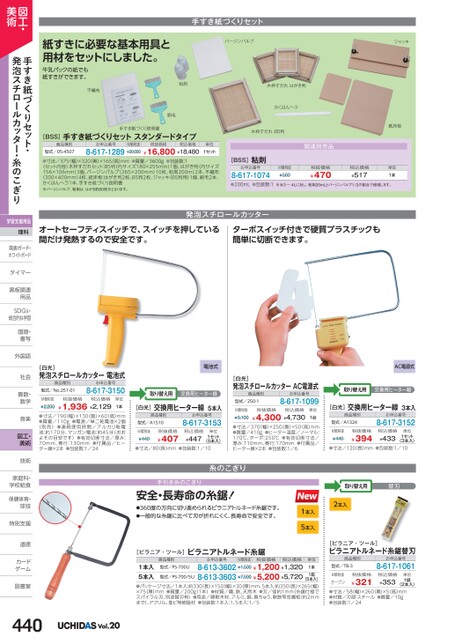 手すき紙づくりセットバージンパルプ紙すきに必要な基本用具と用材をセットにしました。牛乳パックの紙でも紙すきができます。不織布粘剤刷毛手すき紙づくり説明書[BSS]手すき紙づくりセットスタンダードタイプ商品種別型式/05-4507お申込番号8-617-1289M価税抜¥20,000税抜価格税込価格¥16,800¥18,480単位1セット●寸法/375(幅)×320(奥)×165(高)mm●質量/3600g●包装数:1〈セット内容〉木枠すだれセット:B5判(内サイズ180×255mm)1個、はがき判(内サイズ156×106mm)3個、バージンパルプ(265×200mm)10枚、粘剤200mL2本、不織布(300×400mm)4枚、紙床板:はがき判2枚、B5判2枚、ジャッキ(B5判用)1個、刷毛2本、かくはんヘラ1本、手すき紙づくり説明書※バージンパルプ、粘剤は、はがき約80枚分となります。ジャッキ紙床板木枠すだれはがき判かくはんヘラ木枠すだれB5判関連別売品[BSS]粘剤お申込番号8-617-1074M価税抜¥560税抜価格¥470税込価格¥517単位1本●200mL●包装数:1※水3〜4Lに対し、粘剤20mLとバージンパルプ1/2の割合で使用します。オートセーフティスイッチで、スイッチを押している間だけ発熱するので安全です。ターボスイッチ付きで硬質プラスチックも簡単に切断できます。発泡スチロールカッター[白光]発泡スチロールカッター電池式商品種別型式/No.251-01お申込番号8-617-3150M価税抜¥2,200税抜価格税込価格¥1,936¥2,129単位1本●寸法/190(幅)×130(奥)×60(高)mm●質量/110g●電源/単二乾電池×2個(別売)●連続使用時間/アルカリ乾電池:約170分、マンガン電池:約45分(おおよその目安です)●有効切断寸法/厚み:70mm、奥行:130mm●付属品/ヒーター線×2本●包装数:1/24電池式AC電源式取り替え用交換用ヒーター線[白光]交換用ヒーター線5本入商品種別型式/A1510M価税抜¥440税抜価格¥407お申込番号8-617-3153税込価格¥447単位1セット(5本入)●寸法/80(長)mm●包装数:1/10[白光]発泡スチロールカッターAC電源式商品種別型式/250-1お申込番号8-617-1099M価税抜¥5,100税抜価格税込価格¥4,300¥4,730単位1台●寸法/370(幅)×250(奥)×50(高)mm●質量/410g●ヒーター温度/ノーマル:170℃、ターボ:250℃●有効切断寸法/厚み:110mm、奥行:170mm●付属品/ヒーター線×2本●包装数:1/6糸のこぎり手引き糸のこぎり安全・長寿命の糸鋸!●360度の方向に切り進められるピラニアトルネード糸鋸です。●一般的な糸鋸に比べて刃が折れにくく、長寿命で安全です。取り替え用交換用ヒーター線[白光]交換用ヒーター線3本入商品種別型式/A1324M価税抜¥440税抜価格¥394お申込番号8-617-3152税込価格¥433単位1セット(3本入)●寸法/120(長)mm●包装数:1/10取り替え用替刃2本入1本入5本入[ピラニア・ツール]ピラニアトルネード糸鋸商品種別型式/PS-700Uお申込番号M価税抜税抜価格税込価格型式/PS-700/5U8-613-3602¥1,500¥1,200¥1,3208-613-3603¥7,500¥5,200¥5,7201本入5本入(5本入)●パッケージ寸法/1本入:約330(長)×150(幅)×30(厚)mm、5本入:約350長)×265幅)×75厚)mm●質量/200g1本)●材質/鋼、鉄、天然木●刃/径約1mm(糸鋸仕様でスパイラル刃、別途替刃有)●用途/硬軟木材、アルミ、銅、真ちゅう、軟鉄等金属板(約2mmまで)、アクリル、塩ビ等樹脂材●包装数:1本入:1、5本入:1/5単位1本1箱[ピラニア・ツール]ピラニアトルネード糸鋸替刃商品種別型式/TB-3お申込番号8-617-1061税抜価格¥321税込価格¥353M価税抜オープン●寸法/58(幅)×260(奥)×5(高)mm●材質/刃部:スチール●質量/10g●包装数:1/24単位1袋(2本入)図工・美術手すき紙づくりセット・発泡スチロールカッター・糸のこぎり学習支援用品理科発表ボード・発表ボード・ホワイトボードタイマータイマー黒板関連黒板関連用品用品SDGs・SDG総合的な学習国語・国語書写書写外国語外国語社会社会算数・算数数学数学音楽音楽図工・美術技術技術家庭科・家庭科・学校給食学校給食保健体育・球技球技特別支援特別支道徳道徳カードカゲーム図書室図書室440Vol.20