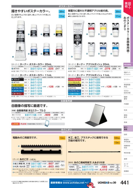図工・美術ポスターカラー・自画像用鏡・糸のこぎり学習支援用品理科発表ボード・発表ボード・ホワイトボードトタイマータイマー黒板関連黒板関連用品用品SDGs・DGs・総合的な学習習国語・語・書写写外国語国社会社会算数・数・数学学音楽楽図工・美術技術術家庭科・家庭科・学校給食校食保健体育・体球技技特別支援別道徳徳カードゲームム図書室書描きやすいポスターカラー。広い面積でもムラなく塗れ、美しいマット(つや消し)に仕上がります。20mL11mL被覆力に優れた不透明アクリル絵の具。●広い面積でもムラなく塗れ、美しいマット(つや消し)に仕上がります。●乾くと耐水性になります。20mL11mLポスターカラー●●●●●❿●●●●●●●●●[ターナー]ターナーポスターカラー20mL商品種別お申込番号税抜価格ホワイト●●材質/顔料、アラビアガム、水●容器/ラミネートチューブ●包装数:1/38-617-1214¥225型式/1M価税抜¥250税込価格¥247単位1本[ターナー]ターナーアクリルガッシュ20mL商品種別お申込番号税抜価格ホワイト●●材質/顔料、アクリル樹脂、水●容器/ラミネートチューブ●包装数:1/38-617-1221¥279型式/1-AM価税抜¥290税込価格¥306単位1本[ターナー]ターナーポスターカラー11mL[ターナー]ターナーアクリルガッシュ11mLM価税抜税抜価格税込価格単位¥140¥126¥1381本型式/21-A型式/10-A型式/9-A型式/1-A型式/52-A型式/51-Aお申込番号8-617-12228-617-12238-617-12248-617-12258-617-12268-617-1227商品種別パーマネントレッドパーマネントレモンジェットブラックホワイトコバルトブルー(ヒュー)スカイブルー●●●●●●¥140¥126¥1381本M価税抜税抜価格税込価格単位お申込番号8-617-12158-617-12168-617-12178-617-12188-617-12198-617-1220型式/58型式/1型式/2型式/32型式/31型式/17商品種別ブラックホワイトレモンイエローコバルトブルーセルリアンブルーカーマイン●●●●●●●材質/顔料、アラビアガム、水●容器/ラミネートチューブ●包装数:1/6●材質/顔料、アクリル樹脂、水●容器/ラミネートチューブ●包装数:1/6自画像の描写に最適です。[東亜]自画像用鏡折立ミラーTS-3商品種別型式/01-0160お申込番号8-617-1136M価税抜¥1,100税抜価格¥909自画像用鏡税込価格¥999単位1枚●寸法/外形:170縦)×125(横)×15厚)mm、鏡面:165(縦)×120横)×2(厚)mm●質量/205g●材質/ガラス、塩化ビニル●角度調節:2段階(約65°55°)●包装数:1/10P.610平面鏡を掲載しております。糸のこぎり電動糸のこ刃電動糸のこ用替刃です。12本入木工、金工、プラスチックに使用できる万能の替刃です。100本入12本入●●[BSS]糸のこ機械用替刃大あさり付き商品種別お申込番号型式/08-2041税込価格8-617-1171¥6438-617-1172¥4,900¥4,410¥4,85112本入100本入型式/(100本入)●寸法/1本:約150(長)×1.85(幅)×0.55(厚)mm、つかみしろ上部約30mm、下部約25mm、刃部約95mm●材質/刃物鋼●用途/木工、金工、プラスチック用●包装数:1¥585M価税抜¥650(12本入)税抜価格08-2101単位1袋1袋お申込番号8-617-10678-617-1075M価税抜¥1,020税抜価格¥907¥803税込価格¥997¥883単位1ダース(12本入)●●金工用●スリ目●寸法/150(長)×1.40(幅)×0.45(厚)mm●材質/刃物鋼●用途/¥900商品種別金工(厚板)用、スリ目切断能力/木工用、18山トビ目45mm●鉄鋼、真ちゅう、アルミ用●包装数:1●木工用●18山トビ目●寸法/150(長)×1.80(幅)×0.53(厚)mm●材質/刃物鋼●用途/木工用(目安厚10mm程度迄)●包装数:1[グッド]糸のこ刃(1打入)※カタログに掲載の商品情報(仕様・価格・税率など)は変更になる場合がございます。最新情報はUCHIDASww.uchidas.netwへ!Vol.20441