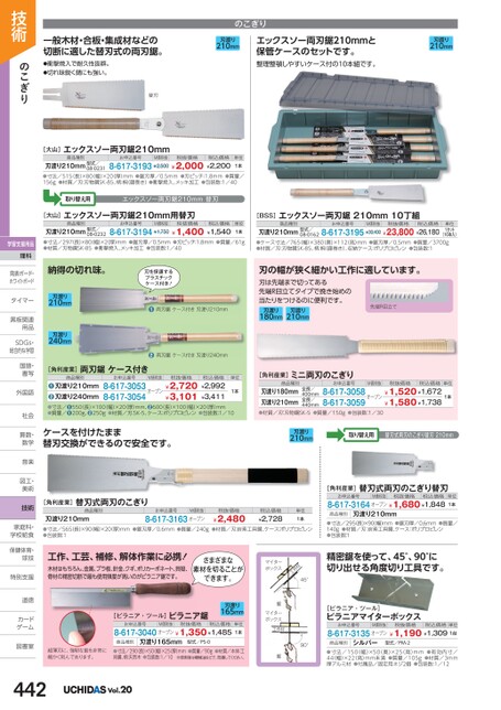 一般木材・合板・集成材などの切断に適した替刃式の両刃鋸。●衝撃焼入で耐久性抜群。●切れ味鋭く錆にも強い。替刃のこぎり刃渡り210mmエックスソー両刃鋸210mmと保管ケースのセットです。整理整頓しやすいケース付の10本組です。刃渡り210mm[BSS]エックスソー両刃鋸210mm10丁組商品種別お申込番号M価税抜税抜価格税込価格刃渡り210mm型式/●ケース寸法/765(幅)×380(奥)×112(高)mm●鋸刃厚/0.5mm●質量/3700g●材質/刃:刃物鋼SK-85、柄:桐(藤巻き)、収納ケース:ポリプロピレン●包装数:18-617-3195¥30,400¥23,800¥26,18008-0162(10本入)単位1セット刃の幅が狭く細かい工作に適しています。刃は先端まで切ってある先端R目立てタイプで挽き始めの当たりをつけるのに便利です。先端R目立て刃渡り180mm刃渡り210mm[角利産業]ミニ両刃のこぎり商品種別お申込番号M価税抜税抜価格税込価格刃渡り180mm刃渡り210mm●材質/刃:刃物鋼SK-5●質量/150g●包装数:1/308-617-3058オープン¥1,520¥1,672¥1,580¥1,7388-617-3059全長/400mm全長/440mm単位1本刃渡り210mm取り替え用替刃式両刃のこぎり替刃210mm[大山]エックスソー両刃鋸210mm商品種別お申込番号M価税抜税抜価格税込価格刃渡り210mm型式/●寸法/515長)×80(幅)×20(厚)mm●鋸刃厚/0.5mm●刃ピッチ:1.8mm●質量/156g●材質/刃:刃物鋼SK-85、柄:桐(藤巻き)●衝撃焼入、メッキ加工●包装数:1/408-617-3193¥2,500¥2,000¥2,20008-0231単位1本取り替え用エックスソー両刃鋸210mm替刃[大山]エックスソー両刃鋸210mm用替刃商品種別お申込番号M価税抜税抜価格税込価格刃渡り210mm型式/●寸法/297長)×80(幅)×2厚)mm●鋸刃厚/0.5mm●刃ピッチ:1.8mm●質量/61g●材質/刃物鋼SK-85●衝撃焼入、メッキ加工●包装数:1/408-617-3194¥1,750¥1,400¥1,54008-0232単位1本納得の切れ味。刃を保護するプラスチックケース付き!刃渡り210mm刃渡り240mm●両刃鋸ケース付き刃渡り210mm●両刃鋸ケース付き刃渡り240mmお申込番号M価税抜税抜価格8-617-3053オープン¥2,720¥3,1018-617-3054税込価格¥2,992¥3,411単位1本商品種別刃渡り210mm刃渡り240mm●●[角利産業]両刃鋸ケース付き●寸法/●550(長)×100(幅)×20(厚)mm、●600長)×100幅)×20厚)mm●質量/●200g、●250g●材質/刃:SK-5、ケース:ポリプロピレン●包装数:1/10ケースを付けたまま替刃交換ができるので安全です。[角利産業]替刃式両刃のこぎり商品種別お申込番号M価税抜税抜価格刃渡り210mm●寸法/565(長)×90(幅)×20厚)mm●鋸刃厚/0.6mm●質量/240g●材質/刃:炭素工具鋼、ケース:ポリプロピレン●包装数:18-617-3163オープン¥2,480税込価格¥2,728単位1本工作、工芸、補修、解体作業に必携!木材はもちろん、金属、プラ板、針金、クギ、ポリカーボネート、貝殻、骨材の精密切断で最も使用頻度が高いのがピラニア鋸です。さまざまな素材を切ることができます。[角利産業]替刃式両刃のこぎり替刃お申込番号M価税抜税抜価格税込価格8-617-3164オープン¥1,680¥1,848単位1本商品種別刃渡り210mm●寸法/295長)×90幅)mm●鋸刃厚/0.6mm●質量/140g●材質/刃:炭素工具鋼、ケース:ポリプロピレン●包装数:1精密鋸を使って、45°、90°に切り出せる角度切り工具です。[ピラニア・ツール]ピラニアマイターボックスお申込番号M価税抜税抜価格税込価格単位8-617-3135オープン¥1,190¥1,3091台マイターボックス材作工45°鋸マイターボックス工作材刃渡り165mm[ピラニア・ツール]ピラニア鋸お申込番号M価税抜税抜価格税込価格8-617-3040オープン¥1,350¥1,485単位1本商品種別刃渡り165mm型式/PS-0超薄刃に、強靭な歯を非常に細かく刻んであります。●寸法/290長)×50(幅)×25厚)mm●質量/90g●材質/本体:工具鋼、柄:天然木●包装数:1/10※使用後は機械油などで、防錆してください。鋸90°商品種別シルバー型式/PM-2●寸法/150(幅)×50(奥)×25(高)mm●有効内寸/44(幅)×22(高)mm未満●質量/105g●材質/3mm厚アルミ材●付属品/固定用ネジ2個●包装数:1/12技術のこぎり学習支援用品理科発表ボード・発表ボード・ホワイトボードタイマータイマー黒板関連黒板関連用品用品SDGs・SDG総合的な学習国語・国語書写書写外国語外国語社会社会算数・算数数学数学音楽音楽図工・図工美術美術技術家庭科・家庭科・学校給食学校給食保健体育・球技球技特別支援特別支道徳道徳カードカゲーム図書室図書室442Vol.20