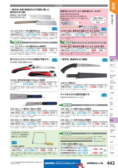 技術のこぎり学習支援用品理科発表ボード・発表ボード・ホワイトボードトタイマータイマー黒板関連黒板関連用品用品SDGs・DGs・総合的な学習習国語・語・書写写外国語国社会社会算数・数・数学学音楽楽図工・工・美術術技術家庭科・家庭科・学校給食校食保健体育・体球技技特別支援別道徳徳カードゲームム図書室書一般木材・合板・集成材などの切断に適した替刃式の木工鋸。●衝撃焼入で耐久性抜群。●切れ味鋭く錆にも強い。のこぎり改良刃によりたて・よこ・斜め切りオールOK!替刃刃渡り265mm●切断に最適な鋸刃角度を設計。●抜群の切れ味と優れた耐久性を発揮します。●接着剤を多用した合板やコンパネ、集成材などの切断に最適です。替刃収納に便利なプラスチックケース付き。[角利産業]技工替刃式片刃鋸たて・よこ・ななめ商品種別お申込番号M価税抜税抜価格税込価格刃渡り270mm●寸法/603(長)×70(幅)×20(厚)mm●質量/160g●材質/刃:SK-5、ケース:ポリプロピレン●包装数:1/108-617-3055オープン¥2,160¥2,376単位1本刃渡り270mm[大山]エックスソー木工鋸265mm商品種別お申込番号M価税抜税抜価格税込価格刃渡り265mm型式/●寸法/540長)×58(幅)×20厚)mm●鋸刃厚/0.6mm●刃ピッチ/1.9mm●材質/刃:刃物鋼SK-85、柄:桐(藤巻き)●質量/143g●衝撃焼入、メッキ加工●包装数:1/408-617-3196¥1,800¥1,480¥1,62808-0248単位1本取り替え用エックスソー木工鋸265mm替刃取り替え用技工替刃式片刃鋸たて・よこ・ななめ替刃[大山]エックスソー木工鋸265mm用替刃商品種別お申込番号税抜価格刃渡り265mm型式/●寸法/298長)×58幅)×2(厚)mm●鋸刃厚/0.6mm●刃ピッチ/1.9mm●質量/66g●材質/刃物鋼SK-85●衝撃焼入、メッキ加工●包装数:1/408-617-3197¥55008-0249税込価格¥605単位1本M価税抜¥680[角利産業]技工替刃式片刃鋸たて・よこ・ななめ替刃商品種別お申込番号M価税抜税抜価格型式/411398-617-3170オープン刃渡り270mm●全長/309mm●鋸刃厚/0.6mm●刃渡り/270mm●質量/118g●材質/刃:炭素工具鋼、ケース:ポリプロピレン●包装数:1¥880税込価格¥968単位1本折りたたんでコンパクトに収納が可能です。刃の角度が2段階で調整できます。刃渡り210mm一般木材、集成材などに最適。刃渡り210mm[角利産業]替刃式折込鋸210mm万能用商品種別型式/4381お申込番号M価税抜8-613-4200オープン税抜価格¥1,710税込価格¥1,881単位1本●寸法/使用時:約440長)×45(幅)×20(厚)mm、収納時:約240(長)×58(幅)×20(厚)mm●質量/230g●材質/刃:炭素工具鋼SK-95、柄:ABS樹脂+熱可塑性ゴム●包装数:1/70[石鋸工業]万能のこ商品種別お申込番号刃渡り210mm●全長/370mm(サヤ収納時405mm)●包装数:18-606-1069M価税抜¥1,450税抜価格¥1,230税込価格¥1,353単位1本両刃サイズが小ぶりの替刃式鋸です。手軽に使える低学年向けのツールです。刃渡り180mm片刃取り替え用ホビーソー180mm用替刃[高儀]ホビーソー両刃180mm用替刃商品種別お申込番号M価税抜税抜価格税込価格単位刃渡り180mm●寸法/225(長)×75(幅)×1(厚)mm●刃厚/0.5mm●質量/35g●材質/刃物鋼SK-85●包装数:1¥1,650¥1,320¥1,4521本8-613-4203型式/08-0106[高儀]ホビーソー片刃180mm用替刃商品種別お申込番号M価税抜税抜価格税込価格単位刃渡り180mm●寸法/230(長)×40(幅)×1(厚)mm●刃厚/0.4mm●質量/20g●材質/刃物鋼SK-85●包装数:1¥1,400¥1,120¥1,2321本8-613-4204型式/08-0107取り替え用糸のこ替刃●木工用普通目●プラスチック用極細目●軽金属用幅広鉄工目M価税抜税抜価格税込価格単位(3本入)1組木工用普通目(幅2.5mm)8-617-3067プラスチック用極細目(幅2.5mm)8-617-3069軽金属用幅広鉄工目(幅5mm)8-617-3070●●●寸法/170(長)×0.58(厚)mm●刃渡り/130mm●材質/刃物鋼●包装数:1/48オープン¥190¥220¥209¥242●[大同通商]糸のこ替刃3本入商品種別お申込番号[高儀]ホビーソー替刃式180mm両刃商品種別お申込番号M価税抜税抜価格税込価格単位刃渡り180mm●寸法/312(長)×60(幅)×23(厚)mm●質量/100g●材質/刃:刃物鋼SK-85、柄:エラストマ樹脂、ケース:塩化ビニル●包装数:1¥2,300¥1,845¥2,0291本8-613-4201型式/08-0172[高儀]ホビーソー替刃式180mm片刃商品種別お申込番号M価税抜税抜価格税込価格単位刃渡り180mm●寸法/318(長)×36(幅)×23(厚)mm●質量/87g●材質/刃:刃物鋼SK-85、柄:エラストマ樹脂、ケース:塩化ビニル●包装数:1¥1,850¥1,475¥1,6221本8-613-4202型式/08-0183刃を取り替えれば木材からプラスチック・軽金属まで切断することができます。刃渡り130mm[大同通商]糸のこ商品種別お申込番号M価税抜税抜価格8-617-3066¥1,150刃渡り130mm●寸法/300(長)×175(幅)×25(厚)mm●フトコロ深さ/145mm●質量/220g●材質/鉄・木●内容/替刃付(一般木工用、薄板木工用、軽金属用、プラスチック用各1本)●包装数:1/12¥960税込価格¥1,056単位1本※カタログに掲載の商品情報(仕様・価格・税率など)は変更になる場合がございます。最新情報はUCHIDASww.uchidas.netwへ!Vol.20