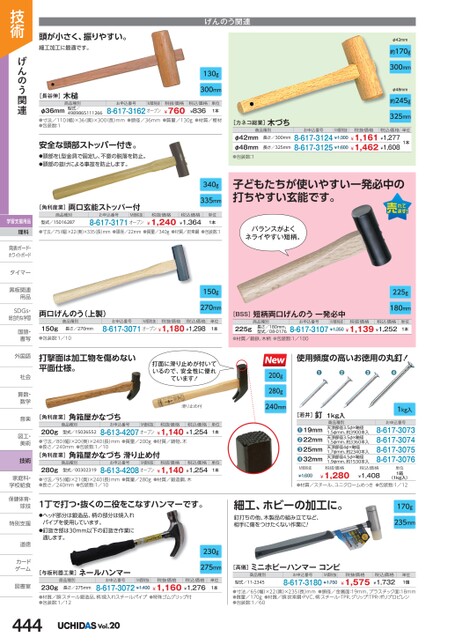 げんのう関連130g300mmφ42mm約170g300mmφ48mm約245g325mm税抜価格税込価格¥1,161¥1,277¥1,462¥1,608単位1本お申込番号M価税抜8-617-3124¥1,3008-617-3125¥1,600[カネコ総業]木づち商品種別φ42mmφ48mm●包装数:1長さ/300mm長さ/325mm340g335mm子どもたちが使いやすい一発必中の打ちやすい玄能です。バランスがよくネライやすい短柄。[BSS]短柄両口げんのう一発必中商品種別長さ/180mm、型式/08-0176225g●材質/鍛鉄、木柄●包装数:1/100お申込番号M価税抜税抜価格税込価格8-617-3107¥1,350¥1,139¥1,252単位1本225g180mm使用頻度の高いお徳用の丸釘!●●●●1kg入お申込番号8-617-30738-617-30748-617-30758-617-3076商品種別天頂部径3.5φ×軸径1.5φmm、約3900本入天頂部径3.5φ×軸径1.5φmm、約3360本入天頂部径4φ×軸径1.7φmm、約2340本入天頂部径4.5φ×軸径1.9φmm、約1530本入19mm22mm25mm32mm●●●●[若井]釘1kg入M価税抜¥1,600税抜価格¥1,280税込価格¥1,408単位1箱(1kg入)●材質/スチール、ユニクロームめっき●包装数:1/12細工、ホビーの加工に。釘打ちの他、木製品の組み立てなど、相手に傷をつけたくない作業に!170g235mm[高儀]ミニホビーハンマーコンビ商品種別型式/11-2345お申込番号M価税抜8-617-3180¥1,750税抜価格¥1,575税込価格¥1,732単位1個●寸法/65幅)×22(奥)×235(長)mm●頭径/金属面:19mm、プラスチック面:18mm●質量/170g●材質/頭:炭素鋼・PVC、柄:スチール・TPR、グリップ:TPR・ポリプロピレン●包装数:1/60打面に滑り止めが付いているので、安全性に優れています!滑り止め付200g280g240mm頭が小さく、振りやすい。細工加工に最適です。[長谷伸]木槌商品種別型式/4989865111266φ36mm●寸法/110(幅)×36奥)×300(長)mm●頭径/36mm●質量/130g●材質/樫材●包装数:18-617-3162オープン¥760税込価格¥836単位1本お申込番号M価税抜税抜価格安全な頭部ストッパー付き。●頭部をL型金具で固定し、不意の脱落を防止。●頭部の抜けによる事故を防止します。[角利産業]両口玄能ストッパー付商品種別型式/15016287お申込番号M価税抜8-617-3171オープン税抜価格¥1,240税込価格¥1,364単位1本●寸法/75幅)×22奥)×335(長)mm●頭径/22mm●質量/340g●材質/炭素鋼●包装数:1両口げんのう(上製)150g●包装数:1/10商品種別長さ/270mmお申込番号M価税抜税抜価格税込価格8-617-3071オープン¥1,180¥1,298単位1本150g270mm打撃面は加工物を傷めない平面仕様。[角利産業]角箱屋かなづち商品種別型式/15026552お申込番号M価税抜税抜価格税込価格8-613-4207オープン¥1,140¥1,254200g●寸法/80(幅)×20(奥)×240(長)mm●質量/200g●材質/鋳物、木●長さ/240mm●包装数:1/10[角利産業]角箱屋かなづち滑り止め付商品種別型式/00302319お申込番号M価税抜税抜価格税込価格280g●寸法/95(幅)×21(奥)×240(長)mm●質量/280g●材質/鍛造鋼、木●長さ/240mm●包装数:1/108-613-4208オープン¥1,140¥1,254単位1本単位1本1丁で打つ・抜くの二役をこなすハンマーです。●ヘッド部分は鍛造品、柄の部分は焼入れパイプを使用しています。●釘抜き部は30mm以下の釘抜き作業に適します。[与板利器工業]ネールハンマー商品種別お申込番号M価税抜税抜価格税込価格長さ/275mm230g●材質/頭:スチール鍛造品、柄:焼入れスチールパイプ●特殊ゴムグリップ付●包装数:1/128-617-3072¥1,400¥1,160¥1,276単位1本230g275mm技術げんのう関連学習支援用品理科発表ボード・発表ボード・ホワイトボードタイマータイマー黒板関連黒板関連用品用品SDGs・SDG総合的な学習国語・国語書写書写外国語外国語社会社会算数・算数数学数学音楽音楽図工・図工美術美術技術家庭科・家庭科・学校給食学校給食保健体育・球技球技特別支援特別支道徳道徳カードカゲーム図書室図書室444Vol.20