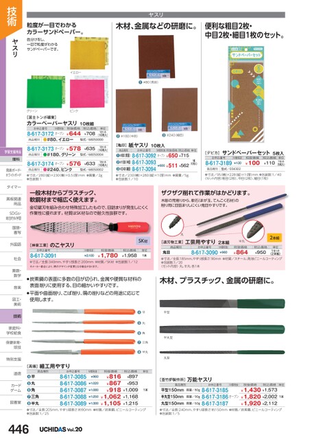粒度が一目でわかるカラーサンドペーパー。色分けをし、一目で粒度がわかるサンドペーパーです。ヤスリ木材、金属などの研磨に。便利な粗目2枚・中目2枚・細目1枚のセット。イエロー●#80(荒目)[デビカ]サンドペーパーセット5枚入お申込番号8-617-3189M価税抜¥130商品種別型式/034302税抜価格¥100税込価格¥110単位1セット(5枚入)●寸法/95(横)×228(縦)×1(厚)mm●包装数:1/40〈セット内容〉粗目(2枚)、中目(2枚)、細目(1枚)商品種別お申込番号M価税抜税抜価格税込価格単位オープン¥650¥715¥600¥511¥5621組(10枚入)#80(荒目)8-617-3092#180(中目)8-617-3093#240(細目)8-617-3094●●●[亀印]紙ヤスリ10枚入●#180(中目)●#240(細目)グリーン[冨士トンボ礦業]カラーペーパーヤスリ10枚組ピンクお申込番号M価税抜8-617-3172オープン税抜価格¥644税込価格¥708単位1セット(10枚入)商品種別●#80、イエロー型式/680500008-617-3173オープン¥578商品種別●#180、グリーン¥6351セット(10枚入)型式/680500048-617-3174オープン¥576商品種別●#240、ピンク¥6331セット(10枚入)型式/68050002●寸法/280(縦)×230(横)×0.5厚)mm●質量/2g●包装数:1●寸法/230(横)×280(縦)×1(厚)mm●質量/5g●包装数:1/10一般木材からプラスチック、軟鋼材まで幅広く使えます。金切鋸刃を組み合わせ特殊加工したもので、目詰まりが発生しにくく作業性に優れます。材質はSK材なので耐久性抜群です。ザクザク削れて作業がはかどります。木彫の荒削りから、軟石(まが玉、てんこく石材)の削り用に目詰まりしにくい鬼目やすりです。[神東工業]のこヤスリお申込番号8-617-3091税込価格¥1,958●寸法/全長:340mm、やすり部長さ:200mm●材質/SK材●包装数:1/12※メーカー都合により、柄のデザインが変更となる場合があります。¥1,780M価税抜¥2,100税抜価格SK材単位1本丸[道刃物工業]工芸用やすり2本組商品種別お申込番号8-617-3090鬼目●寸法/全長:185mm、やすり部長さ:90mm●包装数:1/20〈セット内容〉丸、半丸各1本半丸2本組M価税抜¥960税抜価格¥864税込価格¥950単位1セット(2本組)●材質/スチール、発泡ビニールコーティング●炭素鋼の表面に多数の目が切られ、金属や硬質な材料の表面削りに使用する、目の細かいやすりです。●平面や曲面削り、こば削り、隅の削りなどの用途に応じて使用します。木材、プラスチック、金属の研磨に。●平●丸●角●三角●半丸平型半丸型丸型[高儀]細工用やすり商品種別技術ヤスリ学習支援用品理科発表ボード・発表ボード・ホワイトボードタイマータイマー黒板関連黒板関連用品用品SDGs・SDG総合的な学習国語・国語書写書写外国語外国語社会社会算数・算数数学数学音楽音楽図工・図工美術美術技術家庭科・家庭科・学校給食学校給食保健体育・球技球技特別支援特別支[壺竹炉製作所]万能ヤスリ商品種別お申込番号M価税抜税抜価格税込価格単位質量/80g平型150mm半丸型150mm丸型150mm●寸法/全長:240mm、やすり部長さ:約150mm●材質/炭素鋼、ビニールコーティング●包装数:1/5¥1,430¥1,573¥1,820¥2,002¥1,920¥2,1128-617-31858-617-31868-617-3187質量/90g質量/60gオープン1本お申込番号8-617-30858-617-30868-617-30878-617-30888-617-3089M価税抜¥960¥1,020¥1,080¥1,250¥1,300税抜価格税込価格¥816¥897¥867¥953¥918¥1,009¥1,168¥1,215¥1,062¥1,105単位1本平丸角三角半丸●●●●●道徳道徳カードカゲーム図書室図書室●寸法/全長:205mm、やすり部長さ:約90mm●材質/炭素鋼、ビニールコーティング●包装数:1/25446Vol.20
