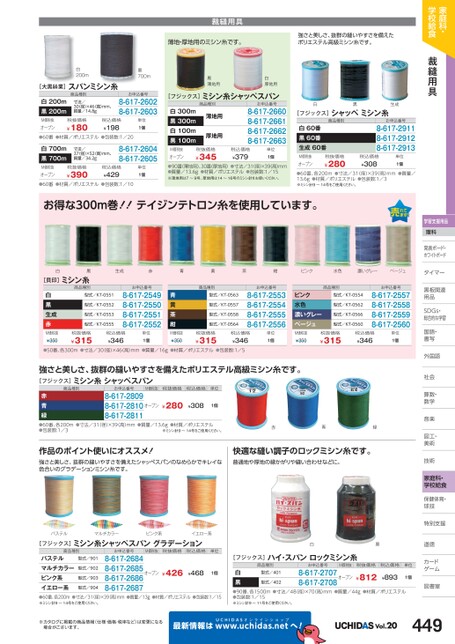 家庭科・学校給食裁縫用具学習支援用品理科発表ボード・発表ボード・ホワイトボードトタイマータイマー黒板関連黒板関連用品用品SDGs・DGs・総合的な学習習国語・語・書写写外国語国社会社会算数・数・数学学音楽楽図工・工・美術術技術術家庭科・学校給食保健体育・体球技技特別支援別道徳徳カードゲームム図書室書裁縫用具薄地・厚地用のミシン糸です。強さと美しさ、抜群の縫いやすさを備えたポリエステル高級ミシン糸です。黒薄地用白厚地用[フジックス]ミシン糸シャッペスパン商品種別薄地用厚地用白300m黒300m白100m黒100mお申込番号8-617-26608-617-26618-617-26628-617-2663税抜価格¥345M価税抜オープン●90番(薄地用)、30番(厚地用)●寸法/31径)×39高)mm●質量/13.6g●材質/ポリエステル●包装数:1/15※薄地用は7〜9号、厚地用は14〜16号のミシン針をお使いください。税込価格¥379単位1個白黒生成[フジックス]シャッペミシン糸商品種別白60番黒60番生成60番お申込番号8-617-29118-617-29128-617-2913税抜価格¥280M価税抜オープン●60番、各200m●寸法/31(径)×39高)mm●質量/13.6g●材質/ポリエステル●包装数:1/3※ミシン針9〜14号をご使用ください。税込価格¥308単位1個00m黒700m白2[大黒絲業]スパンミシン糸白200m黒200m商品種別寸法/30(径)×46(高)mm、質量/14.8gお申込番号8-617-26028-617-2603税抜価格M価税抜オープン●60番●材質/ポリエステル●包装数:1/20税込価格¥198¥180単位1個白700m黒700m寸法/37(径)×52(高)mm、質量/34.2g8-617-26048-617-2605税抜価格M価税抜オープン●60番●材質/ポリエステル●包装数:1/10税込価格¥429¥390単位1個お得な300m巻!!テイジンテトロン糸を使用しています。白黒[貝印]ミシン糸商品種別生成赤青黄茶紺ピンク水色濃いグレーベージュお申込番号8-617-25498-617-25508-617-25518-617-2552青黄茶紺商品種別型式/KT-0563型式/KT-0557型式/KT-0558型式/KT-0564お申込番号8-617-25538-617-25548-617-25558-617-2556ピンク水色濃いグレーベージュ商品種別型式/KT-0554型式/KT-0562型式/KT-0566型式/KT-0560お申込番号8-617-25578-617-25588-617-25598-617-2560型式/KT-0551型式/KT-0552型式/KT-0553型式/KT-0555税抜価格¥315税込価格¥346単位1個M価税抜¥350税抜価格¥315税込価格¥346単位1個M価税抜¥350税抜価格¥315税込価格¥346単位1個白黒生成赤M価税抜¥350●50番、各300m●寸法/30(径)×46(高)mm●質量/16g●材質/ポリエステル●包装数:1/5強さと美しさ、抜群の縫いやすさを備えたポリエステル高級ミシン糸です。[フジックス]ミシン糸シャッペスパン商品種別お申込番号M価税抜税抜価格税込価格単位赤青緑●60番、各200m●寸法/31径)×39高)mm●質量/13.6g●材質/ポリエステル●包装数:1/38-617-28098-617-28108-617-2811¥280¥308オープン※ミシン針9〜14号をご使用ください。1個赤青緑作品のポイント使いにオススメ!強さと美しさ、抜群の縫いやすさを備えたシャッペスパンのなめらかでキレイな色合いのグラデーションミシン糸です。快適な縫い調子のロックミシン糸です。普通地や厚地の縁かがりや縫い合わせなどに。パステルマルチカラーピンク系イエロー系[フジックス]ミシン糸シャッペスパングラデーション商品種別お申込番号M価税抜税抜価格税込価格単位型式/902型式/901パステルマルチカラーピンク系イエロー系●60番、各200m●寸法/31径)×39高)mm●質量/13g●材質/ポリエステル●包装数:1/15※ミシン針9〜14号をご使用ください。8-617-26848-617-26858-617-26868-617-2687¥426¥468型式/903型式/904オープン1個白黒[フジックス]ハイ・スパンロックミシン糸商品種別お申込番号M価税抜税抜価格税込価格単位型式/401白黒●90番、各1500m●寸法/48(径)×70(高)mm●質量/44g●材質/ポリエステル●包装数:1/15※ミシン針9〜11号をご使用ください。8-617-2707オープン8-617-2708¥812¥893型式/4021個※カタログに掲載の商品情報(仕様・価格・税率など)は変更になる場合がございます。最新情報はUCHIDASww.uchidas.netwへ!Vol.20449