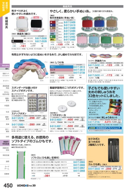 布すべりがよく使いやすい木綿糸です。白黒[貝印]家庭糸(細口)商品種別白黒M価税抜¥180型式/KM-3205型式/KM-3206お申込番号8-617-25388-617-2539税抜価格¥161税込価格¥177単位1個●30番、各60m●質量/9g●材質/綿●包装数:1/12裁縫用具やさしく、柔らかい手ぬい糸。30番の綿100%家庭糸。赤青茶[横田]色付き家庭糸(手ぬい糸)赤青茶ピンク水色緑黄色商品種別型式/01-0130-000R型式/01-0130-0031型式/01-0130-12型式/01-0130-2型式/01-0130-27型式/01-0130-25型式/01-0130-17税抜価格M価税抜¥170¥159お申込番号8-617-24098-617-24108-617-24898-617-24908-617-24918-617-24928-617-2493税込価格¥174単位1個●30番、各100m●質量/10g●材質/綿●包装数:1/10ピンク水色緑黄色布同士がずれないように仮ぬいをする糸で、少し細めでカセ状です。ブルーピンク生成り[横田]しつけ糸商品種別ブルーピンク生成りお申込番号8-617-26138-617-26128-617-2739税抜価格¥228M価税抜オープン●40番、各420m●質量/18g●材質/綿●包装数:1/10税込価格¥250単位1個スタンダードな縫い付けスナップボタンです。縫い付けるだけで簡単に取り付けができ、小物から洋服まで使う場面も多彩です。裁縫学習用の二つ穴ボタンです。白のシンプルな二つ穴のボタン12個入りです。裏側に緩やかなカーブがついているので、ボタン付けの練習がしやすいです。[CREAR]スナップボタン10mm14mmお申込番号M価税抜税抜価格8-617-2579オープン¥298税込価格¥327単位1袋(12組入)商品種別10mm8-617-2580オープン¥280商品種別14mm¥3081袋(6組入)●寸法/45(幅)×88(奥)×2(高)mm●質量/7.5g●材質/真ちゅう(ニッケルフリーメッキ)●包装数:1/60[知多機工]二つ穴ボタン白お申込番号M価税抜税抜価格8-613-4620オープン¥400税込価格¥440単位1袋(12個入)商品種別15mm質量/0.54g1個)8-613-4621オープン¥500¥5501袋(12個入)商品種別18mm質量/0.65g1個)●厚み/2.2mm●材質/ユリア樹脂●包装数:1/10多用途に使える、お徳用のソフトタイプのゴムひもです。●便利なひも通し、定規付き。●伸び率は約3倍です。[貝印]ソフトゴム(ひも通し・定規付)商品種別幅:6コール(約5mm)×長さ:約12m、質量/64g、型式/KM-3116幅:8コール(約7mm)×長さ:約10m、質量/64g、型式/KM-3117幅:10コール(約7.5mm)×長さ:約8m、質量/61g、型式/KM-3118幅:12コール(約9mm)×長さ:約7m、質量/68g、型式/KM-3119M価税抜¥420●包装数:1/12税抜価格¥381税込価格¥419お申込番号8-617-28658-617-28668-617-28678-617-2868単位1袋[ヒロヤ]刺繍糸1mお申込番号8-617-2432M価税抜¥130税抜価格¥123税込価格¥135単位1個商品種別8色●25番、各色1m●内容/8色(白・黄・赤・青・緑・茶・桃・紫)●材質/綿●包装数:18-617-243312色商品種別¥177¥173¥1901個●25番、各色1m●内容/12色(白・黄・赤・青・緑・茶・桃・紫・黒・黄緑・水・橙)●材質/綿●包装数:1子どもでも使いやすい太めの刺しゅう糸を32色セットにしました。●2本の糸をより合わせたもので、25番よりも太く、より目もはっきりしておりそのまま使用します。●クロスステッチやスウェーデン刺しゅうにおすすめです。[オリムパス製絲]刺しゅう糸セットお申込番号M価税抜税抜価格税込価格8-617-2735オープン¥9,273¥10,200単位1セット(32個入)●5番、各25m●質量/70g●材質/綿●包装数:1/6UCHIDASオンラインショップオリムパス色番号はWEBにございます。はさみ式と玉つき式の2種類入りです。[貝印]ゴム・ひも通し2本入お申込番号8-617-2543M価税抜¥280税抜価格¥250税込価格¥275単位1袋(2本入)●寸法/120(幅)×55(奥)×6厚)mm●質量/8g●材質/金属部:真ちゅう(ニッケルメッキ)、樹脂部:ABS樹脂●包装数:1/12※樹脂部の色(赤、ピンク、白、青)は選べません。家庭科・学校給食裁縫用具学習支援用品理科発表ボード・発表ボード・ホワイトボードタイマータイマー黒板関連黒板関連用品用品SDGs・SDG総合的な学習国語・国語書写書写外国語外国語社会社会算数・算数数学数学音楽音楽図工・図工美術美術技術技術家庭科・学校給食保健体育・球技球技特別支援特別支道徳道徳カードカゲーム図書室図書室Vol.20