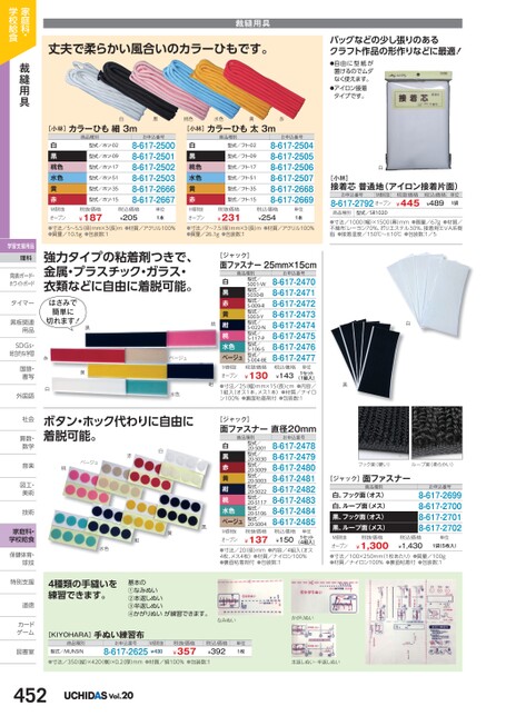 丈夫で柔らかい風合いのカラーひもです。バッグなどの少し張りのあるクラフト作品の形作りなどに最適!裁縫用具[小林]カラーひも細3m商品種別白黒桃色水色黄[小林]カラーひも太3m商品種別白黒桃色水色黄赤型式/ホソ-02型式/ホソ-09型式/ホソ-17型式/ホソ-51型式/ホソ-35型式/ホソ-15お申込番号8-617-25008-617-25018-617-25028-617-25038-617-26668-617-2667白黒桃色水色黄赤●自由に型紙が置けるのでムダなく使えます。●アイロン接着タイプです。赤型式/フト-02型式/フト-09型式/フト-17型式/フト-51型式/フト-35型式/フト-15お申込番号8-617-25048-617-25058-617-25068-617-25078-617-26688-617-2669白[小林]接着芯普通地(アイロン接着片面)お申込番号M価税抜8-617-2792オープン税抜価格¥445税込価格¥489単位1袋商品種別型式/SR1020●寸法/1000(幅)×1500(奥)mm●質量/67g●材質/不織布:レーヨン70%、ポリエステル30%、接着剤:EVA系樹脂●接着温度/150℃〜±10℃●包装数:1/5白黒フック面(硬い)ループ面(柔らかい)[ジャック]面ファスナー商品種別白、フック面(オス)白、ループ面(メス)黒、フック面(オス)黒、ループ面(メス)お申込番号8-617-26998-617-27008-617-27018-617-2702税抜価格¥1,300M価税抜オープン●寸法/100×250mm(1枚あたり)●質量/100g●材質/ナイロン100%●裏面粘着付●包装数:1税込価格¥1,430単位1袋(5枚入)税抜価格¥187M価税抜オープン●寸法/5〜5.5(径)mm×3(長)m●材質/アクリル100%●質量/10.5g●包装数:1税込価格¥205単位1本税抜価格¥231M価税抜オープン●寸法/7〜7.5(径)mm×3長)m●材質/アクリル100%●質量/26.1g●包装数:1税込価格¥254単位1本強力タイプの粘着剤つきで、金属・プラスチック・ガラス・衣類などに自由に着脱可能。はさみで簡単に切れます!黒赤白黄桃紺ベージュ水色ボタン・ホック代わりに自由に着脱可能。赤白ベージュ桃黒黄紺水色[ジャック]面ファスナー25mm×15cm商品種別白黒赤黄紺桃水色ベージュ型式/S001-W型式/S030-B型式/S-009-R型式/S003-Y型式/S-022-N型式/S-117-P型式/S-106-S型式/S-004-BE税抜価格お申込番号8-617-24708-617-24718-617-24728-617-24738-617-24748-617-24758-617-24768-617-2477単位¥130税込価格¥143M価税抜オープン(1組入)●寸法/25(幅)mm×15(長)cm●内容/1組入(オス1本、メス1本)●材質/ナイロン100%●裏面粘着剤付●包装数:11セット[ジャック]面ファスナー直径20mm商品種別白黒赤黄紺桃水色ベージュ型式/20-S001型式/20-S030型式/20-S009型式/20-S003型式/20-S022型式/20-S117型式/20-S106型式/20-S004税抜価格お申込番号8-617-24788-617-24798-617-24808-617-24818-617-24828-617-24838-617-24848-617-2485単位¥137税込価格¥150M価税抜オープン●寸法/20(径)mm●内容/4組入(オス4枚、メス4枚)●材質/ナイロン100%●裏面粘着剤付●包装数:11セット(4組入)4種類の手縫いを練習できます。基本の①なみぬい②本返しぬい③半返しぬい④かがりぬいが練習できます。なみぬいかがりぬい[KIYOHARA]手ぬい練習布商品種別型式/MUNSINお申込番号8-617-2625M価税抜¥430税抜価格¥357税込価格¥392単位1枚●寸法/350(縦)×420(横)×0.2(厚)mm●材質/綿100%●包装数:1本返しぬい・半返しぬいVol.20家庭科・学校給食裁縫用具学習支援用品理科発表ボード・発表ボード・ホワイトボードタイマータイマー黒板関連黒板関連用品用品SDGs・SDG総合的な学習国語・国語書写書写外国語外国語社会社会算数・算数数学数学音楽音楽図工・図工美術美術技術技術家庭科・学校給食保健体育・球技球技特別支援特別支道徳道徳カードカゲーム図書室図書室
