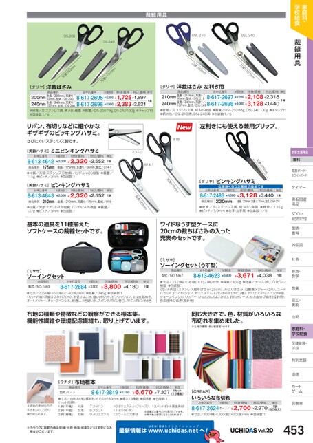 家庭科・学校給食裁縫用具学習支援用品理科発表ボード・発表ボード・ホワイトボードトタイマータイマー黒板関連黒板関連用品用品SDGs・DGs・総合的な学習習国語・語・書写写外国語国社会社会算数・数・数学学音楽楽図工・工・美術術技術術家庭科・学校給食保健体育・体球技技特別支援別道徳徳カードゲームム図書室書DSL-210DSL-240渡り107mm刃刃渡り95mm裁縫用具DS-200り93mm渡刃DS-240り107mm渡刃[ダリヤ]洋裁はさみ商品種別お申込番号M価税抜税抜価格税込価格単位93mm、型式/DS-200200mm全長/200mm、刃渡り/240mm全長/240mm、刃渡り/●材質/刃:ステンレス鋼、柄:ABS樹脂●質量/DS-200:79g、DS-240:130g●キャップ付●包装数:1/68-617-2695¥2,200¥1,725¥1,8978-617-2696¥2,900¥2,383¥2,621107mm、型式/DS-2401本[ダリヤ]洋裁はさみ左利き用商品種別お申込番号M価税抜税抜価格税込価格単位95mm、型式/DSL-2108-617-2697¥2,700¥2,108¥2,318107mm、型式/DSL-2408-617-2698¥4,000¥3,128¥3,440210mm全長/210mm、刃渡り/240mm全長/240mm、刃渡り/●材質/刃:ステンレス鋼、柄:ABS樹脂●質量/DSL-210:88g、DSL-240:130g●キャップ付●柄の色/DSL-210:青、DSL-240:黒●包装数:1/61本mm75り刃渡左利きにも使える兼用グリップ。[ダリヤ]ピンキングハサミ在庫無次第終了商品お申込番号8-617-2486M価税抜税抜価格¥4,000¥3,128¥3,440税込価格単位1本商品種別230mm全長/230mm、刃渡り/75mm、型式/DNP-230●材質/刃:ステンレス鋼、柄:ABS樹脂●質量/136g●ピッチ/5.0mm●右手・左手用●包装数:1/6818mm75り刃渡イメージ814-1mm68り刃渡リボン、布切りなどに細やかなギザギザのピッキングハサミ。さびにくいステンレス製です。[美鈴ハサミ]ミニピンキングハサミお申込番号8-613-4642175mm商品種別M価税抜税抜価格税込価格¥2,500¥2,320¥2,552単位1本全長/175mm、刃渡り/68mm、型式/814-1●材質/刃部:ステンレス刃物鋼、ハンドル:ABS樹脂●質量/115g●ピッチ/3mm●包装数:1[美鈴ハサミ]ピンキングハサミお申込番号8-613-4643210mm商品種別M価税抜税抜価格税込価格¥2,500¥2,320¥2,552単位1本全長/210mm、刃渡り/75mm、型式/818●材質/刃部:ステンレス刃物鋼、ハンドル:ABS樹脂●質量/127g●ピッチ/5mm●包装数:1基本の道具を11種揃えたソフトケースの裁縫セットです。ワイドなうす型ケースに20cmの裁ちばさみの入った充実のセットです。[ミササ]ソーイングセット商品種別型式/NO.1469お申込番号8-617-2884M価税抜¥3,800税抜価格¥3,800税込価格¥4,180単位1個●寸法/225(幅)×60(奥)×140(高)mm●質量/345g●包装数:1〈セット内容〉洋裁はさみ(17cm)、糸切りはさみ、縫い針セット、ピンクッション、セル皮指ぬき、オートメジャー、チョークペンシル、紐通し、4色縫い糸、スパン糸ボビン巻白、スパンボビン糸6色布地の種類や特徴などの観察ができる標本集。機能性繊維や環境配慮繊維も、取り上げています。[ミササ]ソーイングセット(うす型)商品種別型式/NO.1467お申込番号8-613-4623M価税抜¥3,800税抜価格¥3,671税込価格¥4,038単位1個●寸法/222(幅)×56(奥)×152高)mm●質量/400g●材質/ケース:ポリプロピレン樹脂●包装数:1〈セット内容〉ステンレス裁ちばさみ(20cm)、糸切りはさみ、自動巻メジャー(2m)、ニードルセット、ピンクッション、ポリエステルスパン糸6色(ボビン巻)、ポリエステルスパン糸4色、チョークペンシル、リッパー、ひもとおし(はさみ式)、折れ針ケース、セル皮ゆびぬき(短針用)、長皿皮ゆびぬき(長針用)同じ大きさで、色、材質がいろいろな布切れを集めました。※生地の種類・色は都度変わります。[ウチダ]布地標本商品種別型式/C-13お申込番号8-617-2819M価税抜¥7,150税抜価格¥6,670税込価格¥7,337単位1セット(13種組)大きめの布地なので手ざわりもしっかり確かめられます。●寸法/台紙:A4判、標本布:約150×180mm●標本13種組●説明書●包装数:1〈セット内容〉1.綿(平織)2.綿(平編)3.綿(綾織)4.麻5.毛6.絹7.ナイロン8.アクリル9.ポリエステル10.ポリエステル(フリース)11.ポリウレタン12.クールビズ素材13.ペットボトル再生素材※台紙には番号だけを表示しています。※布の色は変更になることがあります。[CREAR]いろいろな布切れお申込番号8-617-2624オープン¥2,700¥2,970M価税抜税抜価格税込価格●寸法/300横)×300縦)×30厚)mm●包装数:1単位1袋(50枚入)※カタログに掲載の商品情報(仕様・価格・税率など)は変更になる場合がございます。最新情報はUCHIDASww.uchidas.netwへ!Vol.20