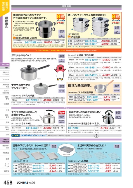 調理用具鍋中身の様子がわかりやすいガラス蓋のステンレス蒸器です。蒸しパンやシュウマイの調理実習に!●上下鍋を組み合わせて蒸器、下鍋だけでゆで・煮物料理が行えます。●もち米で約2升(3kg)を蒸すことが可能なサイズです。[パール金属]深型2段蒸器28cm沖縄・離島はサービス対象外食洗機対応IH200V対応●[神子島製作所]角型蒸器沖縄・離島はサービス対象外食洗機非対応IH200V対応●食洗機非対応●4号お申込番号M価税抜税抜価格税込価格8-617-2846オープン¥16,288¥17,916¥23,964¥26,3608-617-2847単位1個●●質量/❶:2.8kg、❷:3.9kg●材質/ステンレス●包装数:1寸法/284(幅)×342奥)×260(高)mm、型式/9290065寸法/284(幅)×342奥)×330(高)mm、型式/92900662段3段●商品種別商品種別型式/H-4795お申込番号8-617-2589¥17,000¥16,800¥18,480M価税抜税抜価格税込価格単位1個●寸法/410(幅)×300(奥)×335(高)mm●材質/本体・目皿・ふた金属部:ステンレス鋼、取っ手・ふたつまみ:フェノール樹脂(耐熱温度150℃)、ふた:強化ガラス●包装数:1●質量/2.8kg※メーカー直送品です。返品はご容赦ください。上記商品は受注日から8営業日以内のお届けになります。ガス火もIHもOK!安心の日本製で200VのIHをはじめ、あらゆる熱源に使用できます。熱効率のよい三層鋼なのでムラなく熱が伝わります。食洗機非対応IH200V対応16cm丈夫で長持ちするアルマイト加工。食洗機非対応IH非対応[北陸アルミ]アルミ片手鍋商品種別お申込番号M価税抜税抜価格18cm●寸法/193幅)×348(奥)×149高)mm●質量/450g●材質/アルミニウム(パール発色アルマイト加工)、フェノール樹脂●包装数:1/28-617-2333オープン¥2,660税込価格¥2,926単位1個[ヨシカワ]片手鍋(ガラス蓋)商品種別お申込番号M価税抜税抜価格税込価格型式/SJ376914cm●寸法/305(幅)×146奥)×136(高)mm●質量/595g●満水容量/1.2L●材質/ステンレス、強化ガラス●IH200V対応●包装数:18-613-4610オープン¥3,230¥3,553単位1個型式/SJ377016cm●寸法/327(幅)×175奥)×141(高)mm●質量/720g●満水容量/1.8L●材質/ステンレス、強化ガラス●IH200V対応●包装数:18-613-4611オープン¥3,800¥4,1801個型式/SJ377118cm●寸法/350(幅)×196奥)×138(高)mm●質量/815g●満水容量/2.2L●材質/ステンレス、強化ガラス●IH200V対応●包装数:18-613-4612オープン¥4,528¥4,9801個優れた熱伝導率。[本間製作所]アルミ製雪平鍋商品種別お申込番号(底板厚)mm、質量/320g18cm寸法/180径)×70深)×1.721cm寸法/210径)×80深)×1.8●材質/本体:アルミニウム●包装数:1/208-617-23608-617-2359(底板厚)mm、質量/450g食洗機非対応IH非対応M価税抜オープン税抜価格税込価格¥3,412¥3,753¥4,195¥4,614単位1個やかんすべての熱源に対応した定番のやかんです。●広口でお手入れも簡単です。●衛生的で丈夫、錆びにくいステンレス製。ケトル6L[ヒロショウ]商品種別型式/SBKN-60お申込番号M価税抜8-613-4633オープン食洗機非対応CH・IH100V対応税抜価格¥5,980税込価格¥6,578単位1個お湯が沸いたら笛がお知らせ!底面が広く沸騰スピードが早い、安心の日本製早沸きケトルです。[竹井器物製作所]笛吹きケトル2.5Lお申込番号8-617-2461M価税抜オープン税抜価格¥4,752食洗機非対応CH・IH200V対応税込価格¥5,227単位1個●寸法/325幅)×230(奥)×270高)mm●質量/810g●材質/本体:ステンレス鋼(クロム14%)、ハンドル・ツマミ:フェノール樹脂(耐熱温度140℃)●包装数:1●寸法/195幅)×195(奥)×230(高)mm●質量/625g●材質/ステンレス●満水容量/2.5L●適正容量/約1.8L●包装数:1UCHIDASオンラインショップ湯沸かしやかん10LはWEBにございます。調理の下ごしらえや、トレーに活用!アルマイト加工が表面の腐食と黒変化を防ぎます。食洗機非対応●2号●3号バット組み合わせ例水切りや天ぷらの油こしに!熱を逃がしやすく粗熱取りに最適です。●2号●3号M価税抜オープン税抜価格¥922¥832¥742税込価格単位¥1,014¥915¥8161枚2号寸法/316幅)×241(奥)×15高)3号寸法/281幅)×206(奥)×15高)4号寸法/248幅)×184(奥)×15高)mm、質量/168g、型式/A51718208-617-2773mm、質量/132g、型式/A51718308-617-2774mm、質量/106g、型式/A51718408-617-2775●●●1枚¥2,160¥2,376¥1,762¥1,938¥1,440¥1,584税抜価格税込価格単位商品種別お申込番号●4号[北陸アルミ]バット用網お申込番号8-617-27708-617-27718-617-2772M価税抜オープンmm、容量/3L、質量/294g2号寸法/348幅)×273(奥)×38(高)3号寸法/312幅)×241(奥)×33(高)4号寸法/211幅)×276(奥)×32(高)mm、容量/2.2L、質量/204gmm、容量/1.7L、質量/158g●●●[北陸アルミ]バット商品種別家庭科・学校給食調理用具学習支援用品理科発表ボード・発表ボード・ホワイトボードタイマータイマー黒板関連黒板関連用品用品SDGs・SDG総合的な学習国語・国語書写書写外国語外国語社会社会算数・算数数学数学音楽音楽図工・図工美術美術技術技術家庭科・学校給食保健体育・球技球技特別支援特別支道徳道徳カードカゲーム図書室図書室●材質/本体:アルミニウム合金、表面:アルマイト加工●包装数:1●材質/鉄(クロムメッキ)●包装数:1Vol.20