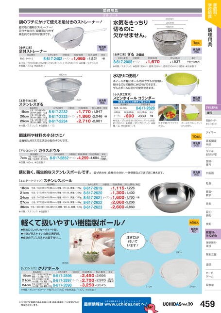 家庭科・学校給食調理用具3個入食洗機対応10個入食洗機対応食洗機対応各5個入食洗機対応学習支援用品理科発表ボード・発表ボード・ホワイトボードトタイマータイマー黒板関連黒板関連用品用品SDGs・DGs・総合的な学習習国語・語・書写写外国語国社会社会算数・数・数学学音楽楽図工・工・美術術技術術家庭科・学校給食保健体育・体球技技特別支援別道徳徳カードゲームム図書室書調理用具ざる・ボール鍋のフチにかけて使える足付きのストレーナー!茹で物に便利なストレーナー!足付きなので、設置面につかず衛生的で水切れが良好です。水気をきっちり切るのに欠かせません。250mm220mm190mm[金伊工業]足付ストレーナー商品種別お申込番号型式/SH-012税込価格¥1,831●寸法/220(外径)×95(深)×395(長)mm、210(内径)mm●材質/ステンレス●質量/235g●包装数:18-617-2402オープン¥1,665税抜価格M価税抜食洗機対応単位1個180mm18cm食洗機対応[本間冬治工業]ステンレスざる商品種別お申込番号(深)mm、質量/120g18cm寸法/180(径)×9020cm寸法/200(径)×9625cm寸法/250(径)×120●材質/ステンレス●包装数:1/10(深)mm、質量/200g(深)mm、質量/150g8-617-22328-617-22338-617-2234M価税抜オープン税抜価格税込価格¥1,770¥1,947¥1,860¥2,046¥2,710¥2,981単位1個[金伊工業]ざる3個組お申込番号M価税抜8-617-2008オープン税抜価格¥1,670税込価格¥1,837単位1セット(3個入)●材質/ステンレス●直径190mm、直径220mm、直径250mmの3個組●包装数:1水切りに便利!ホイールを軸にボールの中でザルが回転し、傾けるだけで簡単に水切りができます。ザルとボールに分けて使用できます。[小久保工業所]スピンホイールコランダー在庫無次第終了商品お申込番号商品種別型式/kk-3058-617-2628税抜価格¥600税込価格¥660M価税抜オープン●寸法/ザル内径:約180mm、ボール内径:約190mm●材質/ポリプロピレン●容量/2L●包装数:1/5単位1個食洗機非対応片手で傾けてラクラク水切り。ボールをフタにしてしっかり水切り。調味料や材料の小分けに!全面強化ガラスで丈夫な小型のボウルです。ガラスボウル[アルコロック]商品種別寸法/75径)×34高)mm、質量/72g、型式/JD-143407cm●容量/60mL●包装数:1お申込番号M価税抜税抜価格税込価格8-617-2852オープン¥4,259¥4,684単位1セット(10個入)に強く、衛生的なステンレスボールです。混ぜ合わせ、食材の小分け、一時保管などさまざまに使えます。[エムテートリマツ]ステンレスボール商品種別寸法/180(径)×70深)mm、容量/約1.2L、質量/176g寸法/210(径)×75深)mm、容量/約1.9L、質量/224g寸法/240(径)×85深)mm、容量/約3.1L、質量/290g寸法/270(径)×93深)mm、容量/約4.0L、質量/426g寸法/300径)×106(深)mm、容量/約5.4L、質量/520g18cm21cm24cm27cm30cm●材質/ステンレス●包装数:1M価税抜オープンお申込番号8-617-26198-617-26208-617-26218-617-26228-617-2623税抜価格税込価格¥1,115¥1,226¥1,300¥1,430¥1,600¥1,760¥2,060¥2,266¥2,600¥2,860単位1個軽くて扱いやすい樹脂製ボール!●割れにくいポリカーボネート製。●中身が見えやすい抜群の透明感。●食材の下ごしらえやお菓子作りに。注ぎ口が付いています!19cm単位21cm24cm[ヒロショウ]クリアボール使用例商品種別お申込番号M価税抜税抜価格税込価格容量/1.3L、質量/137g8-617-2896mm、容量/1.9L、質量/170g8-617-2897mm、容量/2.8L、質量/207g8-617-289819cm寸法/190(径)×90高)mm、21cm寸法/210径)×100高)24cm寸法/240径)×115高)●材質/ポリカーボネート●電子レンジ対応●耐熱温度/140℃●包装数:1¥2,450¥2,695¥2,700¥2,970¥3,250¥3,575オープン1セット(5個入)※カタログに掲載の商品情報(仕様・価格・税率など)は変更になる場合がございます。最新情報はUCHIDASww.uchidas.netwへ!Vol.20459