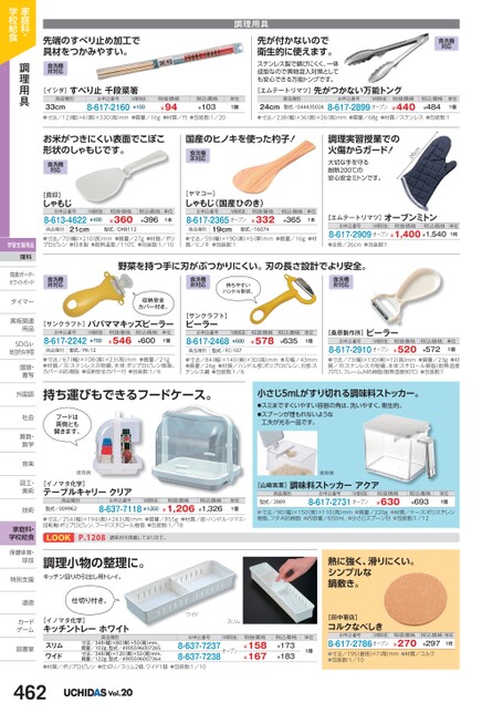 先端のすべり止め加工で具材をつかみやすい。食洗機非対応[イシダ]すべり止千段菜箸商品種別お申込番号33cm●寸法/12(幅)×6(奥)×330(高)mm●質量/16g●材質/竹●包装数:1/208-617-2160¥94M価税抜¥100税抜価格税込価格¥103単位1膳調理用具先が付かないので衛生的に使えます。食洗機対応ステンレス製でびにくく、一体成型なので異物混入対策としても安心できる万能トングです。[エムテートリマツ]先がつかない万能トング商品種別型式/04443502424cm●寸法/238(幅)×36(奥)×26(高)mm●質量/68g●材質/ステンレス●包装数:18-617-2899オープン¥440お申込番号M価税抜税抜価格税込価格¥484単位1個お米がつきにくい表面でこぼこ形状のしゃもじです。食洗機対応国産のヒノキを使った杓子!食洗機非対応調理実習授業での火傷からガード!大切な手を守る耐熱200℃の安心安全ミトンです。26cm[貝印]しゃもじお申込番号8-613-462221cm商品種別M価税抜¥400税抜価格¥360税込価格¥396単位1本型式/DH8112商品種別[ヤマコー]しゃもじ(国産ひのき)お申込番号M価税抜8-617-2365オープン税抜価格¥33219cm型式/16074税込価格¥365単位1本●寸法/70(幅)×210(長)mm●質量/27g●材質/ポリプロピレン●日本製●耐熱温度/110℃●包装数:1/10●寸法/59(幅)×190(奧)×5(厚)mm●質量/16g●材質/ヒノキ●包装数:1[エムテートリマツ]M価税抜お申込番号オーブンミトン税抜価格税込価格8-617-2909オープン¥1,400¥1,540単位1枚●全長/26cm●包装数:1食洗機非対応野菜を持つ手に刃がぶつかりにくい。刃の長さ設計でより安全。食洗機非対応持ちやすいハンドル形状。食洗機非対応収納安全カバー付き。[サンクラフト]パパママキッズピーラーお申込番号8-617-2242M価税抜¥700税抜価格¥546税込価格¥600単位1個[サンクラフト]ピーラーお申込番号8-617-2468M価税抜¥680税抜価格¥578税込価格¥635単位1個商品種別型式/PK-12商品種別型式/FC-107[桑原製作所]ピーラーお申込番号M価税抜8-617-2910オープン税抜価格¥520税込価格¥572単位1個●寸法/67(幅)×108(奥)×23(高)mm●質量/21g●材質/刃:ステンレス刃物鋼、本体:ポリプロピレン樹脂、カバー:ABS樹脂●収納安全カバー付●包装数:1/6●寸法/84幅)×140奥)×30高)mm●刃幅/43mm●質量/26g●材質/ハンドル部:ポリプロピレン、刃部:ステンレス鋼●包装数:1/6●寸法/73幅)×130奥)×12高)mm●質量/23g●材質/刃:ステンレス刃物鋼、本体:スチロール樹脂(耐熱温度70℃)、フレーム:ABS樹脂(耐熱温度80℃)●包装数:1持ち運びもできるフードケース。フードは両側とも開きます。小さじ5mLがすり切れる調味料ストッカー。●スミまですくいやすい容器の角は、洗いやすく、衛生的。●スプーンが埋もれないような工夫が光る一品です。使用例[イノマタ化学]テーブルキャリークリア商品種別型式/009962お申込番号M価税抜8-637-7118¥1,350税抜価格¥1,206税込価格¥1,326単位1個●寸法/254(幅)×194(奥)×243(高)mm●質量/855g●材質/底・ハンドル・ツマミ・回転軸:ポリプロピレン、フード:スチロール樹脂●包装数:1/18LOOKP.1208調味料を掲載しております。調理小物の整理に。キッチン回りの引出し用トレイ。仕切り付き。使用例[山崎実業]調味料ストッカーアクア商品種別型式/2889お申込番号M価税抜8-617-2731オープン税抜価格¥630税込価格¥693単位1個●寸法/90(幅)×150(奥)×110(高)mm●質量/220g●材質/ケース:ポリスチレン樹脂、フタ:ABS樹脂●内容量/650mL●小さじスプーン付●包装数:1/12熱に強く、滑りにくい。シンプルな鍋敷き。[イノマタ化学]キッチントレーホワイト商品種別スリムワイド●材質/ポリプロピレン●仕切り/スリム2個、ワイド1個●包装数:1/10寸法/348(幅)×80(奥)×50(高)mm、質量/102g、型式/4905596007265寸法/348(幅)×120奥)×50(高)mm、質量/122g、型式/49055960073648-637-7237オープン8-637-7238ワイドスリムお申込番号M価税抜税抜価格¥158¥167税込価格¥173¥183単位1個[田中箸店]コルクなべしきM価税抜税抜価格お申込番号8-617-2786オープン税込価格単位¥2971枚●寸法/195直径)×7高)mm●材質/コルク●包装数:1/10¥270家庭科・学校給食調理用具学習支援用品理科発表ボード・発表ボード・ホワイトボードタイマータイマー黒板関連黒板関連用品用品SDGs・SDG総合的な学習国語・国語書写書写外国語外国語社会社会算数・算数数学数学音楽音楽図工・図工美術美術技術技術家庭科・学校給食保健体育・球技球技特別支援特別支道徳道徳カードカゲーム図書室図書室Vol.20
