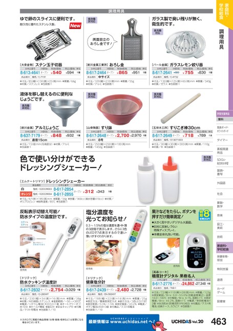 家庭科・学校給食調理用具学習支援用品理科発表ボード・発表ボード・ホワイトボードトタイマータイマー黒板関連黒板関連用品用品SDGs・DGs・総合的な学習習国語・語・書写写外国語国社会社会算数・数・数学学音楽楽図工・工・美術術技術術家庭科・学校給食保健体育・体球技技特別支援別道徳徳カードゲームム図書室書ゆで卵のスライスに便利です。耐久性に優れたステンレス製。食洗機非対応調理用具両面目立のおろし金です!ガラス製で臭い残りが無く、衛生的です。食洗機対応[大泉金物]ステン玉子切器お申込番号M価税抜8-613-4641オープン税抜価格¥540税込価格¥594単位1個[前川金属工業所]おろし金お申込番号M価税抜8-617-2464オープン税抜価格¥865商品種別型式/C-7191商品種別中サイズ税込価格¥951単位1個[パール金属]ガラスレモン絞り器お申込番号8-617-2641M価税抜¥800商品種別型式/C-4732税抜価格¥755税込価格¥830単位1個●寸法/85(幅)×130(奥)×25(高)mm●質量/66g●材質/ステンレス●包装数:1●寸法/109(幅)×210(奥)mm●質量/55g●材質/アルミ●包装数:1●寸法/130幅)×125奥)×65高)mm●質量/340g●材質/ガラス●包装数:1液体を移し替えるのに便利なじょうごです。食洗機非対応食洗機非対応食洗機非対応[前川金属]アルミじょうごお申込番号M価税抜8-637-7179オープン直径15cm商品種別税抜価格¥848税込価格¥932単位1個お申込番号M価税抜税抜価格税込価格8-617-2648オープン¥2,700¥2,970単位1個[山幸陶器]すり鉢商品種別8号[五林木工所]すりこぎ棒30cmお申込番号M価税抜8-617-2649オープン税抜価格¥718税込価格¥789単位1本商品種別型式/013071003●寸法/15(径)mm(先端部分)●材質/アルミ●包装数:1●寸法/250(幅)×250(奥)×100(高)mm●質量/1450g●包装数:1●寸法/30幅)×30奥)×300高)mm●質量/110g●材質/朴●包装数:1色で使い分けができるドレッシングシェーカー!食洗機非対応[エムテートリマツ]ドレッシングシェーカー商品種別型式/020339003お申込番号M価税抜税抜価格税込価格単位白オレンジ●寸法/67(径)×185高)mm●質量/34g●容量/360cc満水容量410cc)●材質/ポリプロピレン●耐熱温度/85℃●包装数:18-617-2854オープン8-617-2855¥312型式/020339004¥3431個反転表示切替え可能!防水タイプの温度計です。塩分濃度を光ってお知らせ!0.3〜1.5%の塩分濃度を濃・中・薄の3段階で表示します。さらに3色のLEDで7点表示するので濃い・薄いがすぐわかります。果汁などをたらし、ボタンを押すだけ簡単測定!●大きく見やすいデジタル大画面。●日光に反射しづらい特殊ディスプレイ。●本機全体丸洗い可能。使用例使用例[ドリテック]防水クッキング温度計お申込番号M価税抜税抜価格税込価格8-617-2832オープン¥2,754¥3,029単位1個[ドリテック]健康塩分計お申込番号M価税抜税抜価格税込価格8-617-2439オープン¥2,480¥2,728単位1個商品種別型式/O-280WT商品種別型式/EN-900WT●寸法/230(幅)×34(奥)×16(高)mm●質量/38g●材質/ABS樹脂・ステンレス●温度範囲/-50〜+300℃●電源/リチウム電池CR2032×1個●オートパワーオフ:約10分●ホールド機能●磁石付●安全キャップ付●付属品/テスト用電池●包装数:1/10●寸法/188(幅)×22(奥)×14(高)mm●質量/25g●測定方法/電導度測定方式●表示方法/3色LED(7点)●測定範囲/0.3%〜1.5%●測定精度/±0.2%●電源/ボタン電池LR44×3個●付属品/テスト用電池●包装数:1/10使用例[高森コーキ]糖度計デジタル果樹名人お申込番号M価税抜税抜価格税込価格単位8-617-2776オープン¥24,862¥27,3481個商品種別型式/TKR-1●寸法/72(幅)×110奥)×28(高)mm●質量/123g●測定範囲/Brix0.0〜53.0%(自動温度補正)、温度10.0〜100℃●分解能/Brix0.1%、温度0.1℃●測定精度/Brix±0.2%、温度±1℃●電源/単四乾電池×2個●生活防水(防噴流形)IP65相当●付属品/テスト用電池、収納ケース、カラビナ●包装数:1※カタログに掲載の商品情報(仕様・価格・税率など)は変更になる場合がございます。最新情報はUCHIDASww.uchidas.netwへ!Vol.20463