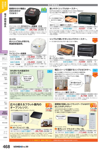 銘柄炊き分け機能とお好み炊きができます!電子調理器具使いやすくシンプルなトースター。「はずせるもち焼きネット(焼き網)」や「スライド式くず受皿」などちょっとした使いやすい機能付きトースターです。トースト2枚焼きできる!広びろワイド庫内![アイリスオーヤマ]圧力IHジャー炊飯器10合商品種別型式/RC-PD10-Bお申込番号M価税抜税抜価格8-617-2856オープン¥26,720¥29,392税込価格単位1台●寸法/305(幅)×360(奥)×265(高)mm●質量/8.1kg●コード長さ/約1.0m●電源/AC100V(50/60Hz共用)●消費電力/1425W●付属品/しゃもじ、計量カップ(白米用、無洗米用)●包装数:1/2ふっくらおいしいごはんが炊ける、黒遠赤厚釜採用。[タイガー]マイコンジャー炊飯器お申込番号8-617-2575M価税抜オープン商品種別5.5合炊き税抜価格¥12,800税込価格¥14,080単位1台寸法/252幅)×349(奥)×215(高)mm、質量/3kg、型式/JBH-G101W8-617-25761升炊き商品種別オープン¥15,000¥16,5001台寸法/280幅)×385(奥)×251(高)mm、質量/3.9kg、型式/JBH-G181W●コード長さ/1.2m●付属品/しゃもじ、しゃもじ受け、計量カップ●包装数:1/2氷も砕ける大型波刃のミキサーです!A4サイズの高さに収納できます。使用例[テスコム]ミキサー商品種別型式/TMX-20Aお申込番号M価税抜税抜価格8-617-2864オープン¥10,000¥11,000税込価格●寸法/150(幅)×180奥)×340高)mm●コード長さ/1m●質量/2.4kg●材質/本体:ABS、ボトル:ガラス●電源/AC100V50/60Hz●消費電力/190W●定格時間/15分(4分動作・2分休止の繰り返し使用で合計15分まで)●ミキサーボトル容量/1000mL●包装数:1/5※耐熱ガラスではありません。[象印マホービン]象印トースター商品種別型式/EQ-AB22-NMお申込番号8-613-4601使用例M価税抜オープン税抜価格¥6,537税込価格¥7,190単位1台●寸法/約385(幅)×270(奥)×230(高)mm●庫内寸法/260(幅)×220(奥)×105(高)mm●質量/約3.9kg●材質/塗装鋼板、メッキ鋼板、フェノール、鋼板、強化ガラス、ニッケルクロムメッキ処理(ラス網)●消費電力/1000W●15分タイマー●付属品/はずせるもち焼きネット(焼き網)、スライド式くず受皿●包装数:1シンプルで使いやすいコンパクトトースター。トースト2枚や20cmのピザが一度に入るワイド庫内。[タイガー]オーブントースター使用例商品種別型式/KAK-H102お申込番号8-613-4604M価税抜オープン税抜価格¥5,920税込価格¥6,512単位1台●寸法/312(幅)×267(奥)×224(高)mm●庫内寸法/260(幅)×210奥)×85(高)mm●質量/2.7kg●材質/本体・調理トレイ:鋼板、タイマーツマミ:PBT、トッテ:PF●消費電力/1000W●15分タイマー●包装数:1/41L単位1台幅広いシーンで活躍するシンプルなミキサー。●1Lの大容量サイズながらも1人分の食材から調理可能。●象印独自のクラッシュ&カットチタンコートブレード採用。●着脱が簡単でスムーズなダブルロック構造。●隅々まで洗える分解構造。1L落ち着きのあるグレージュカラー。使用例[象印マホービン]象印ミキサー商品種別型式/BM-SA10-HCお申込番号M価税抜8-613-4602オープン税抜価格¥8,768税込価格¥9,644単位1台●寸法/約150(幅)×150奥)×365(高)mm●質量/1.9kg●材質/ポリプロピレン、POM、コポリエステル樹脂、ABS、SUS301(チタンコート)●包装数:1広々と使えるフラット庫内のオーブンレンジ。汚れても掃除しやすいフラットテーブルです。調理物が回転しないフラットテーブルなので出し入れがしやすい!沖縄・離島はサービス対象外大きなお弁当も温められる電子レンジです。飲み物、ごはん、自動調理をタッチするだけで、美味しさを逃がさず加熱ができます。沖縄・離島はサービス対象外使用例庫内のお掃除もラクラク![アイリスオーヤマ]オーブンレンジ18L商品種別型式/MO-F1809-CWお申込番号M価税抜税抜価格8-617-2857オープン¥26,720¥29,392税込価格単位1台●寸法/470(幅)×360(奥)×294(高)mm●質量/15kg●電源/AC100V●消費電力/900W/1250W(レンジ)、930W(グリル・オーブン)●コード長さ/約1.4m●庫内総容量/約18L●加熱室有効寸法/280(幅)×292(奥)×180(高)mm●付属品/角網、角皿●包装数:1[アイリスオーヤマ]電子レンジフラットテーブル18L商品種別型式/IMB-F186-Wお申込番号M価税抜税抜価格8-617-2907オープン¥17,440¥19,184税込価格単位1台●寸法/456(幅)×352(奥)×280高)mm●質量/11.7kg●電源/AC100V●定格消費電力/950W/1300W●庫内総容量/約18L●加熱室有効寸法/315(幅)×325(奥)×180(高)mm●コード長さ/約1.5m●包装数:1家庭科・学校給食電子調理器具学習支援用品理科発表ボード・発表ボード・ホワイトボードタイマータイマー黒板関連黒板関連用品用品SDGs・SDG総合的な学習国語・国語書写書写外国語外国語社会社会算数・算数数学数学音楽音楽図工・図工美術美術技術技術家庭科・学校給食保健体育・球技球技特別支援特別支道徳道徳カードカゲーム図書室図書室※メーカー直送品です。返品はご容赦ください。上記商品は受注日から7営業日以内のお届けになります。468Vol.20