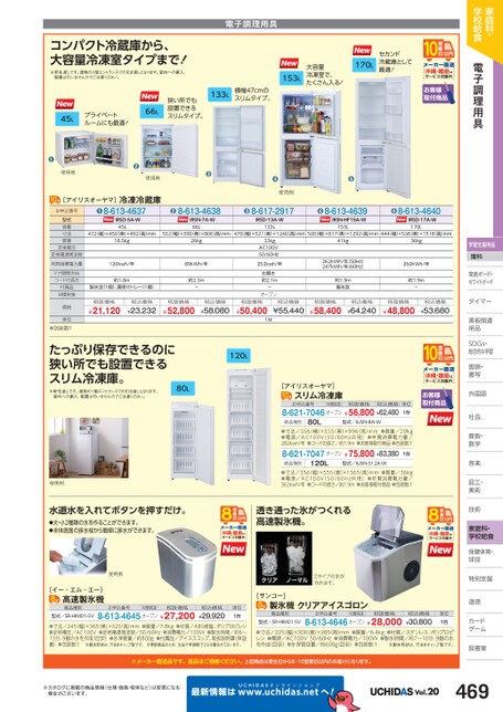家庭科・学校給食電子調理用具学習支援用品理科発表ボード・発表ボード・ホワイトボードトタイマータイマー黒板関連黒板関連用品用品SDGs・DGs・総合的な学習習国語・語・書写写外国語国社会社会算数・数・数学学音楽楽図工・工・美術術技術術家庭科・学校給食保健体育・体球技技特別支援別道徳徳カードゲームム図書室書電子調理用具コンパクト冷蔵庫から、大容量冷凍室タイプまで!※軒先渡しです。建物の1階エントランスでの引き渡しとなります。室内への搬入、配置は行いませんのでご注意ください。133L横幅47cmのスリムタイプ。66L狭い所でも設置できるスリムタイプ。45Lプライベートルームにも最適!153L大容量冷凍室で、たくさん入る!170Lセカンド冷蔵庫として最適!沖縄・離島はサービス対象外●使用例●使用例●[アイリスオーヤマ]冷凍冷蔵庫●使用例●お申込番号●8-613-4637IRSD-5A-W●8-613-4638●8-617-2917●8-613-4639●8-613-4640IRSN-7A-WIRSD-13A-WIRSN-HF15A-WIRSD-17A-W472幅)×450(奥)×492(高)mm552幅)×390奥)×800(高)mm470幅)×521奥)×1240(高)mm500幅)×617(奥)×1292高)mm444(幅)×536(奥)×1518高)mm45L18.5kg年間消費電力量120kwh/年約1.8m製氷皿(1個)、露受けトレー(1個)型式容量寸法質量定格電圧定格電源周波数ドア開閉方向コードの長さ付属品M価税抜価格単位●包装数:166L26kg89kWh/年約2.3m-税抜価格¥21,120税込価格¥23,232税抜価格¥52,800税込価格¥58,080税抜価格¥50,400税込価格¥55,440133L33kgAC100V50/60Hz252kwh/年右開き約2.1m-オープン1台153L41kg170L36kg262kWh/年(50Hz)247kWh/年(60Hz)約1.9m製氷皿260kWh/年約1.9m-税抜価格¥58,400税込価格¥64,240税抜価格¥48,800税込価格¥53,680たっぷり保存できるのに狭い所でも設置できるスリム冷凍庫。※軒先渡しです。建物の1階エントランスでの引き渡しとなります。室内への搬入、配置は行いませんのでご注意ください。80L120L[アイリスオーヤマ]スリム冷凍庫お申込番号M価税抜税抜価格税込価格8-621-7046オープン¥56,800¥62,480商品種別80L型式/IUSN-8A-W沖縄・離島はサービス対象外単位1台●寸法/356(幅)×555(奥)×996(高)mm●質量/29kg●電源/AC100V(50/60Hz共用)●年間消費電力量/282kwh/年●コードの長さ/約1.9m●お客様取付商品●包装数:18-621-7047オープン¥75,800¥83,3801台商品種別120L型式/IUSN-S12A-W使用例●寸法/356(幅)×555(奥)×1365(高)mm●質量/36kg●電源/AC100V(50/60Hz共用)●年間消費電力量/362kwh/年●コードの長さ/約1.9m●お客様取付商品●包装数:1水道水を入れてボタンを押すだけ。●大・小2種類の氷を作ることができます。●本体底面の排水栓から簡単に排水ができます。透き通った氷がつくれる高速製氷機。沖縄・離島はサービス対象外沖縄・離島はサービス対象外使用例2タイプの氷が作れます。[イー・エム・エー]高速製氷機商品種別型式/SR-HIM01-SVお申込番号M価税抜税抜価格8-613-4645オープン¥27,200¥29,920税込価格単位1台●寸法/245幅)×365(奥)×325(高)mm●質量/7.8kg●材質/ABS樹脂、ポリプロピレン●定格電圧/AC100V●定格電源周波数/50/60Hz●消費電力/120W●製氷時間/約6〜13分、9個の氷を作成(目安)●氷保管量/約800g●付属品/アイススコップ、取扱説明書(保証書)●包装数:1※季節商品のため、欠品や早期終了となる場合がございます。※製氷形状は、穴あきキャップ型です。[サンコー]製氷機クリアアイスゴロン商品種別型式/SR-HIM01-SVお申込番号M価税抜税抜価格8-613-4646オープン¥28,000¥30,800税込価格単位1台●寸法/225幅)×300奥)×285(高)mm●質量/6.4kg●材質/ステンレス、ポリプロピレン●電源/AC100V50/60Hz●消費電力/100W●製氷時間/約7〜10分、9個の氷を作成(目安)●氷保管容量/約600g目安)●包装数:1※製氷形状は、穴あきキャップ型です。※メーカー直送品です。返品はご容赦ください。上記商品は受注日から8・10営業日以内のお届けになります。※カタログに掲載の商品情報(仕様・価格・税率など)は変更になる場合がございます。最新情報はUCHIDASww.uchidas.netwへ!Vol.20469