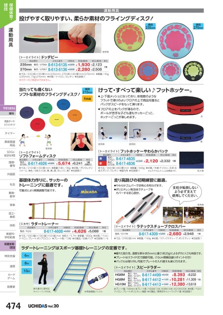 投げやすく取りやすい、柔らか素材のフライングディスク!直径235mm直径270mm運動用具使用例[トーエイライト]ドッヂビー商品種別お申込番号M価税抜税抜価格税込価格単位型式/U7066235mm270mm●寸法/235(径)×30(厚)mm(235mm)、270(径)×40厚)mm(270mm)●質量/45g8-613-6135¥2,200¥1,930¥2,1238-613-6136¥2,600¥2,280¥2,508型式/U70671枚(235mm)、75g(270mm)●材質/ナイロン、ウレタン●包装数:1※カラーのご指定はできません。当たっても痛くないソフトな素材のフライングディスク!直径210mm6色組けって・すべって楽しい♪フットホッケー。●上・下面メッシュになっており、体育館のようなフラットで滑りのよいフロアの上で商品を蹴るとパックがスピードをもって滑ります。●フロアの上をパックが滑るので、ボールが苦手な子ども達もサッカーごっこ、ホッケーごっこが楽しめます。使用例使用例使用例[トーエイライト]ソフトフォームディスク商品種別型式/B7995お申込番号M価税抜8-617-4926¥6,000税抜価格¥5,674税込価格¥6,241(6枚入)●寸法/210(径)×30(厚)mm●質量(1枚)/90g●材質/ポリウレタンフォーム●色/6枚入り(赤、青、黄、緑、オレンジ、紫)●包装数:1単位1組[トーエイライト]フットホッケーやわらかパック商品種別お申込番号M価税抜税抜価格税込価格単位型式/U7021型式/U70368-617-48358-617-4836青赤●寸法/300径)×80(厚)mm●質量/400g●材質/外被:ナイロン、芯材:合成スポンジ、ウレタン●屋内用●包装数:1※上下ナイロンメッシュは消耗品です。¥2,500¥2,120¥2,3321個赤青拡大図基礎体力作りに、サッカーのトレーニングに最適です。可動式により間隔調整可能です。走り高跳びの初期練習に最適。●やわらかゴムバーで恐怖心を和らげます。●ポリエチレン発泡体でチューブをカバーする安心設計。支柱が転倒しないよう必ず支えて使用してください。[ミカサ]ラダートレーナー商品種別型式/FLD2お申込番号M価税抜8-617-4608¥6,000税抜価格¥4,626税込価格¥5,088単位1個●寸法/500(幅)×100(奥)×50(高)mm●長さ/5.7m●質量/800g●材質/ベルト:ナイロン、プレート:ポリプロピレン●プレート数/13枚●付属品/収納バッグ●包装数:1/6[トーエイライト]ラテックスチューブクロスバー商品種別型式/G1194お申込番号M価税抜8-617-4309¥3,200税抜価格¥2,680税込価格¥2,948使用例単位1本●寸法/2700(長)mm●質量/140g●材質/ラテックスチューブ、ポリエチレン●包装数:1ラダートレーニングはスポーツ基礎トレーニングの定番です。6m8m10m持ち運びに便利なキャリーバッグ付き。※両端樹脂バックル●優れた耐久性。適度な厚み(約5mm)と重さ(約20g)によるずれにくさも特長です。●プレートはスライド式で調節可能。(10cm間隔目盛りポイント付き)●バックルは取り外し可能でプレートの入れ替えも楽に行えます。[トーエイライト]スピードラダーM価税抜商品種別税抜価格お申込番号税込価格8-617-4499¥9,400¥9,2328-617-4412¥11,500¥10,281¥11,3098-617-4413¥13,900¥12,380¥13,618HG6MHG8MHG10M●プレート幅/500mm●プレート数/HG6M:12本、HG8M:16本、HG10M:20本●材質/ベルト:ナイロン、プレート:ポリエチレン樹脂●付属品/携帯用キャリーバッグ×1個●包装数:1長さ/6m、型式/G1371長さ/8m、型式/G1372長さ/10m、型式/G1373¥8.393単位1台保健体育・運動用具球技学習支援用品理科発表ボード・発表ボード・ホワイトボードタイマータイマー黒板関連黒板関連用品用品SDGs・SDG総合的な学習国語・国語書写書写外国語外国語社会社会算数・算数数学数学音楽音楽図工・図工美術美術技術技術家庭科・家庭科・学校給食学校給食保健体育・球技特別支援特別支道徳道徳カードカゲーム図書室図書室474Vol.20