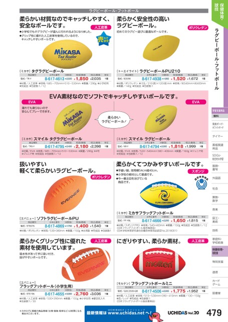 保健体育・球技ラグビーボール・フットボール学習支援用品理科発表ボード・発表ボード・ホワイトボードトタイマータイマー黒板関連黒板関連用品用品SDGs・DGs・総合的な学習習国語・語・書写写外国語国社会社会算数・数・数学学音楽楽図工・工・美術術技術術家庭科・家庭科・学校給食校食保健体育・球技特別支援別道徳徳カードゲームム図書室書[エバニュー]フラッグフットボール(小学生用)商品種別型式/ETE196お申込番号M価税抜8-617-4655¥3,300税抜価格¥2,760税込価格¥3,036単位1個●材質/人工皮革●球周/530×390mm●質量/155g●小学生用●要空気入れ●包装数:1/30※カタログに掲載の商品情報(仕様・価格・税率など)は変更になる場合がございます。最新情報は[モルテン]フラッグフットボールミニ商品種別型式/Q3C2500-QBお申込番号M価税抜8-617-4506¥2,000税抜価格¥1,775税込価格¥1,952単位1個●材質/人工皮革●球周/510〜530mm×390〜410mm●質量/130〜150g●色/レッド●完成品●包装数:1〈日本フラッグフットボール協会推奨品〉UCHIDASww.uchidas.netwへ!Vol.20479ラグビーボール・フットボール柔らかい材質なのでキャッチしやすく、安全なボールです。人工皮革●小学校でもタグラグビーが盛んに行われるようになりました。●グリップ性に優れた人工皮革を使用しているので、キャッチしやすいボールです。[ミカサ]タグラグビーボール商品種別型式/TR-Yお申込番号M価税抜8-617-4613¥2,500税抜価格¥1,850税込価格¥2,035単位1個柔らかく安全性の高いラグビーボール。初めてのラグビー遊びに最適なボールです。ポリウレタン[トーエイライト]ラグビーボールPU210商品種別型式/B3598お申込番号M価税抜8-617-4938¥1,900税抜価格¥1,520税込価格¥1,672単位1個●材質/人工皮革●球周/685〜705mm×510〜530mm●質量/290g●小学校用●完成品●包装数:1/12●材質/ポリウレタン●寸法/210(長)×120(径)mm●球周/約540mm×約400mm●質量/140g●完成品●包装数:1EVA素材なのでソフトでキャッチしやすいボールです。EVAEVA濡れても滑らないので安心してプレーできます。柔らかいラグビーボール![ミカサ]スマイルタグラグビーボール商品種別お申込番号型式/TRS-Y税込価格¥2,398●材質/EVA●球周/685〜705mm×510〜530mm●質量/290g●4号●ジュニア用●完成品●包装数:1/128-617-4795¥2,400¥2,180税抜価格M価税抜単位1個扱いやすい軽くて柔らかいラグビーボール。ポリウレタン[エバニュー]ソフトラグビーボールPU商品種別型式/ETE076お申込番号M価税抜8-617-4869¥1,750税抜価格¥1,400税込価格¥1,540単位1個●材質/ポリウレタン●球周/530×380mm●質量/150g●台湾製●完成品●包装数:1[ミカサ]スマイルラグビーボール商品種別型式/KR-Yお申込番号M価税抜8-617-4794¥2,000税抜価格¥1,818税込価格¥1,999単位1個●材質/EVA●球周/520〜540mm×380〜400mm●質量/160g●ジュニア用●完成品●包装数:1/12柔らかくてつかみやすいボールです。●手縫い製。球周横54cm縦40cm。●小学校の教材として最適です。●今一番注目を浴びている商品です。[ミカサ]ミカサフラッグフットボール商品種別型式/FF-YBLお申込番号M価税抜8-617-4666¥2,200税抜価格¥1,650●材質/スポンジ(TPE)●球周/540×400mm●質量/150g●完成品●包装数:1/12〈日本フラッグフットボール協会推奨品〉〈日本学校体育研究連合会優良体育用品認定No.2018001〉スポンジ税込価格¥1,815単位1個柔らかくグリップ性に優れた素材を使用しています。吸水性があって手に吸い付き、投げやすいボールです。人工皮革にぎりやすい、柔らか素材。人工皮革